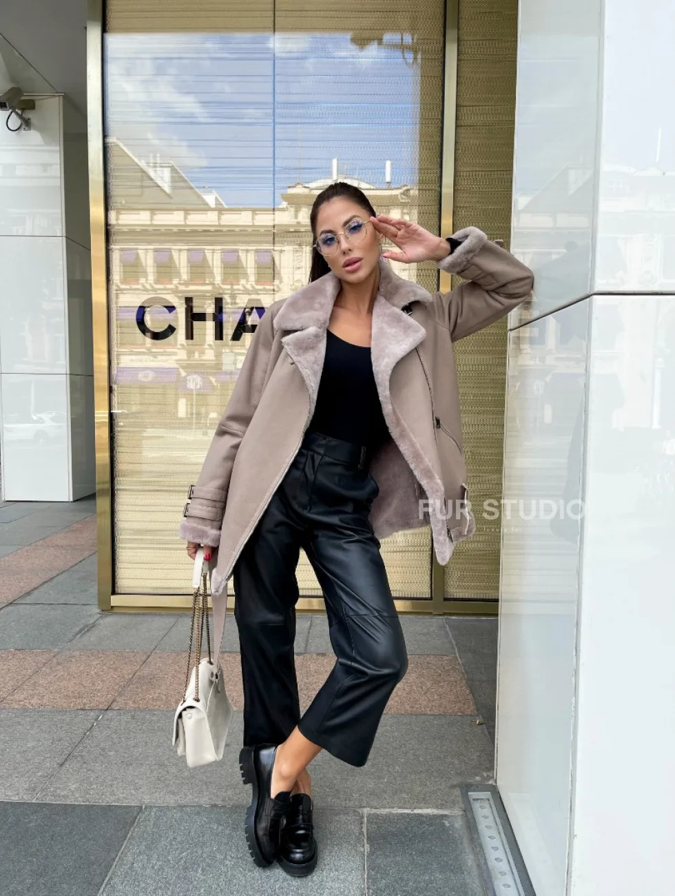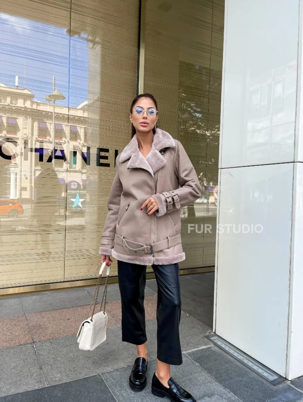 Удобные карманы позаботятся о тепле ручек в непогоду. Прямой крой скрывает недостатки фигуры и зрительно удлиняет силуэт. Роскошный воротник позаботится о тепле шеи и подчеркнет ее изящество. Ремни на рукавах делают образ экстравагантным. Купить авиатор дубленку из натуральной овчины в бежевом оттенке могут современные девушки, которые любят выглядеть стильно в любое время года.