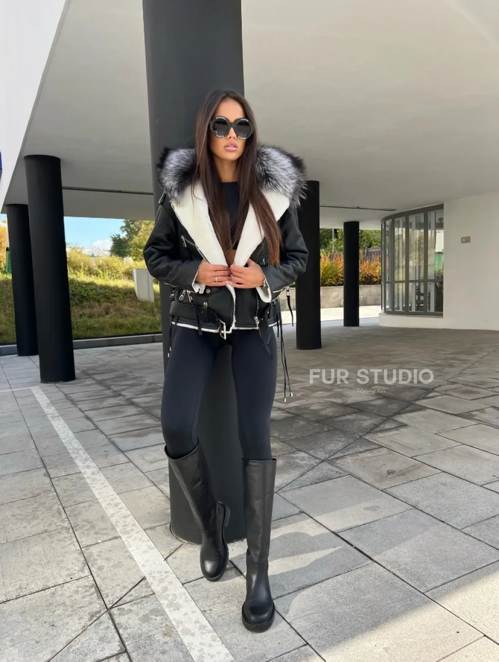 Авиатор из натуральной кожи с воротником из чернобурой лисы – выбор современных женщин. Модель авиатор – тренд последнего десятилетия. Мех стриженой овчины согреет владелицу в холодную погоду. Натуральная кожа приятна на ощупь и неприхотлива в уходе. Оригинальная шнуровка на спине делает образ экстравагантным и необычным. Роскошный воротник из меха чернобурой лисы подчеркивает изящность шеи.
