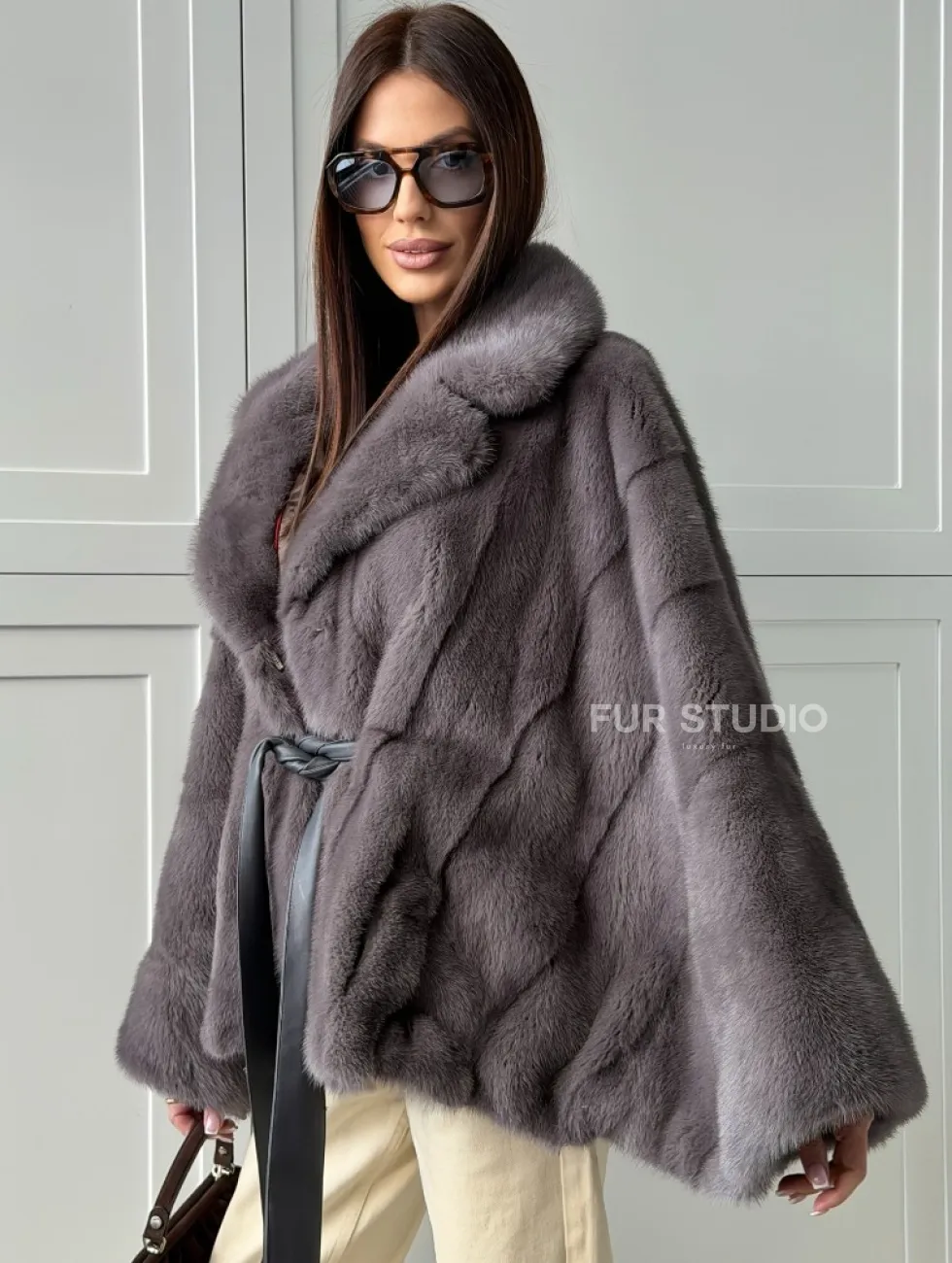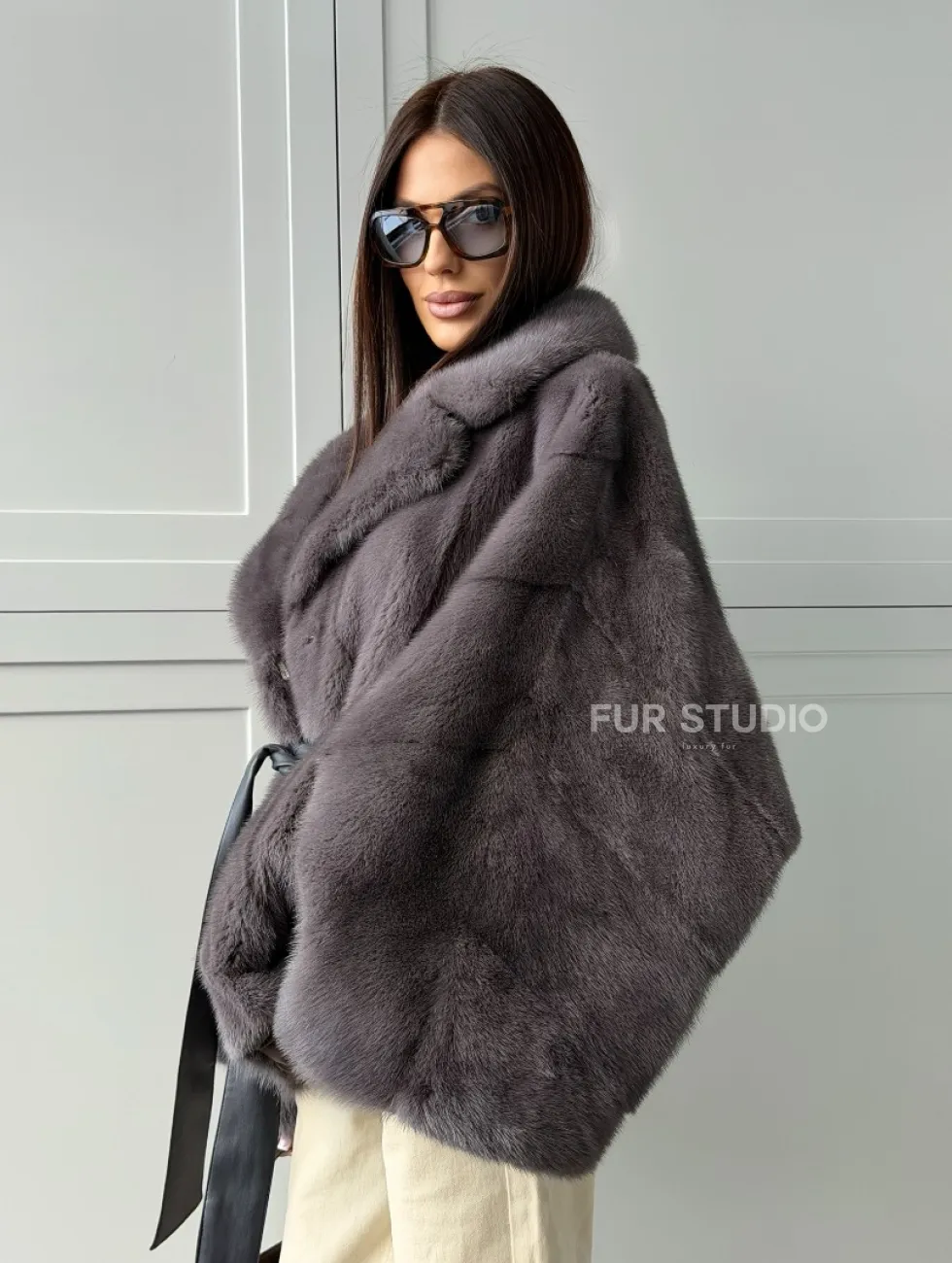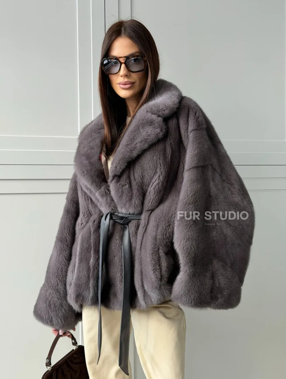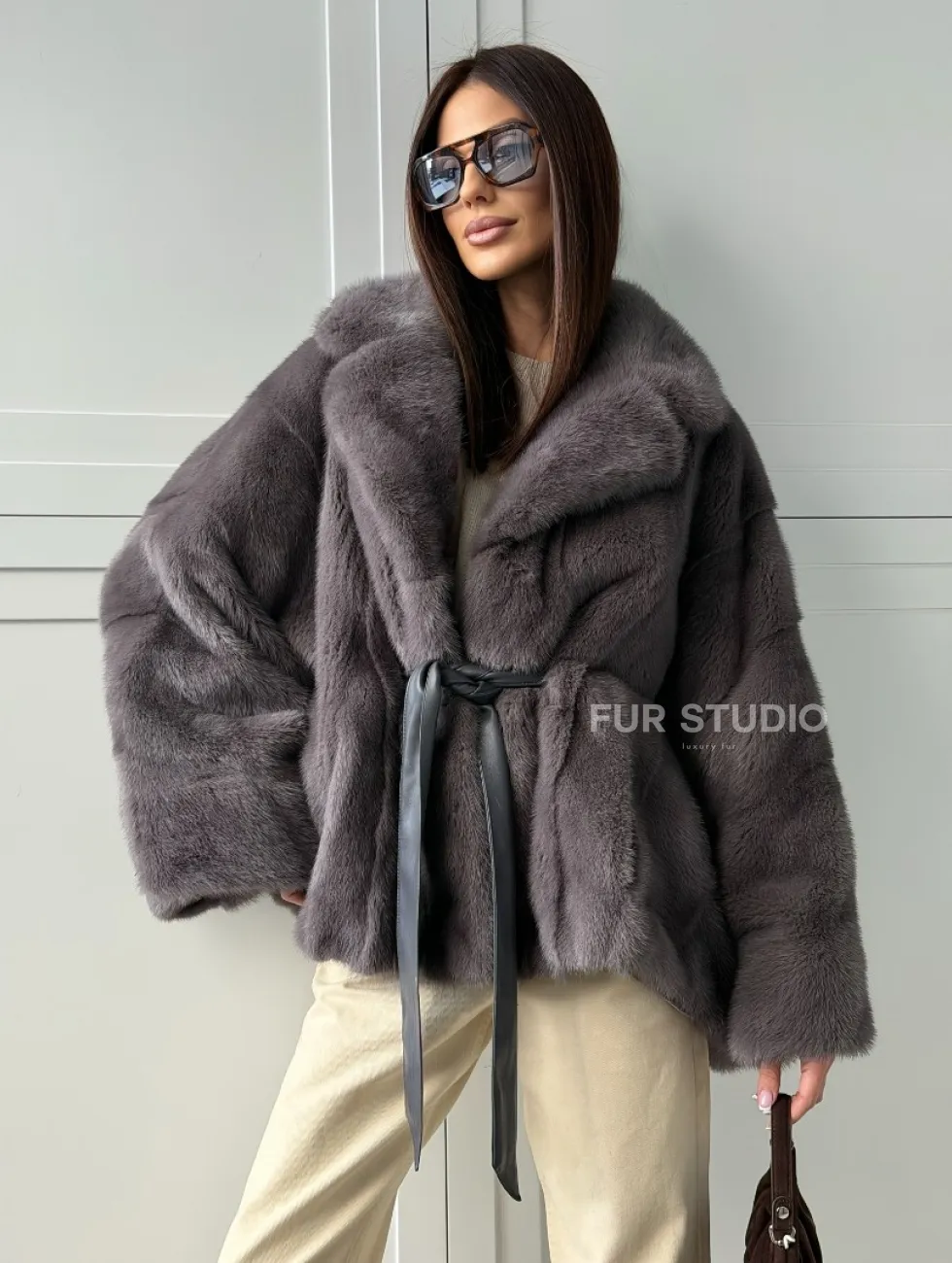 Мех данной шубы аукционная норка, цвет серый. Предлагается в размерах от 40 до 62 (oversize). Длина модели 60-65 см, что выгодно подчеркивает фигуру девушек. Эта модель идеально подойдет для девушек и женщин, предпочитающих роскошные натуральные меха.