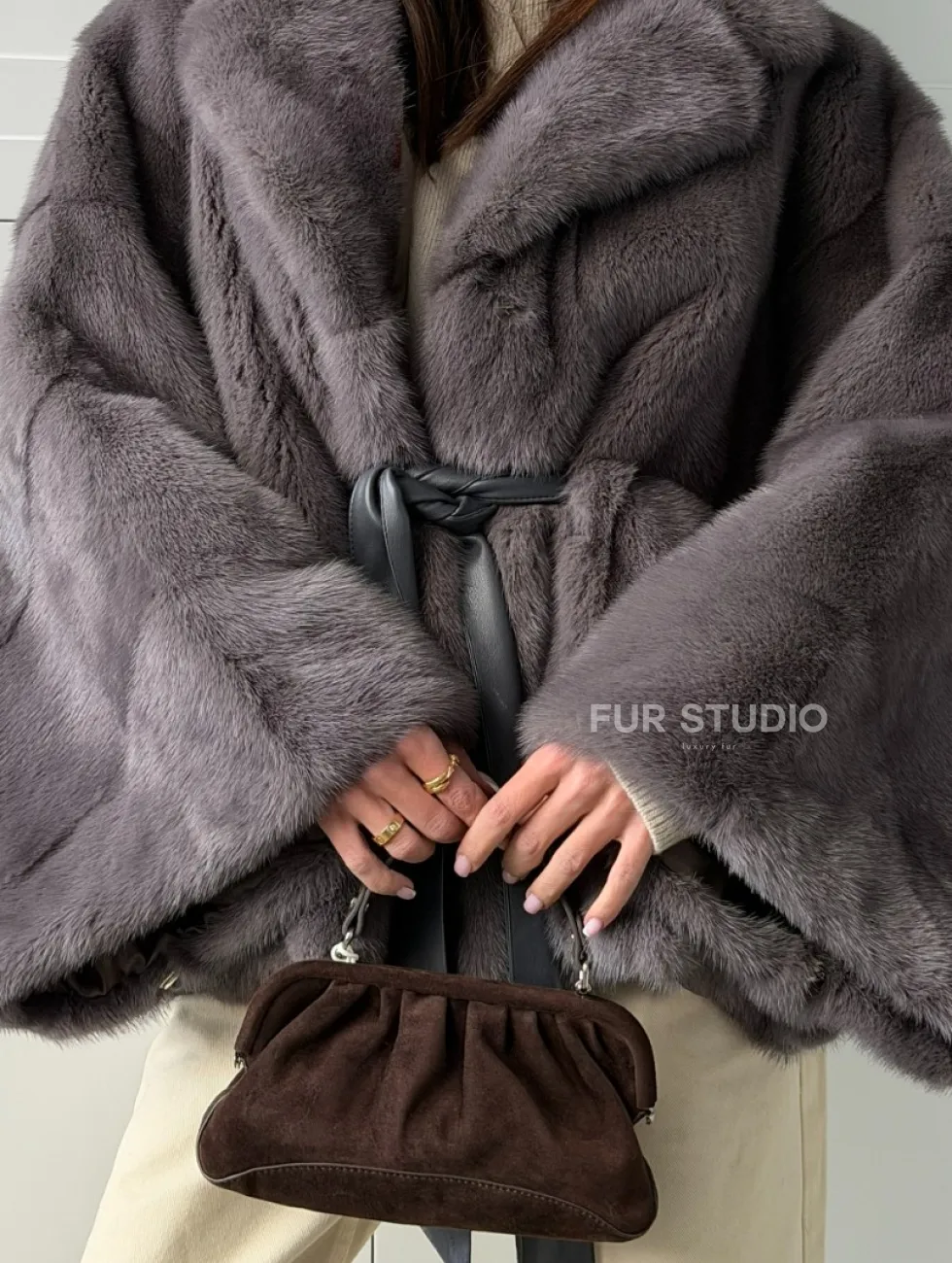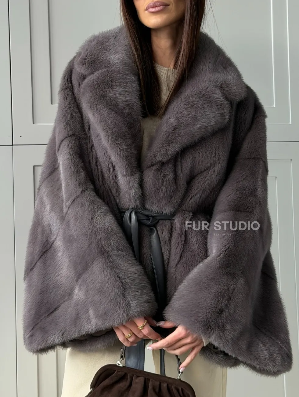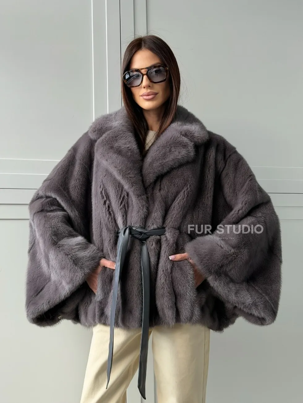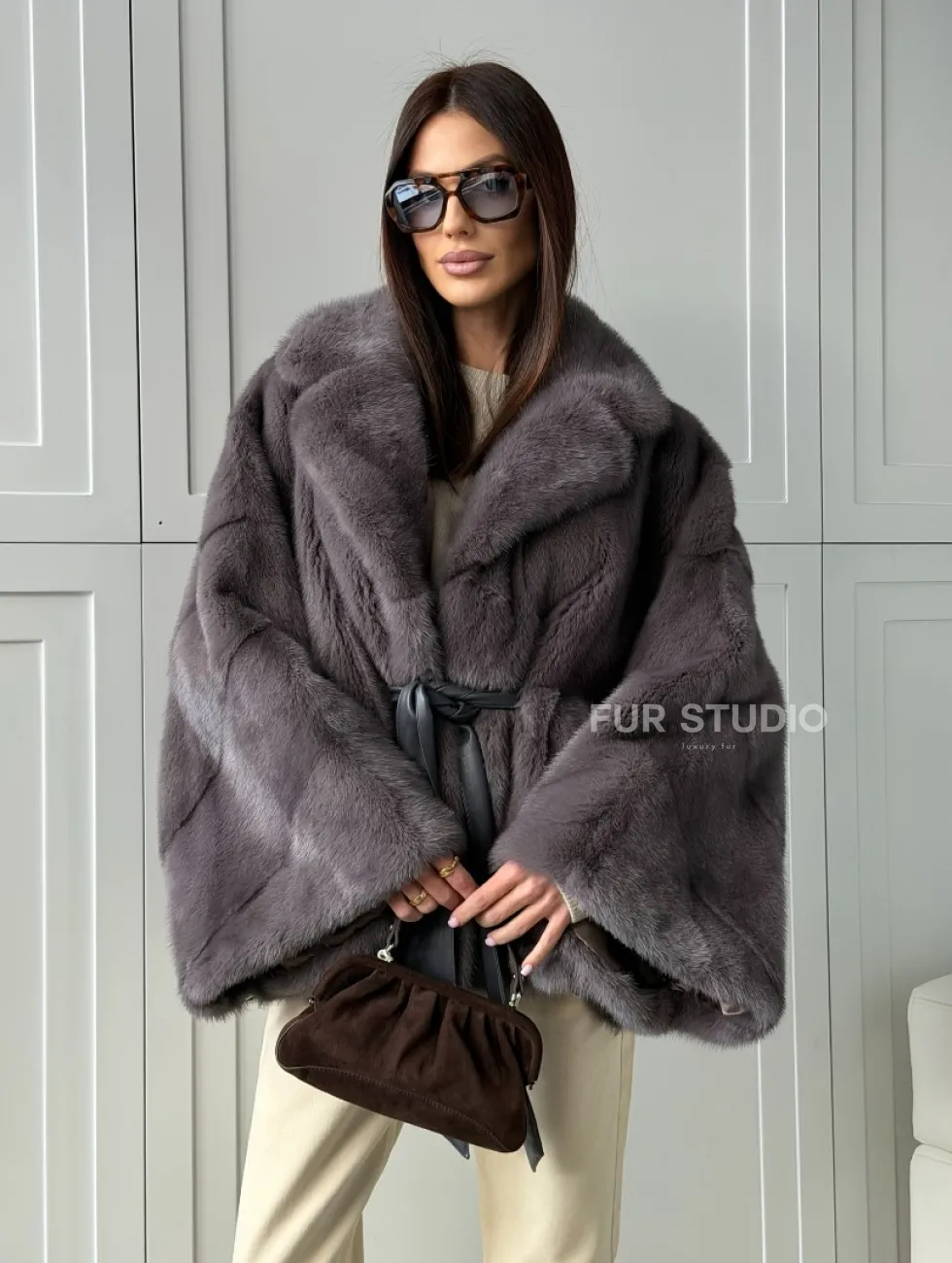 Мех данной шубы аукционная норка, цвет серый. Предлагается в размерах от 40 до 62 (oversize). Длина модели 60-65 см, что выгодно подчеркивает фигуру девушек. Эта модель идеально подойдет для девушек и женщин, предпочитающих роскошные натуральные меха.