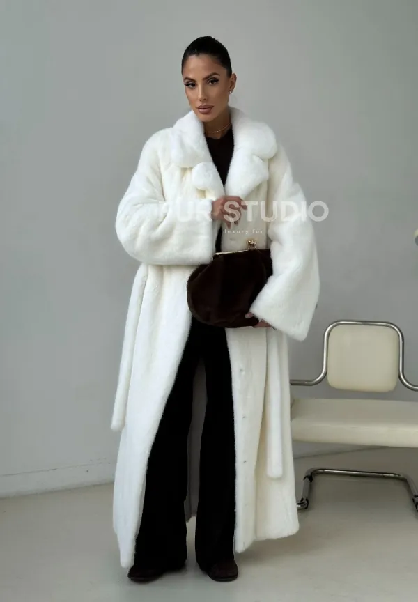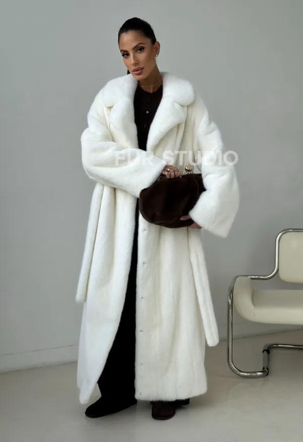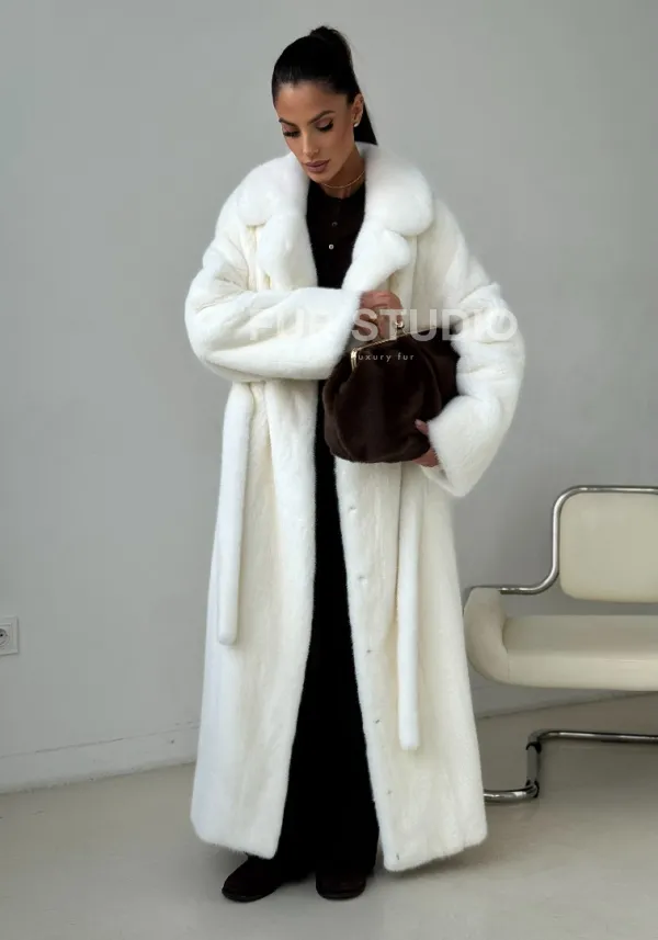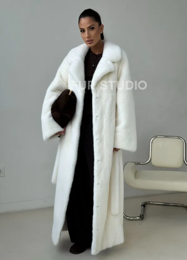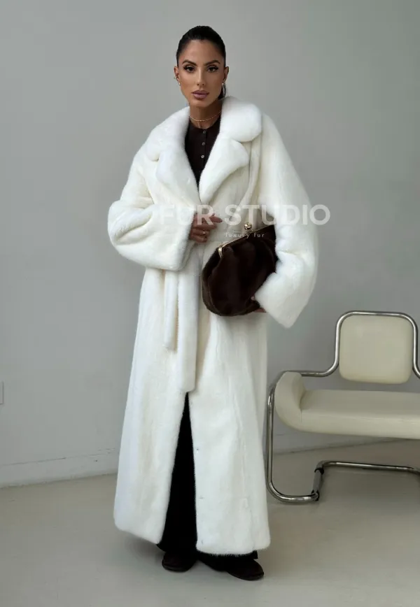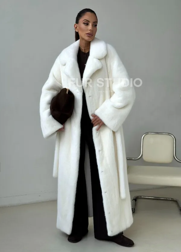 Мех данной шубы аукционная норка , цвет белый. Предлагается в размерах от 42 до 50. Длина модели 125-130 см, что выгодно подчеркивает фигуру девушек. Эта модель идеально подойдет для девушек и женщин, предпочитающих роскошные натуральные меха.