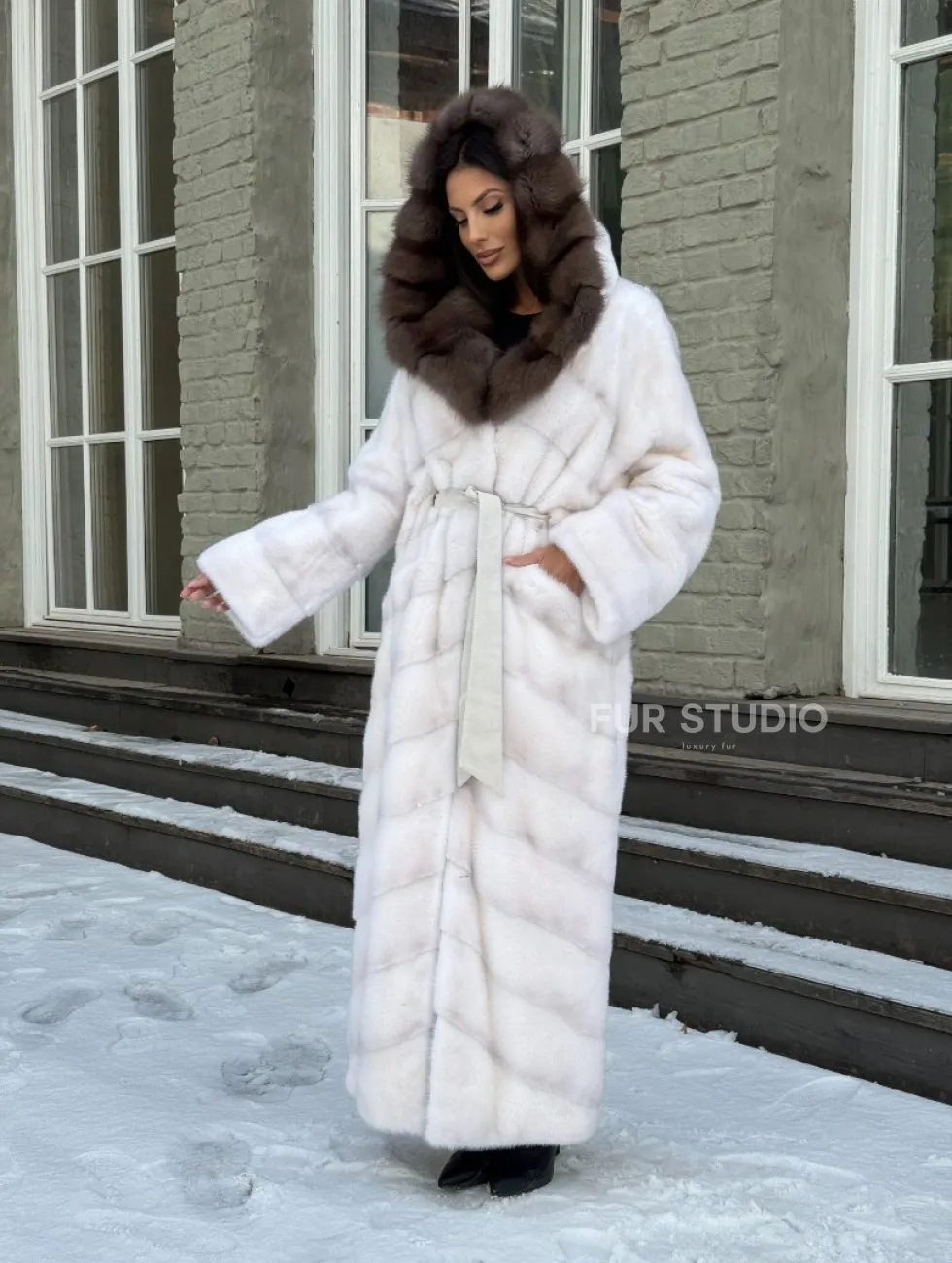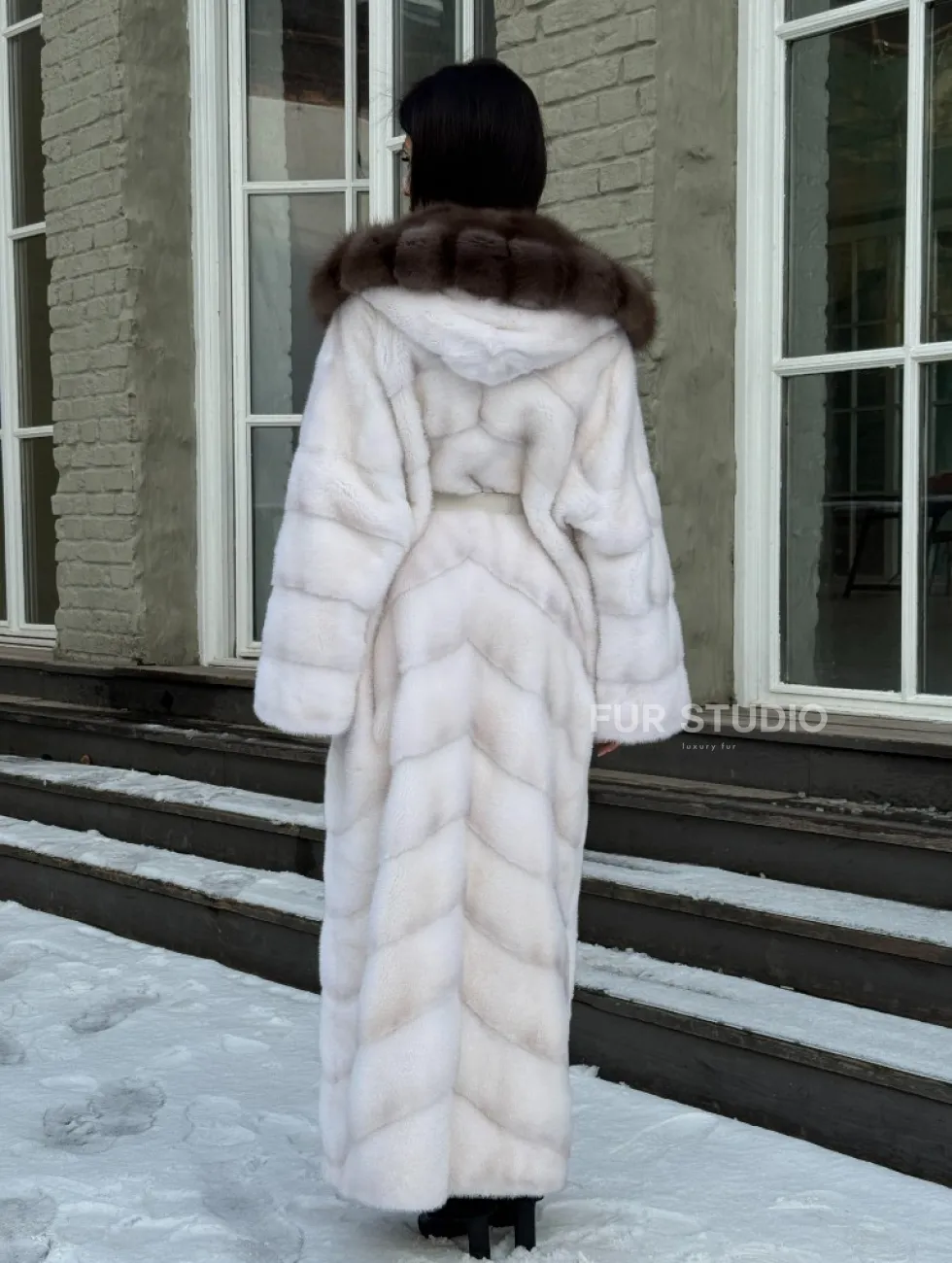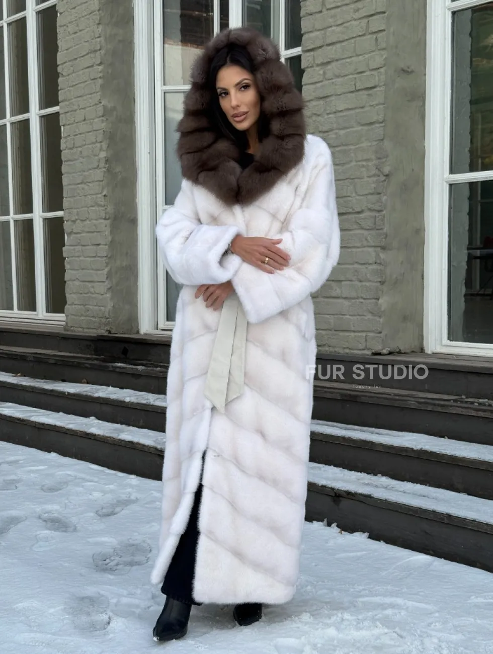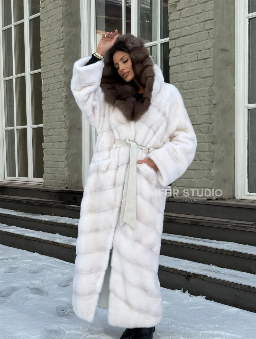 Белая длинная норковая шуба с капюшоном из натуральной куницы доступна для покупки в нашем шоуруме Furs Studio в Чите. У нас так же есть доставка во все города России. Добавьте немного роскоши в свой гардероб с этой шубой, которая будет служить вам многие годы.
