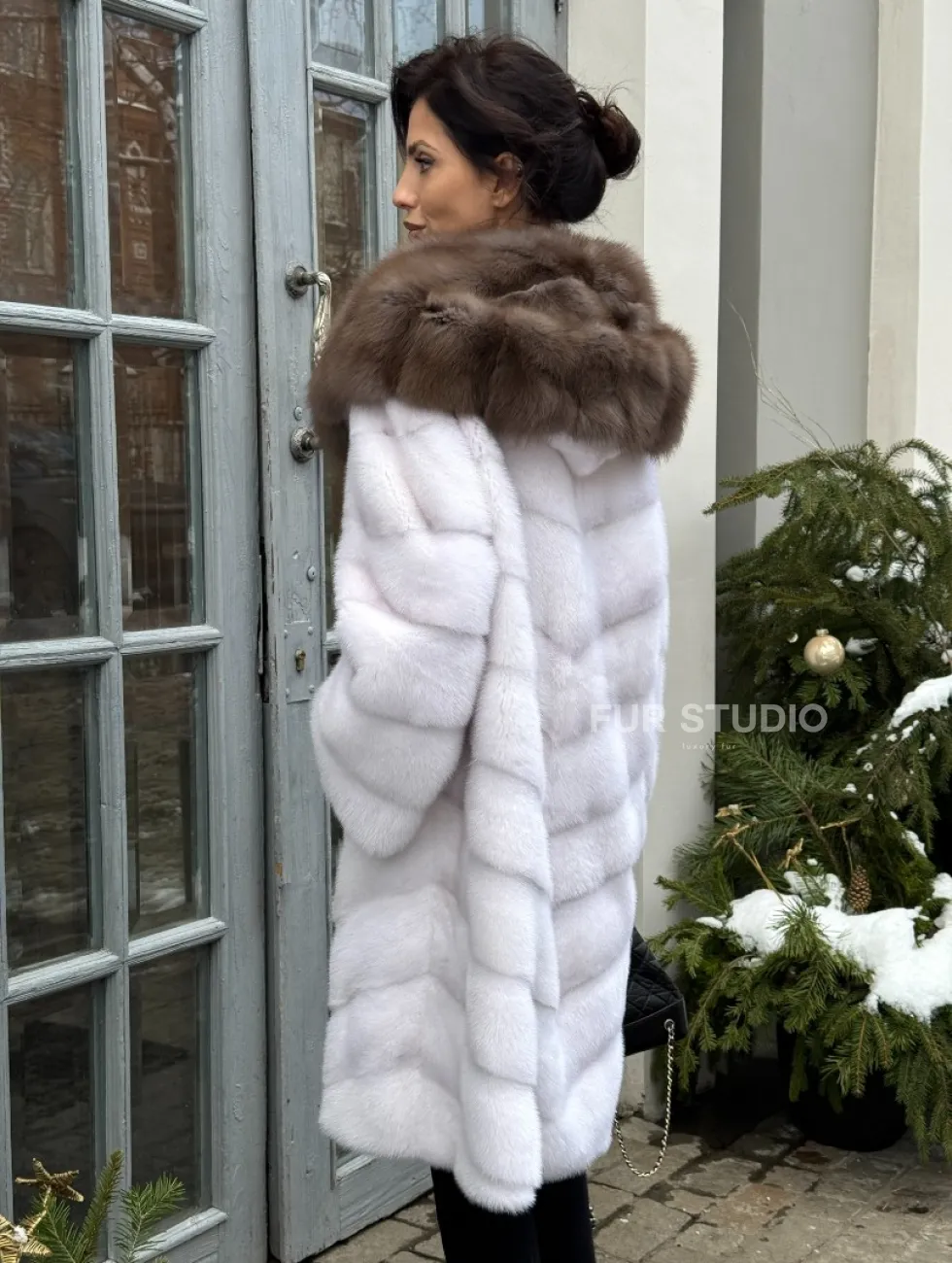 Белая прямая норковая шуба с капюшоном из меха куницы доступна для покупки в нашем шоуруме Furs Studio в Чите. У нас так же есть доставка во все города России. Добавьте немного роскоши в свой гардероб с этой шубой, которая будет служить вам многие годы.