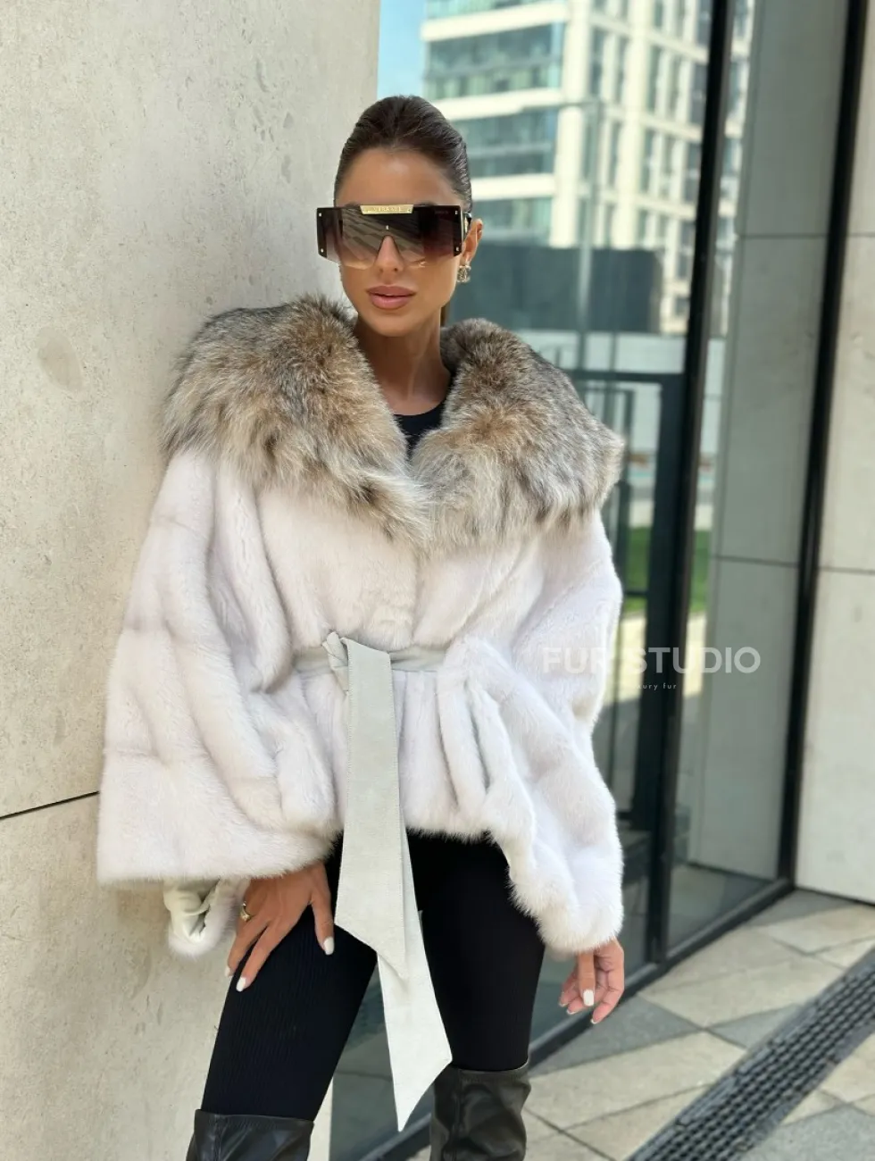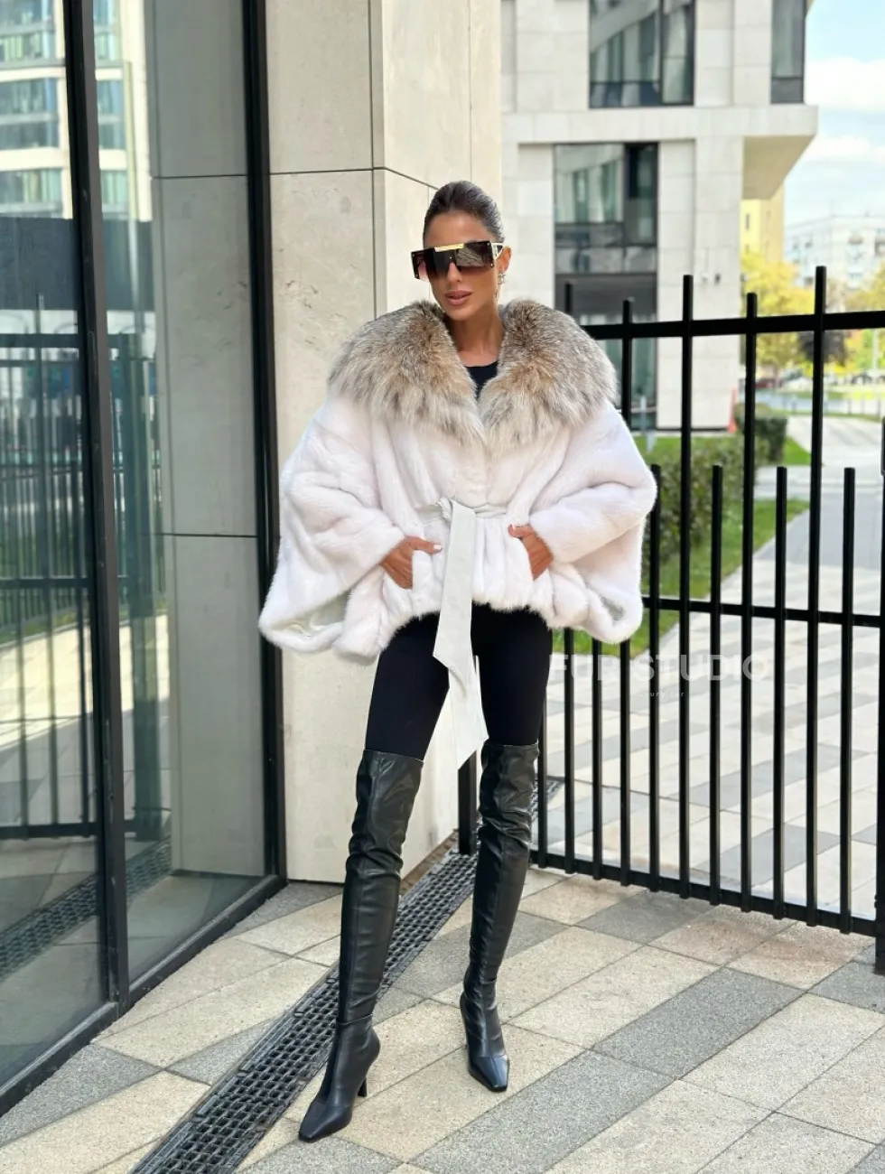Белое норковое манто с капюшоном из меха рыси – выбор девушек, которые готовы экспериментировать. Летучка сделает ваш образ легким и воздушным. Необычный цвет напомнит о лете и освежит ваш стиль. Нежный мех бережно согреет владелицу в любые холода. Шикарный капюшон из рыси позаботится, чтобы волосы были в тепле.