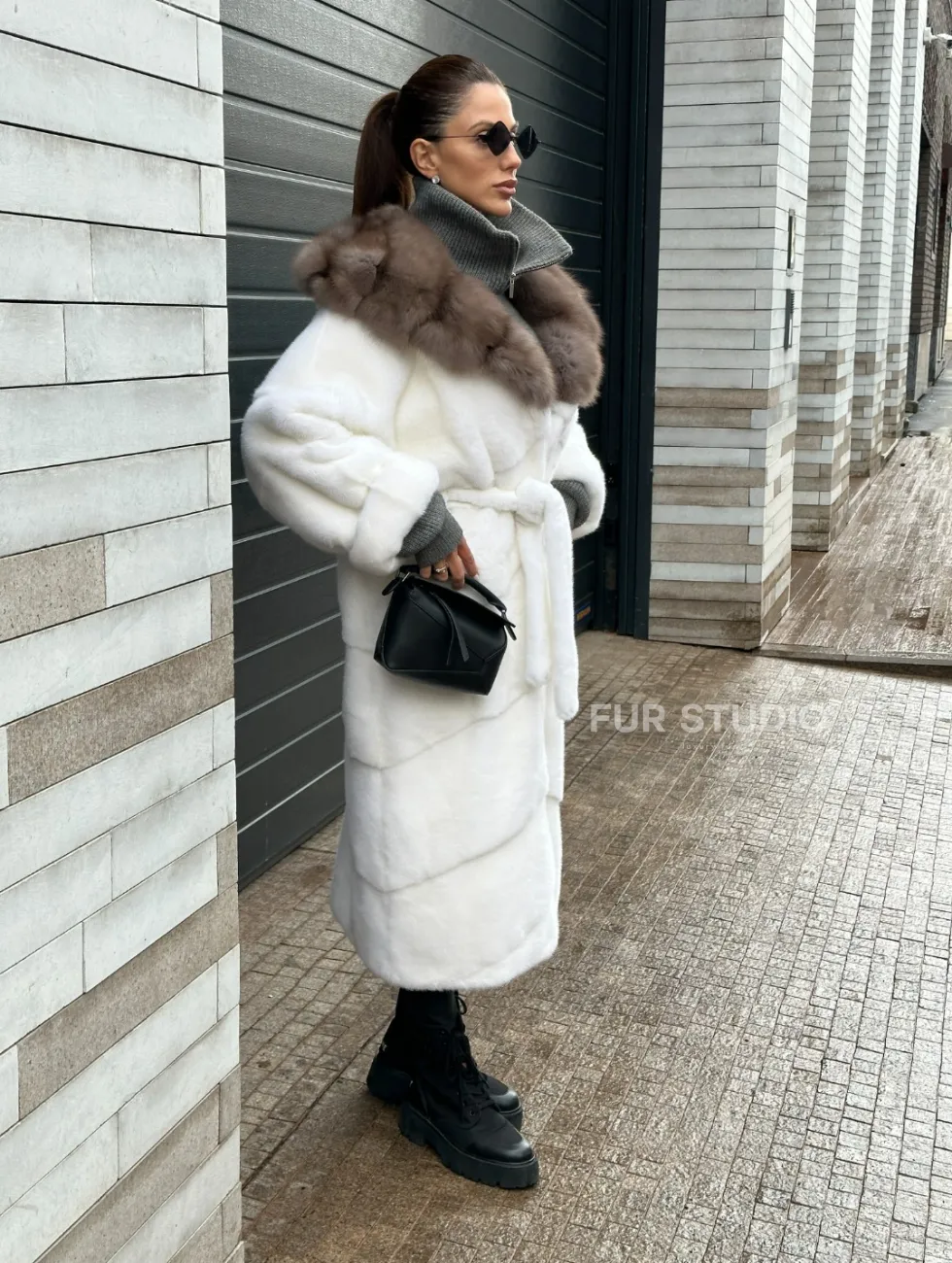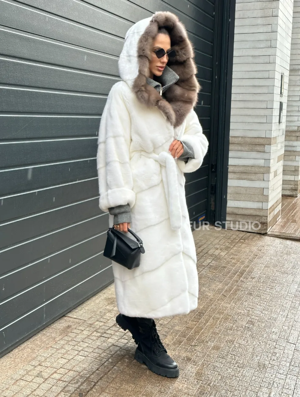 Белоснежная шуба из плюшевой норки VELVET с капюшоном из куницы доступна для покупки в нашем шоуруме Furs Studio в Чите. У нас так же есть доставка во все города России. Добавьте немного роскоши в свой гардероб с этой шубой, которая будет служить вам многие годы.