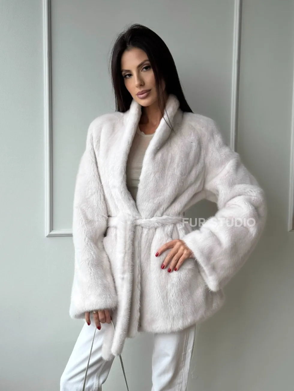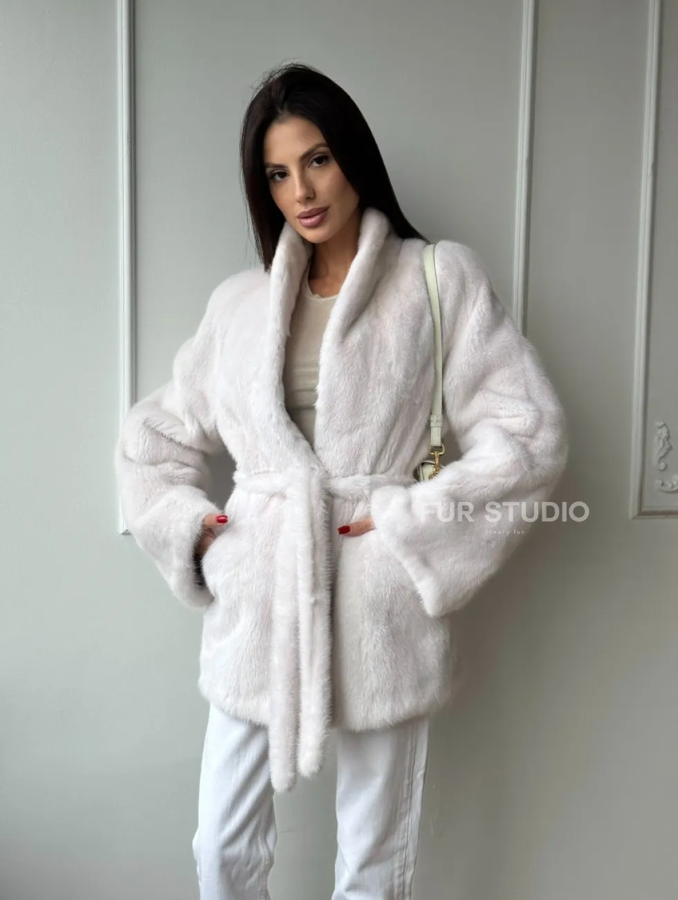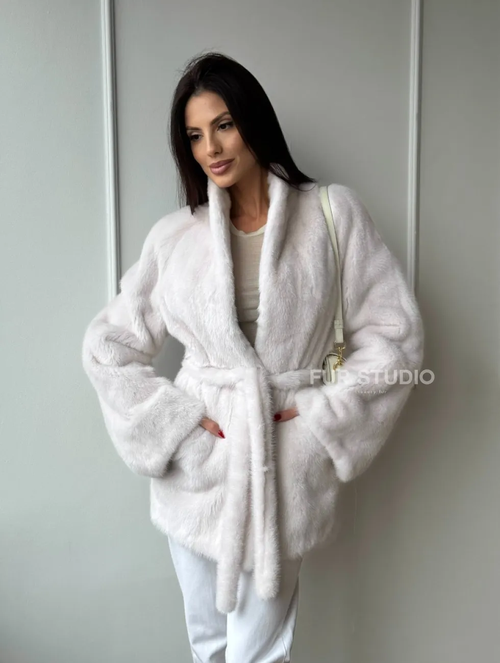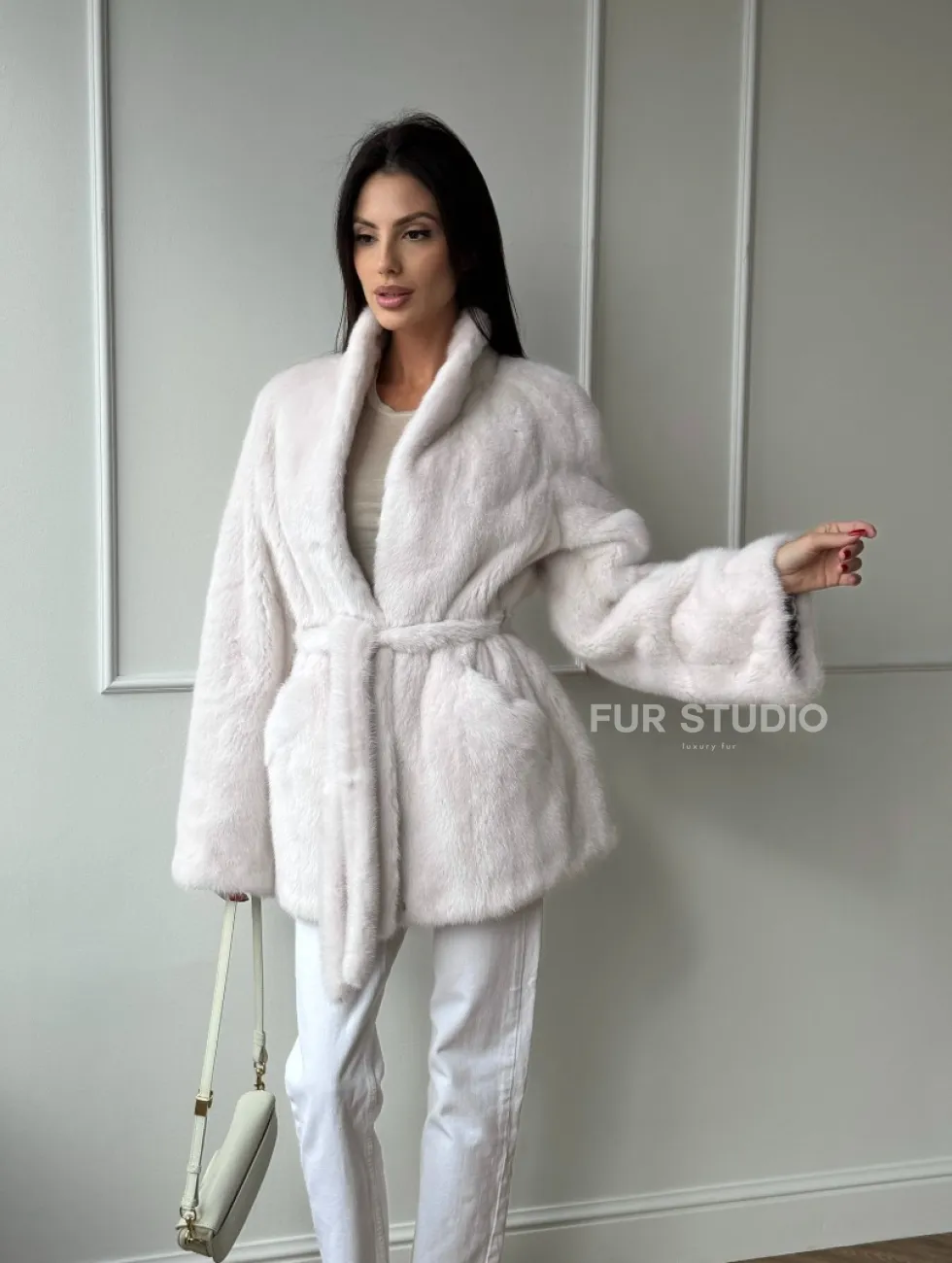Белый меховой жакет из норки с V-образным воротником и поясом доступна для покупки в нашем шоуруме Furs Studio в Чите. У нас так же есть доставка во все города России. Добавьте немного роскоши в свой гардероб с этой шубой, которая будет служить вам многие годы.