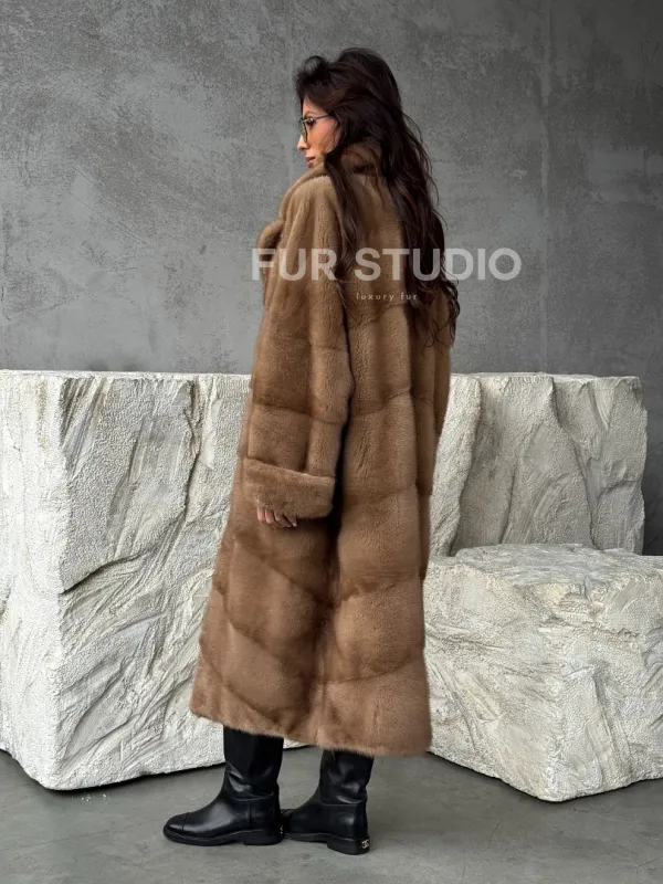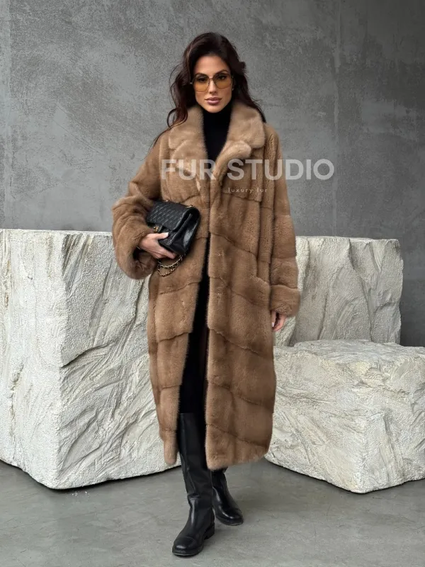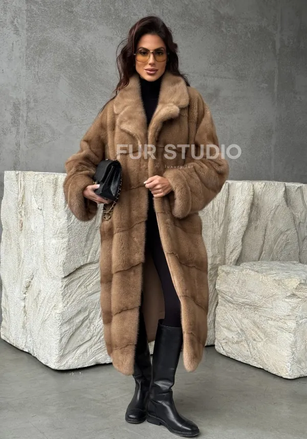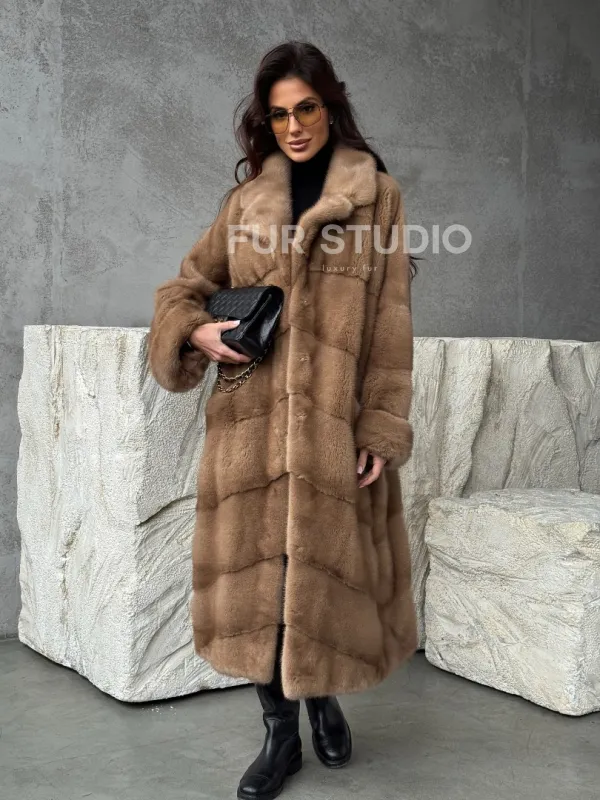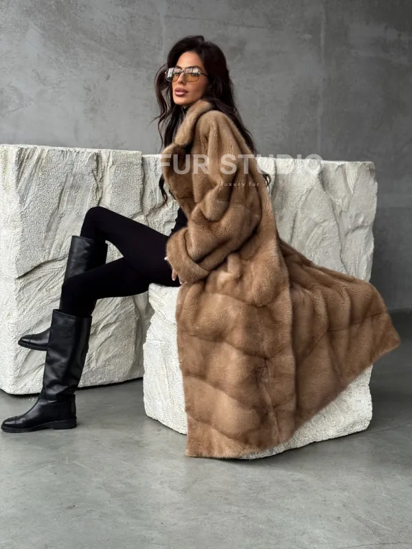 Мех данной шубы аукционная норка, цвет бежевый. Предлагается в размерах от 42 до 60. Длина модели 115-120 см, что выгодно подчеркивает фигуру девушек. Эта модель идеально подойдет для девушек и женщин, предпочитающих роскошные натуральные меха.
