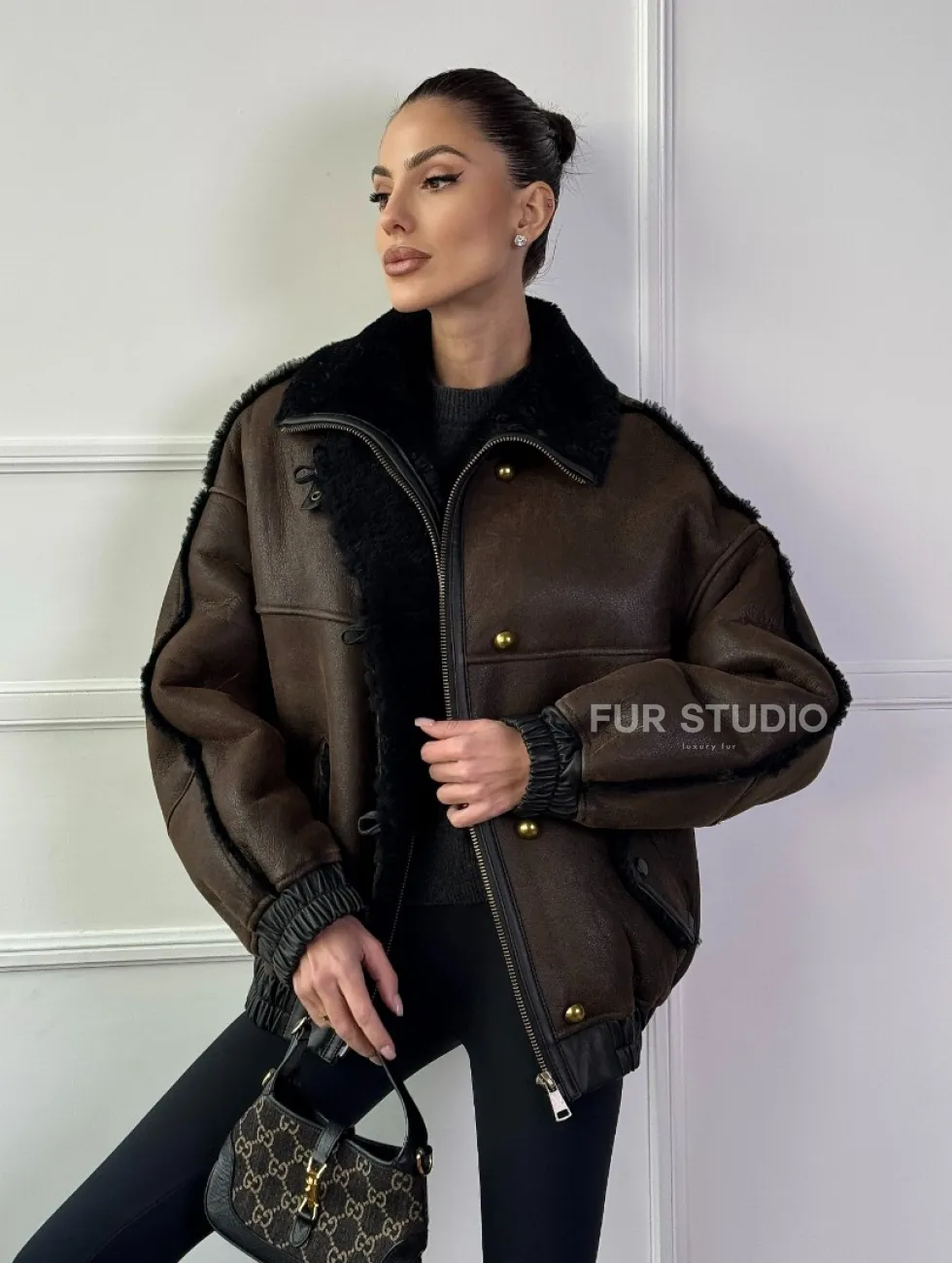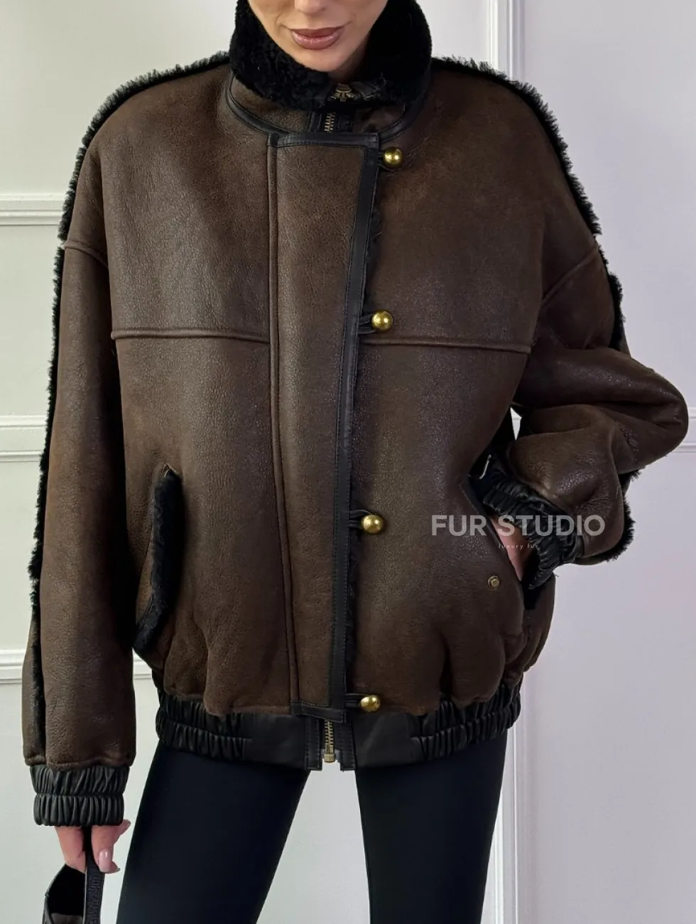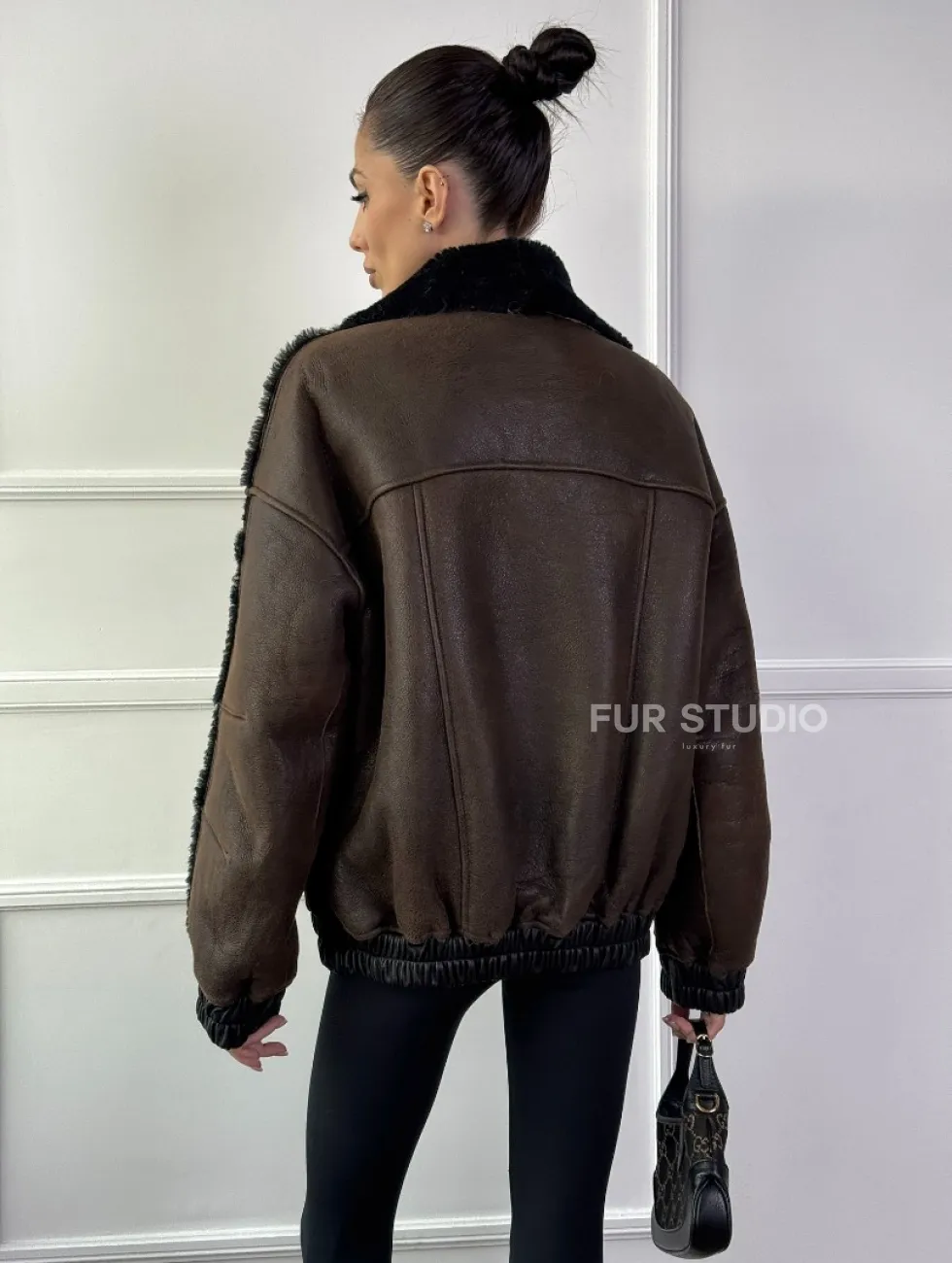 Бомбер - дубленка из натуральной овчины керли "Vintage brown + black" доступна для покупки в нашем шоуруме Furs Studio в Чите, а также предлагается удобная доставка во все города России. Обогатите свой гардероб этой дубленкой, которая прослужит вам многие годы, добавив немного роскоши в ваш повседневный образ.