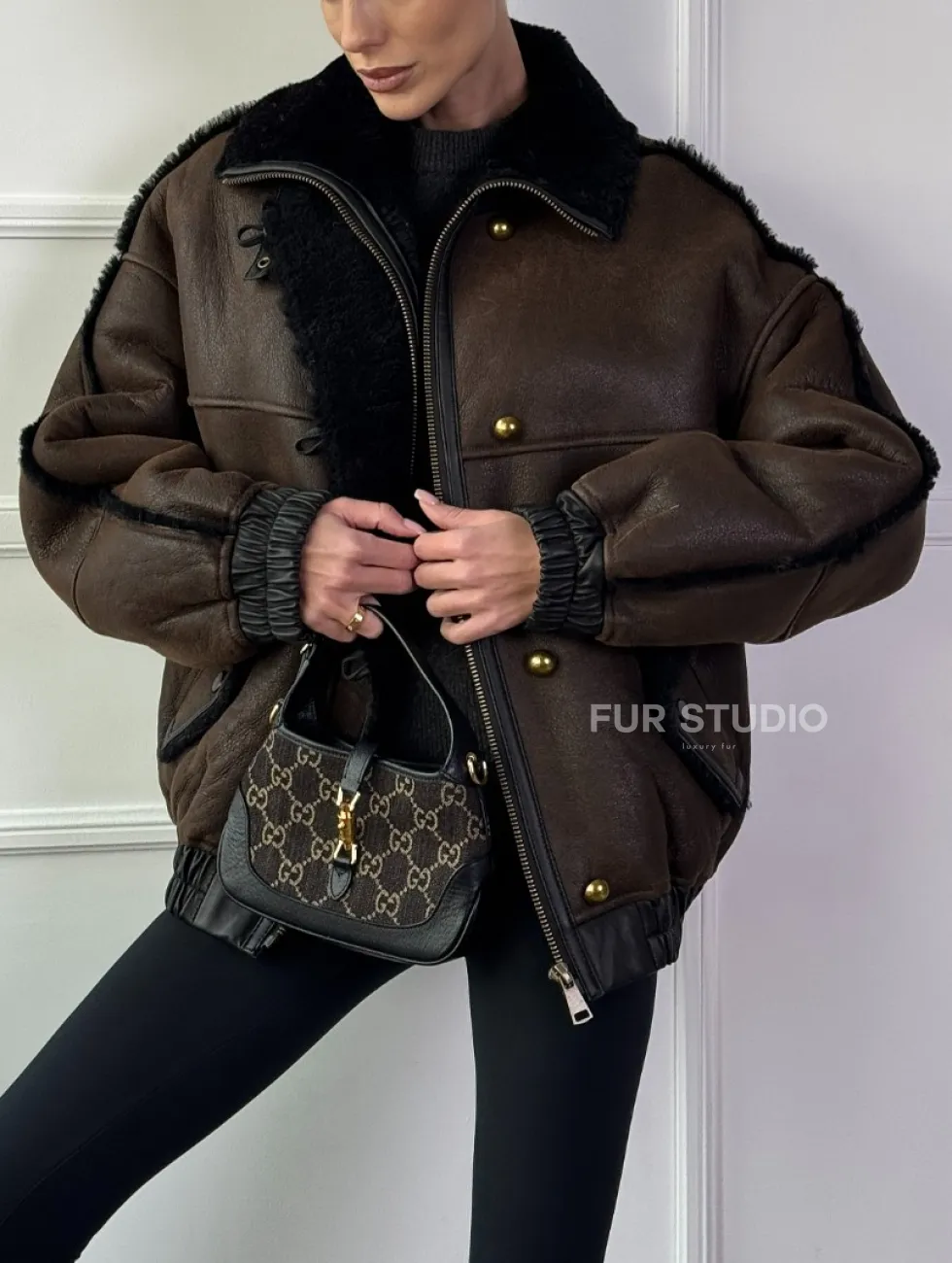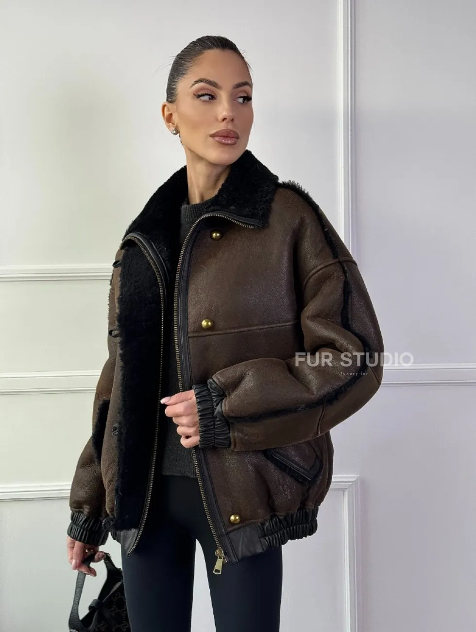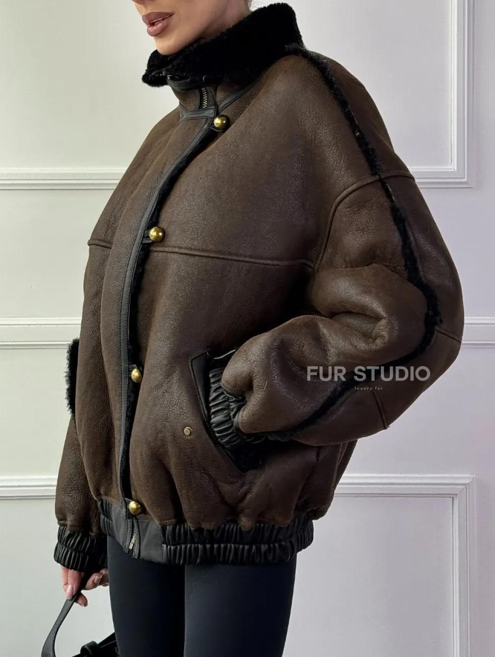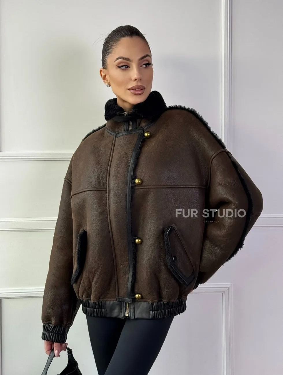 Бомбер - дубленка из натуральной овчины керли "Vintage brown + black" доступна для покупки в нашем шоуруме Furs Studio в Чите, а также предлагается удобная доставка во все города России. Обогатите свой гардероб этой дубленкой, которая прослужит вам многие годы, добавив немного роскоши в ваш повседневный образ.