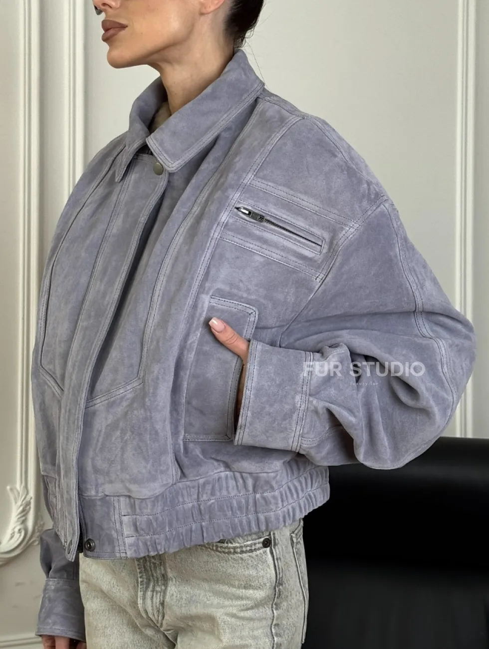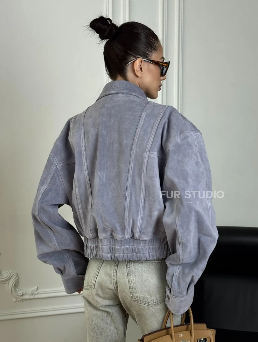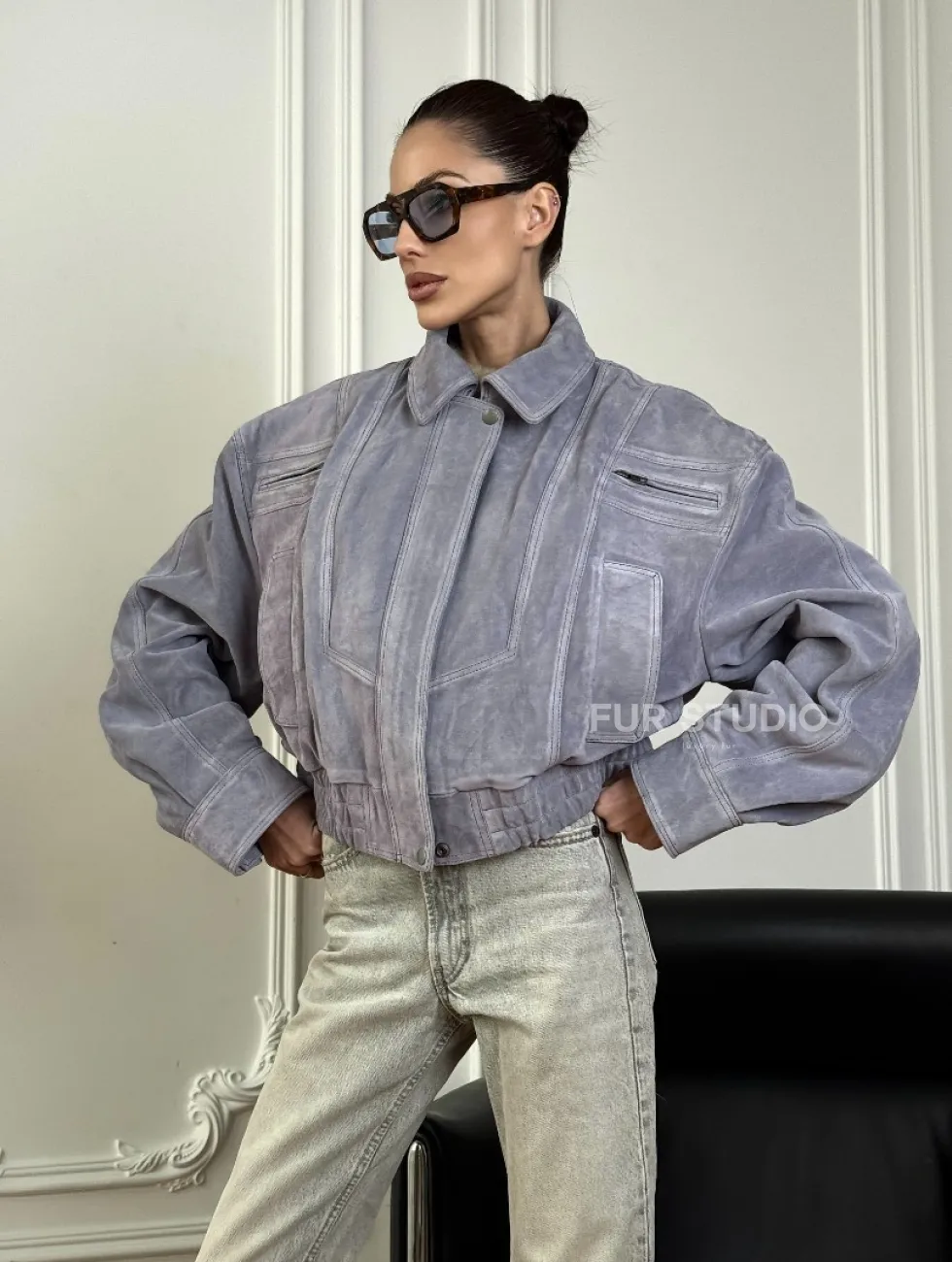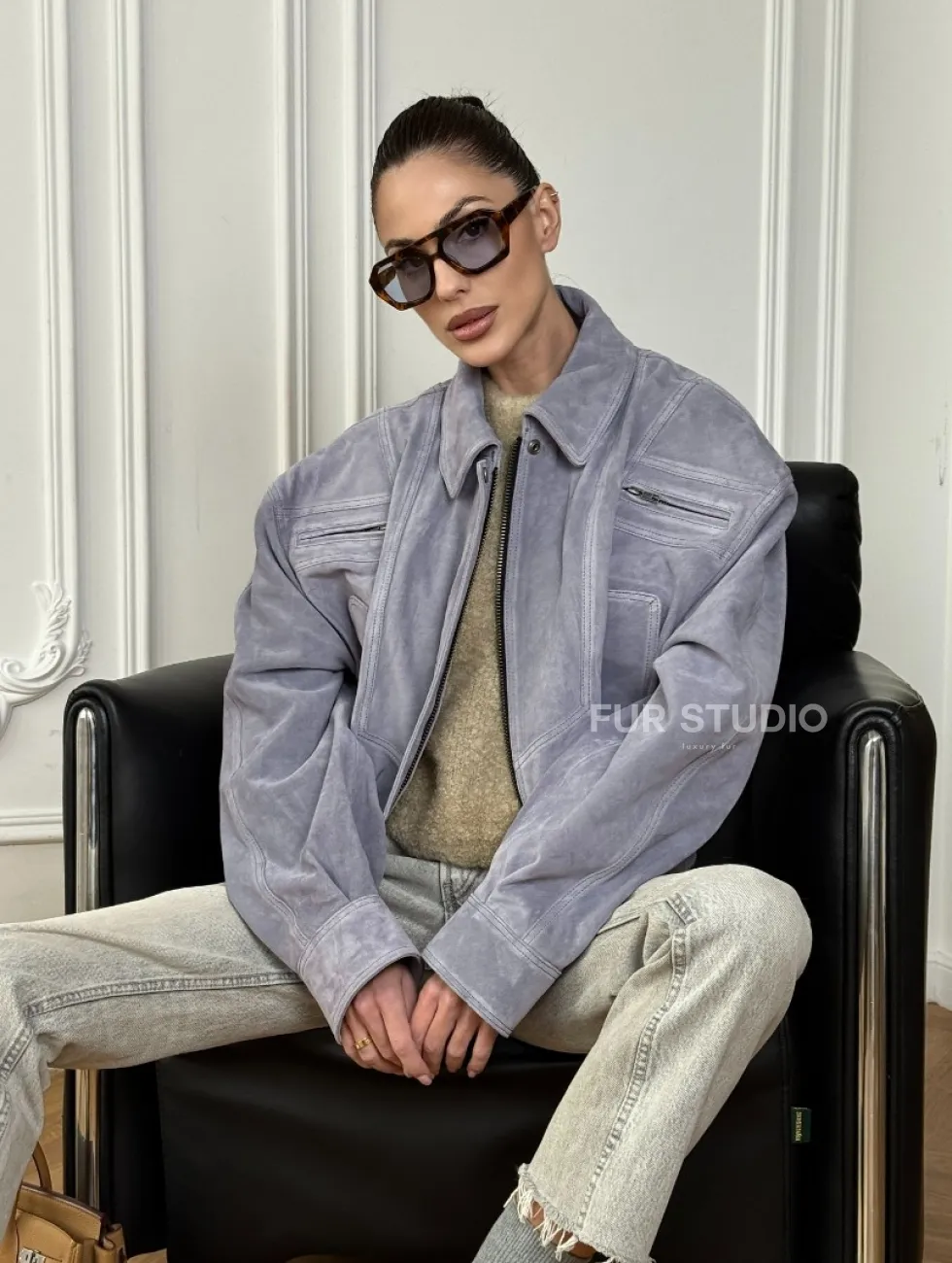 Бомбер - куртка весенняя оверсайз из натуральной кожи (замши) Grey blue доступна для покупки в нашем шоуруме Furs Studio в Чите, где также предоставляется удобная доставка во все города России.