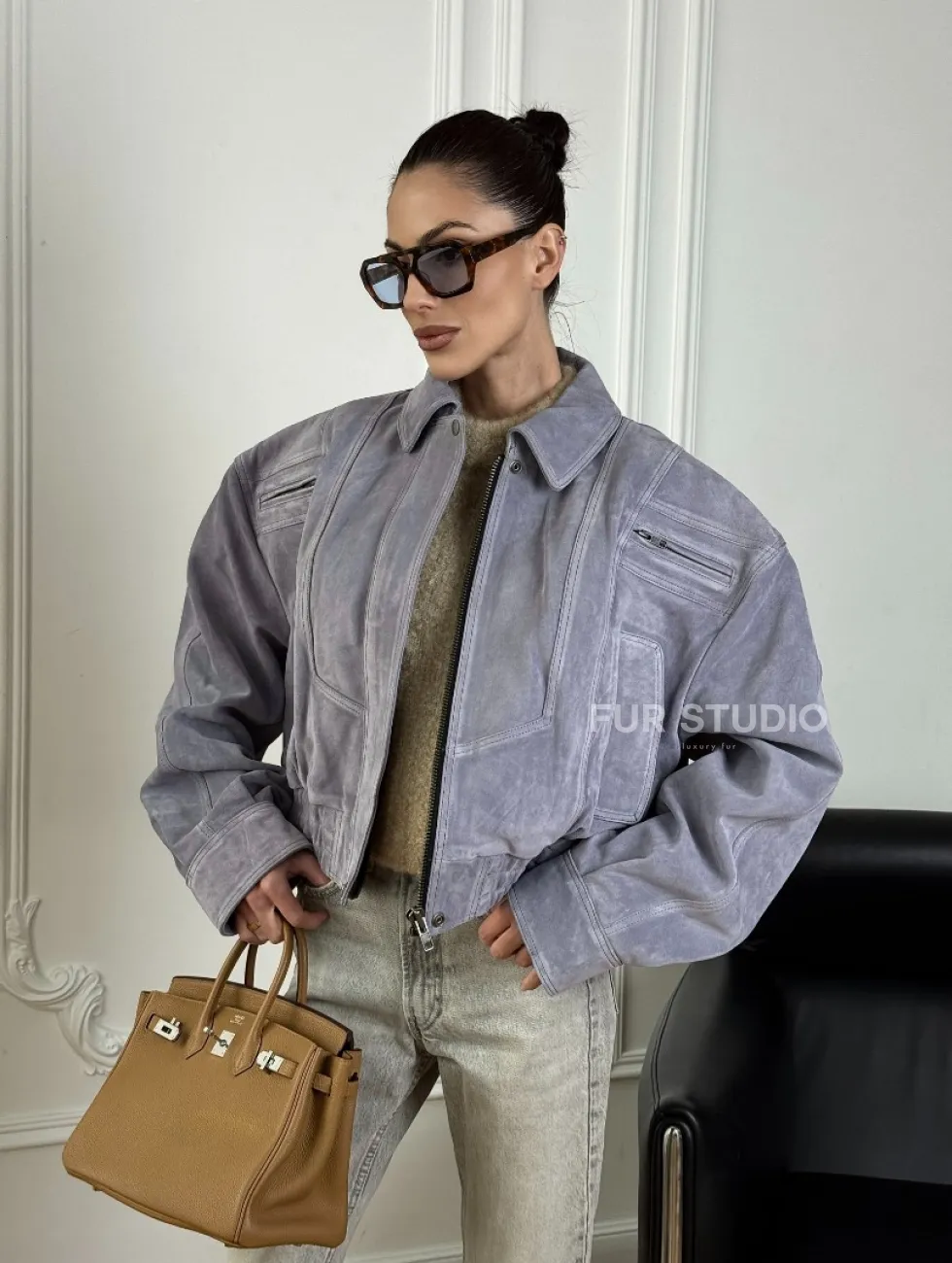 Восхититесь элегантностью и несравненным комфортом с нашей эксклюзивной коллекцией кожаных изделий. Изготовленная из первоклассной натуральной кожи, Бомбер - куртка весенняя оверсайз из натуральной кожи (замши) Grey blue не только согреет вас в прохладные дни, но и подчеркнет ваш изысканный вкус. Уникальный дизайн и высокое качество делают наши представленные образцы идеальным выбором для утончённых образов.