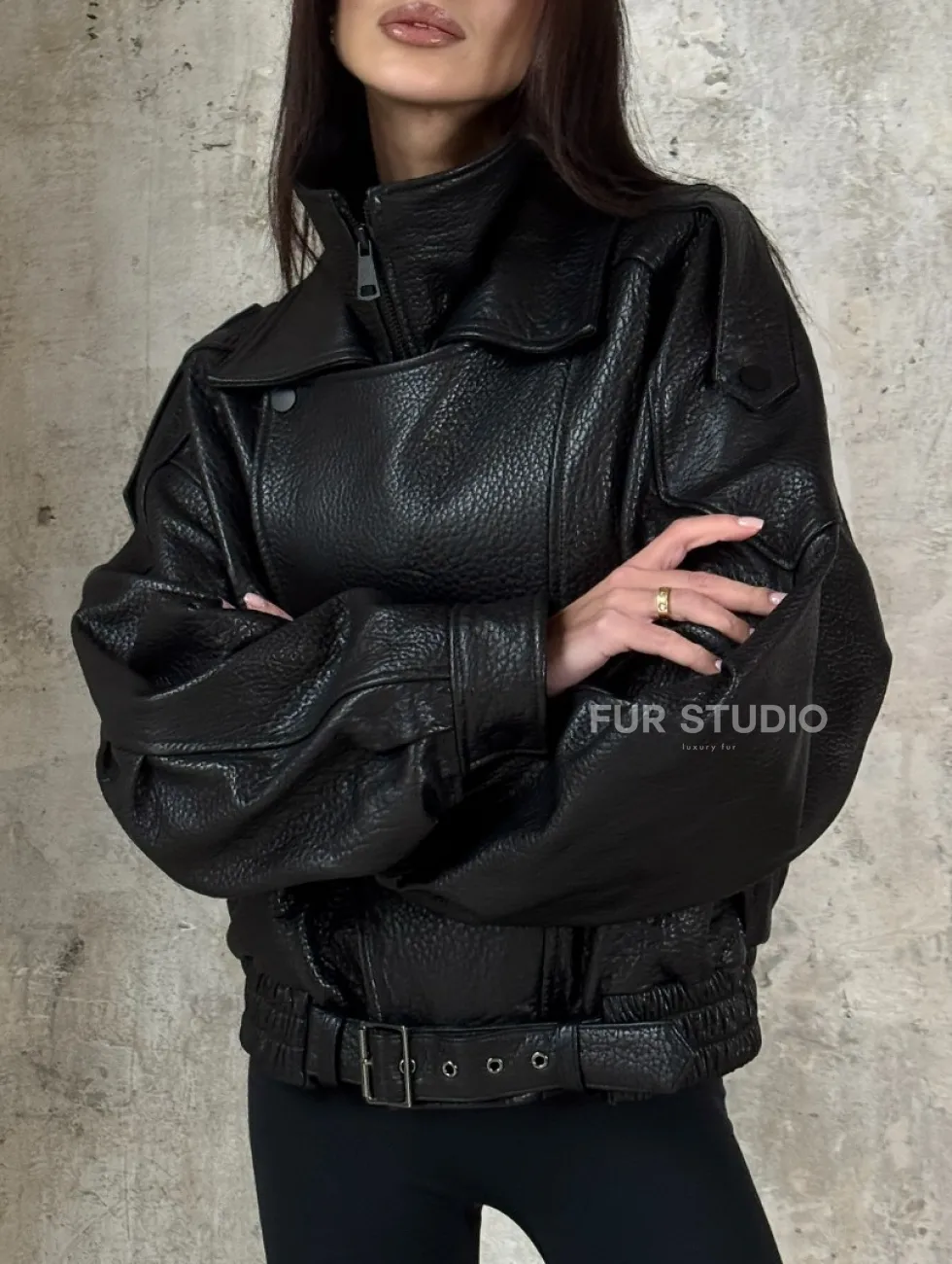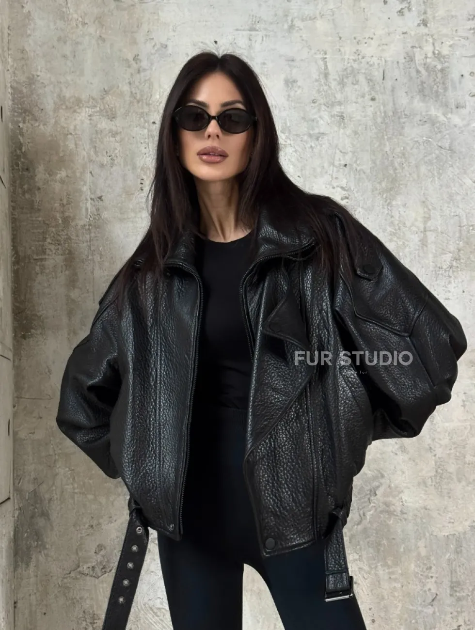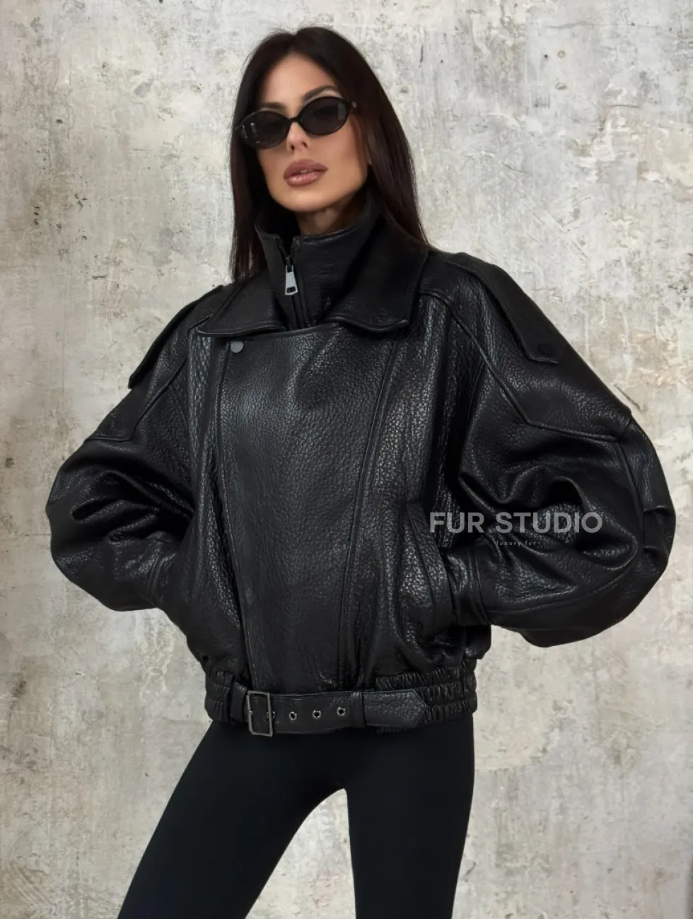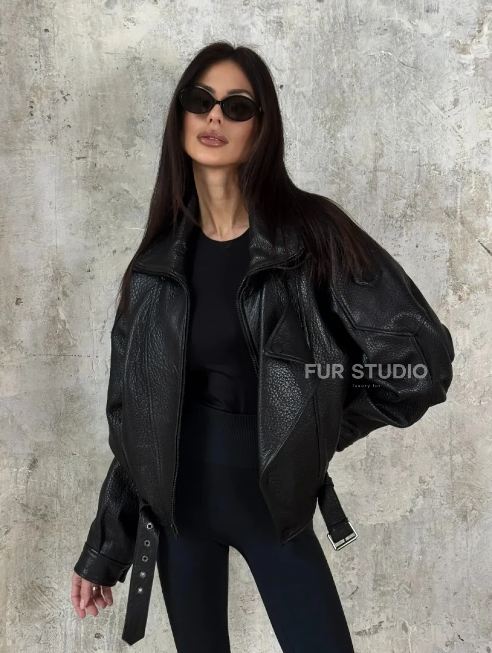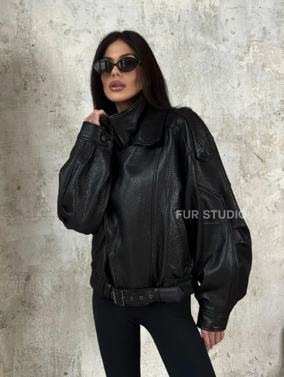 Черная бомбер-курточка «Оверсайз» из кожи Джумбо с двойным воротником и карманами доступна для покупки в нашем шоуруме Furs Studio в Чите, где также предоставляется удобная доставка во все города России.