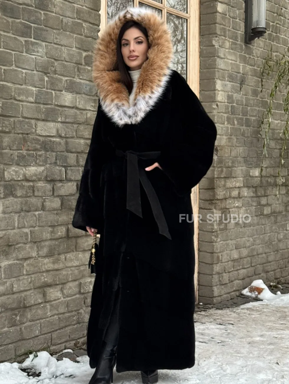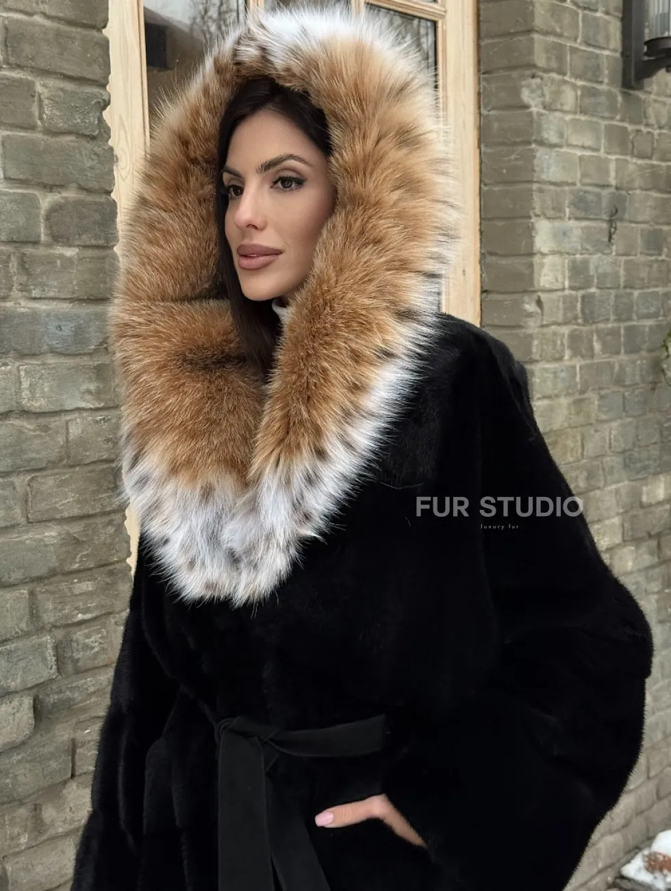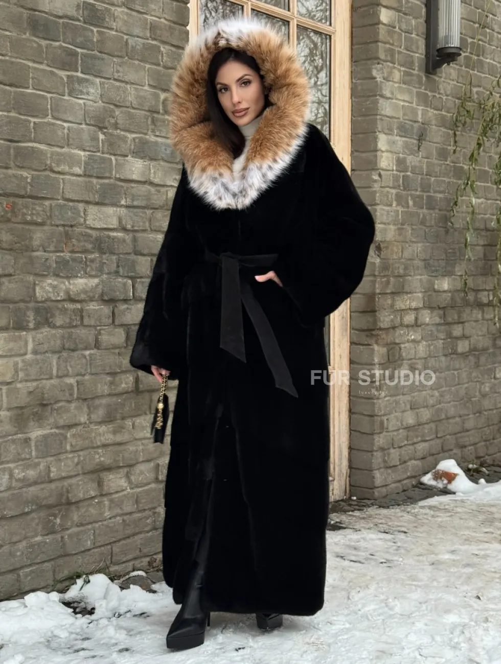 Черная длинная шуба из норки с капюшоном из меха рыси доступна для покупки в нашем шоуруме Furs Studio в Чите. У нас так же есть доставка во все города России. Добавьте немного роскоши в свой гардероб с этой шубой, которая будет служить вам многие годы.