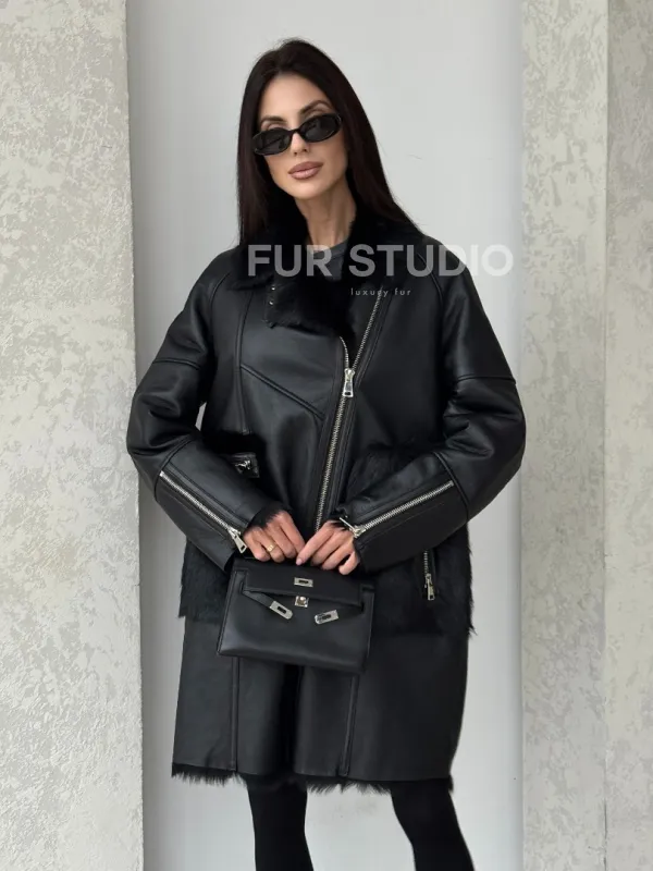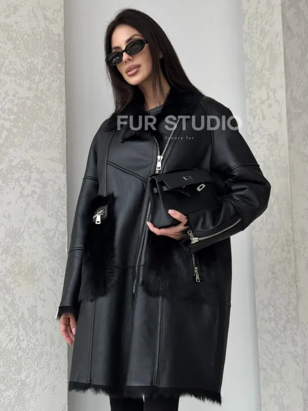 Черная дубленка на тоскане. Модель предлагается в размерах от 42 до 50. Оптимальная длина моделей 85-90 см подчеркивает линии вашей фигуры. Эта дубленка станет неотъемлемой частью гардероба для тех, кто предпочитает роскошь и утонченность натуральной кожи.