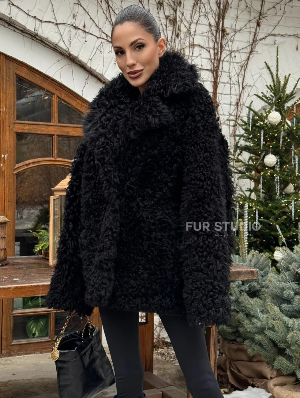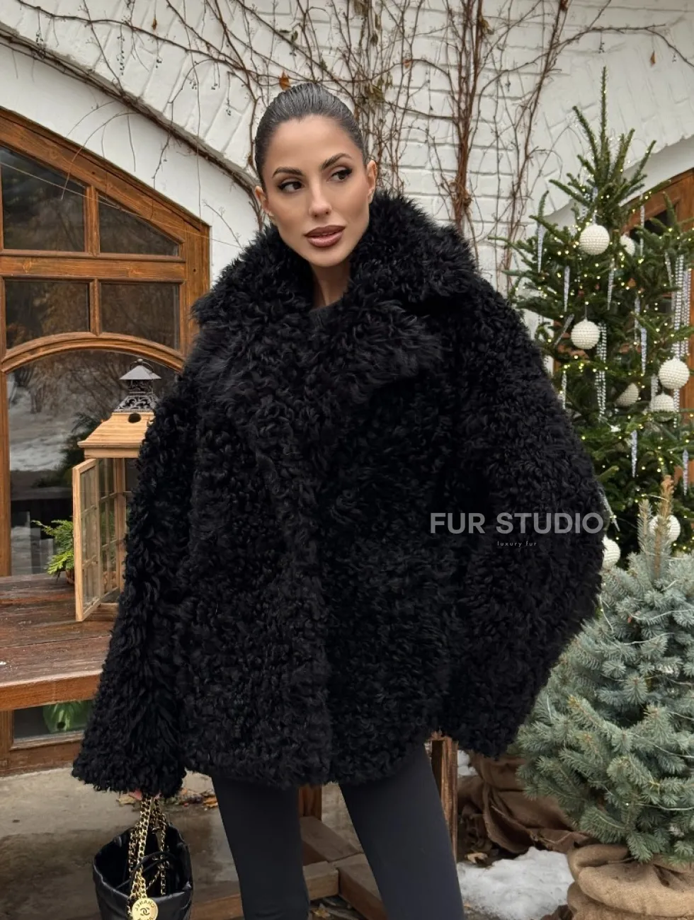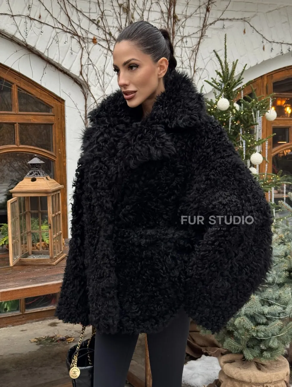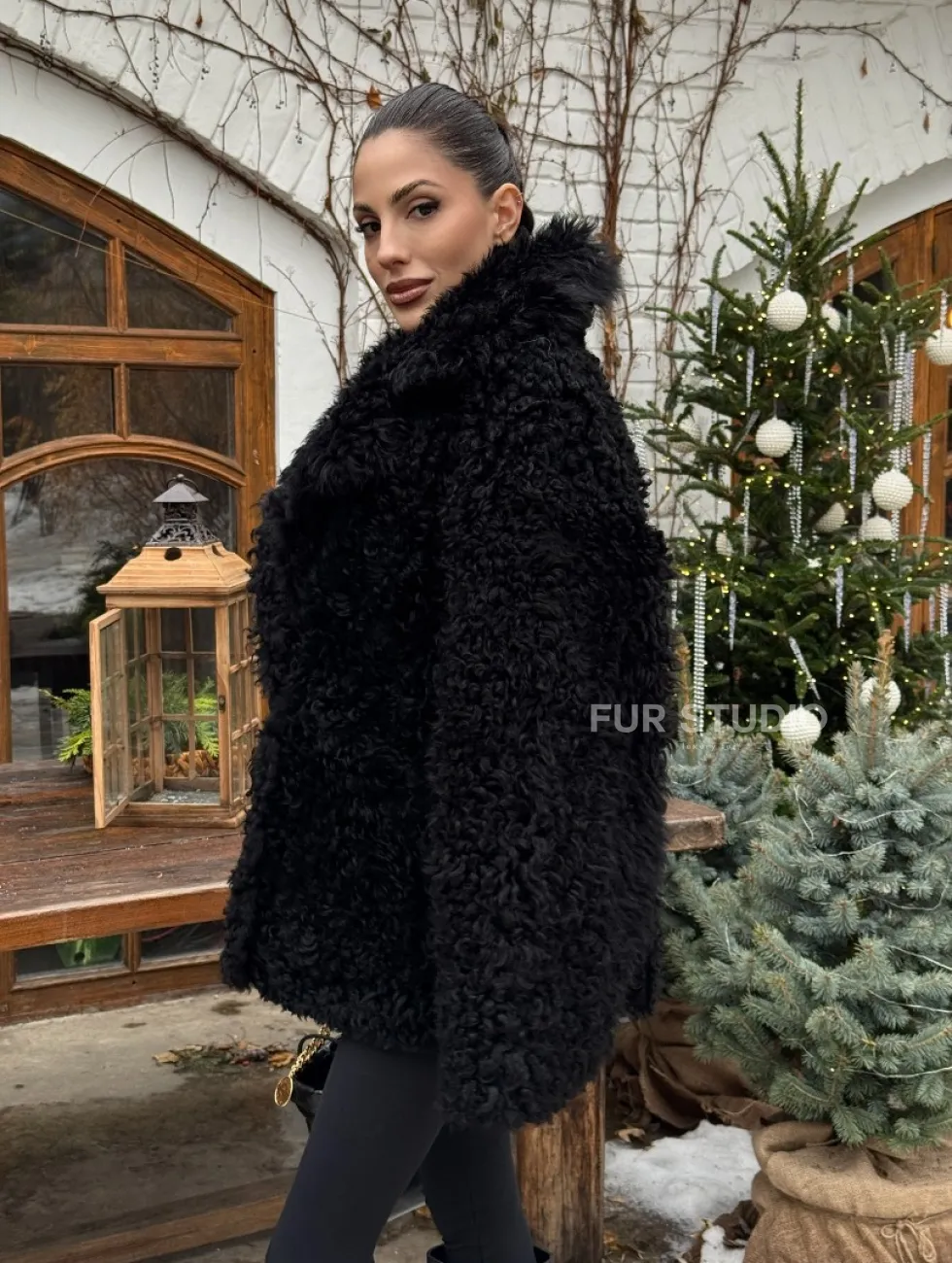 Черная короткая шуба - дубленка из испанской овчины «Тиградо» доступна для покупки в нашем шоуруме Furs Studio в Чите, а также предлагается удобная доставка во все города России. Обогатите свой гардероб этой дубленкой, которая прослужит вам многие годы, добавив немного роскоши в ваш повседневный образ.