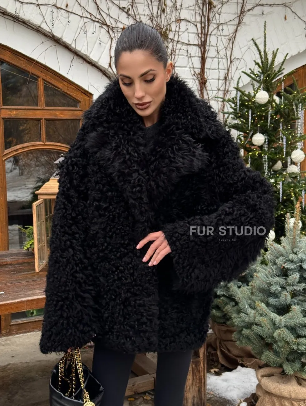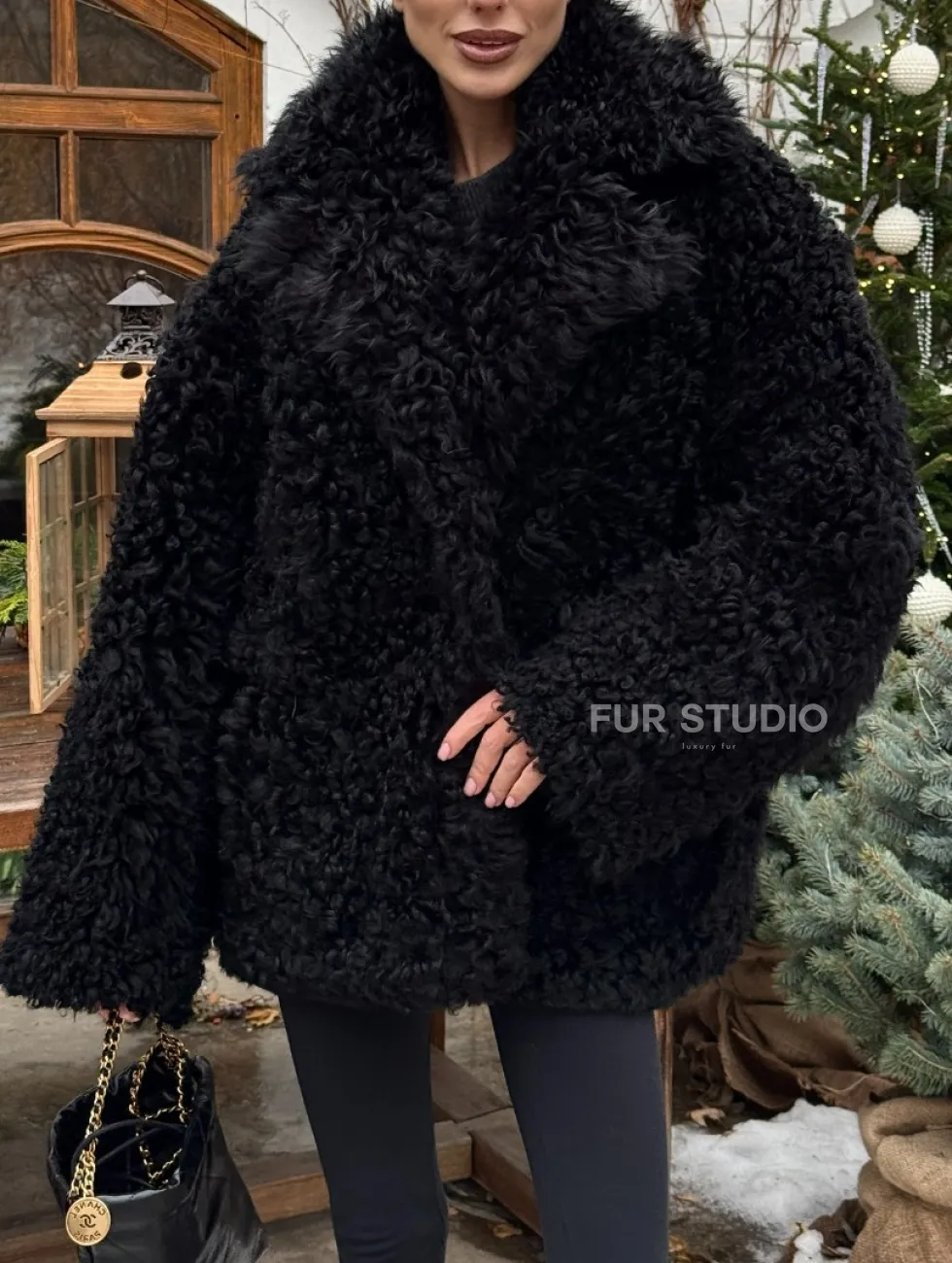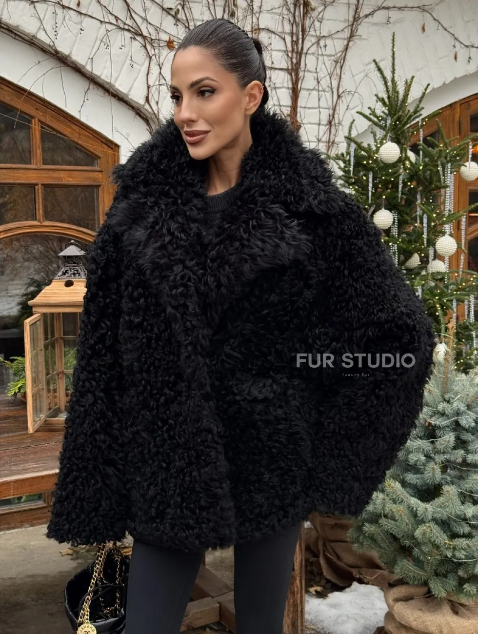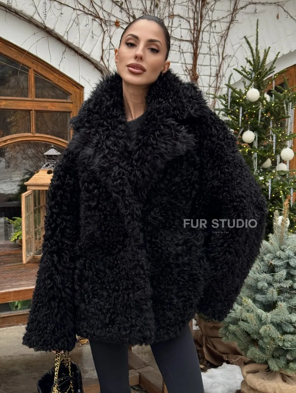 Черная короткая шуба - дубленка из испанской овчины «Тиградо» доступна для покупки в нашем шоуруме Furs Studio в Чите, а также предлагается удобная доставка во все города России. Обогатите свой гардероб этой дубленкой, которая прослужит вам многие годы, добавив немного роскоши в ваш повседневный образ.