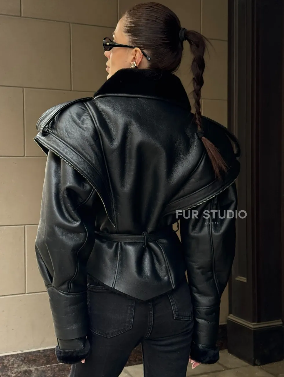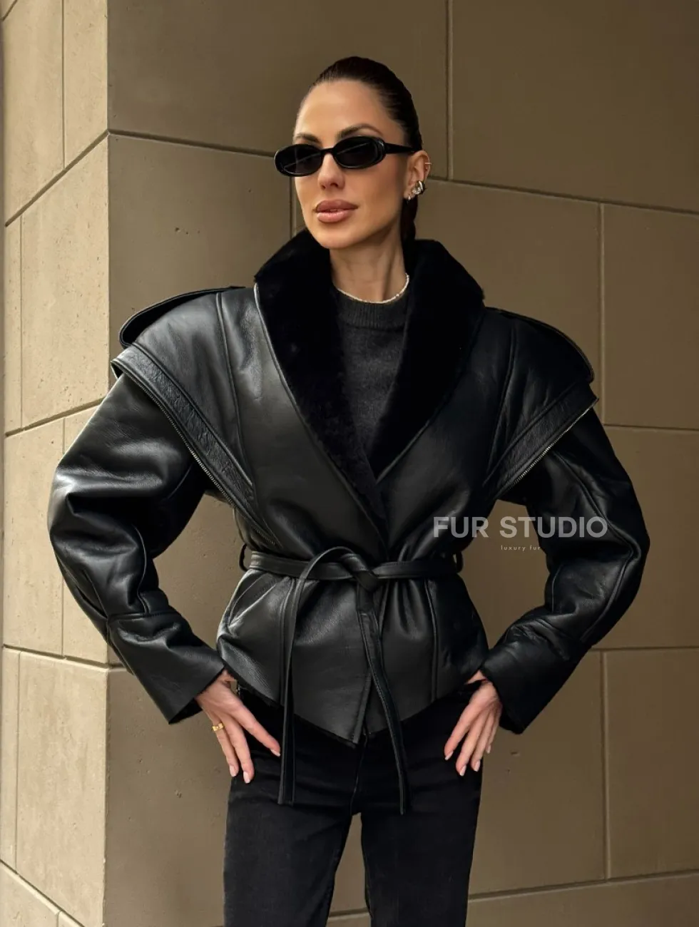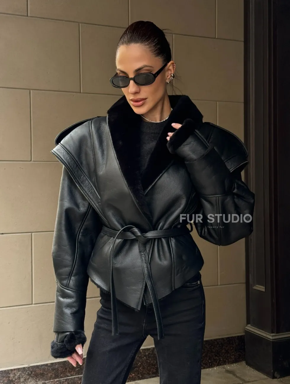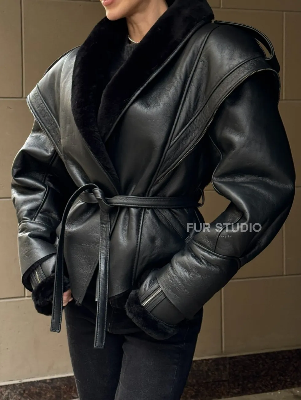 Черная куртка - дубленка на запах с поясом из меха мериноса. Модель предлагается в размерах от 42 до 50. Оптимальная длина моделей 60-65 см подчеркивает линии вашей фигуры. Эта дубленка станет неотъемлемой частью гардероба для тех, кто предпочитает роскошь и утонченность натуральной кожи.