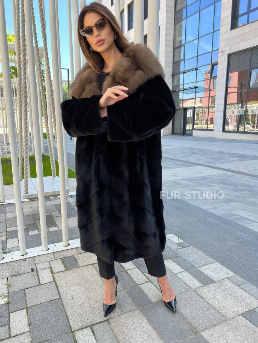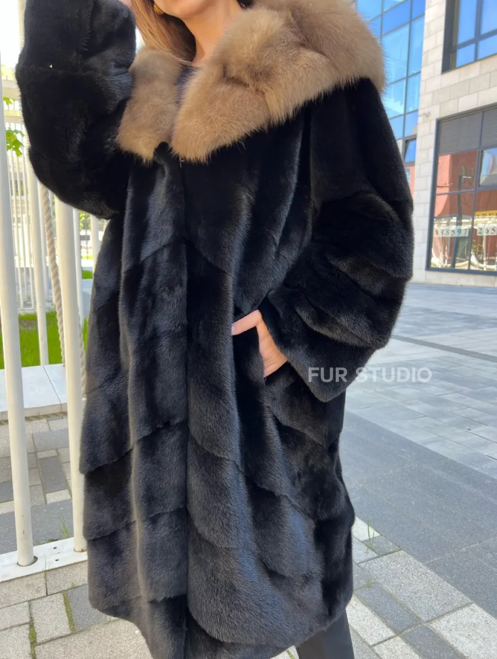 Черная норковая шуба с капюшоном из куницы – роскошный элемент гардероба, который должен быть у каждой девушки, знающей толк в моде. Модель поражает изысканностью. В изделии будете чувствовать себя королевой. Нежный мех бережно согреет в самые лютые холода. Шикарный капюшон из куницы позаботится, чтобы голова, шея не замерзли.