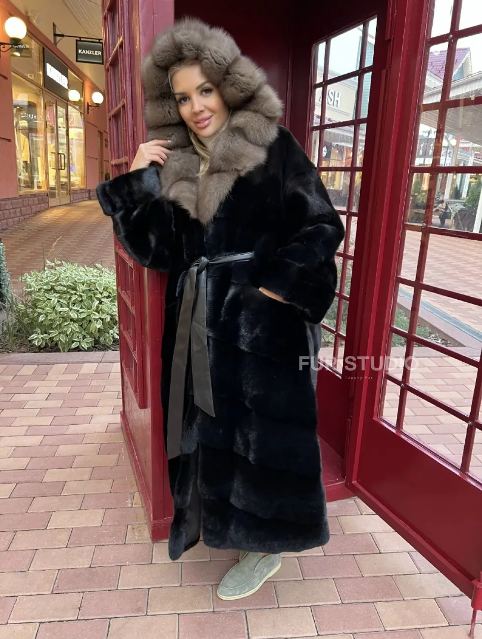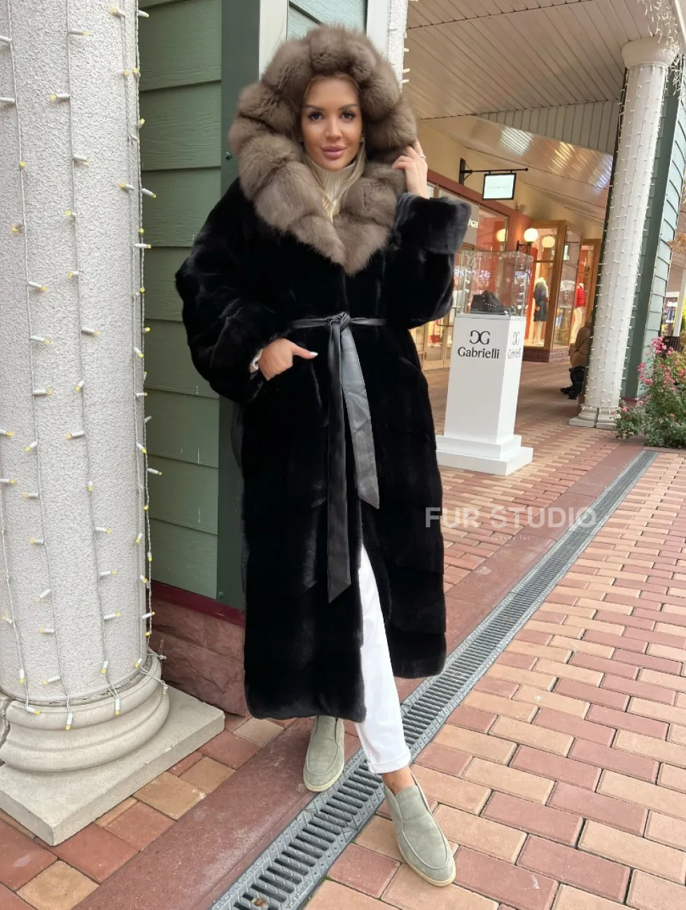 Удобные рукава не дадут замерзнуть ручкам в непогоду. Необычный пояс очертит талию и создаст силуэт “песочные часы”. Роскошные манжеты подчеркнут изящные кисти. Купить черную норковую шубу с капюшоном из меха куницы могут женщины, которые имеют безукоризненный вкус и разбираются в моде.