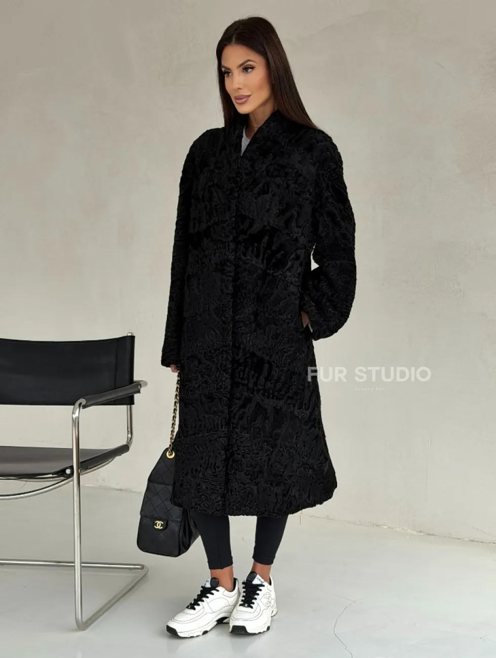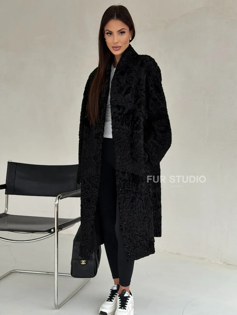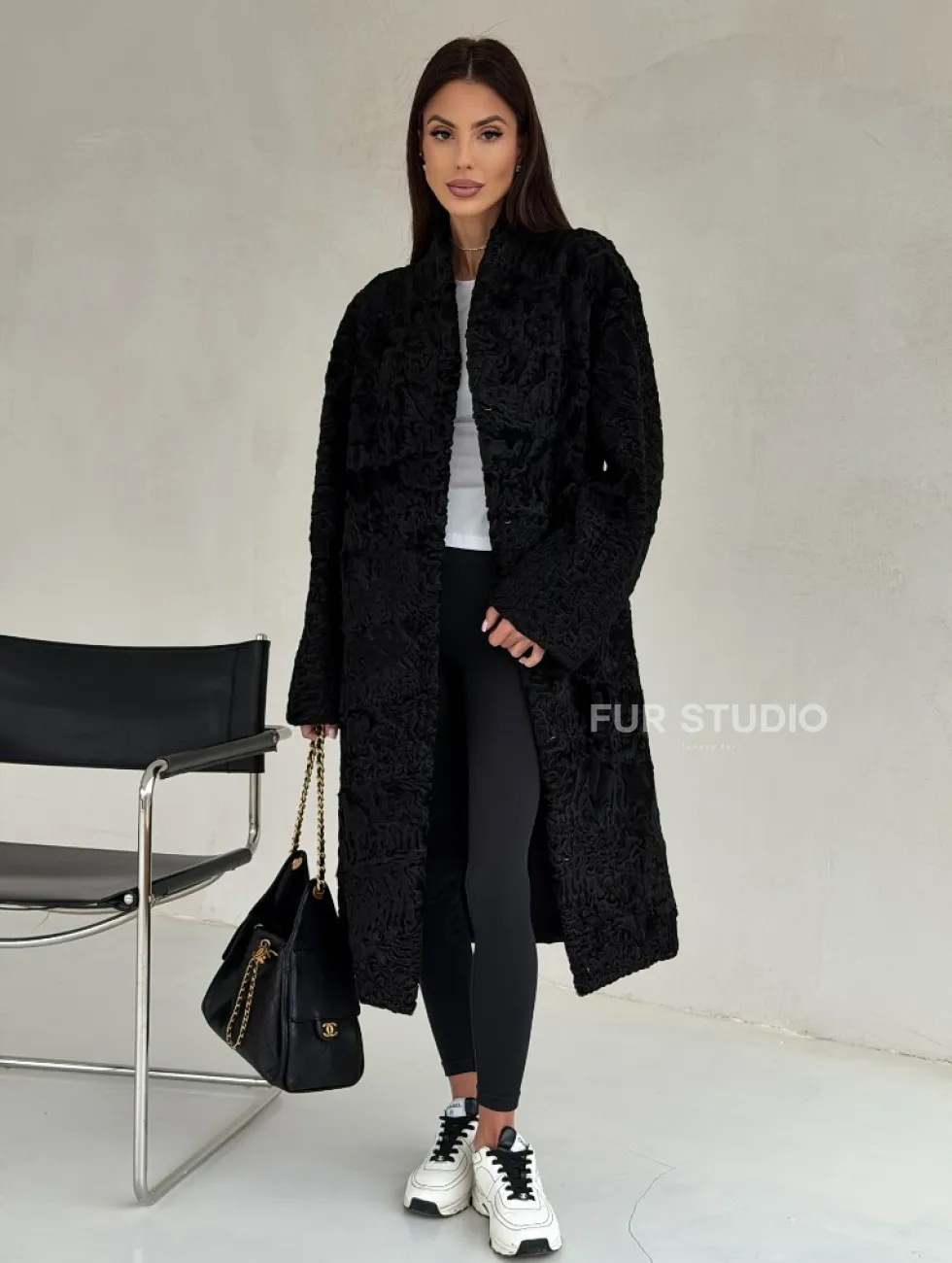 Мех данной шубы каракуль, цвет черный. Предлагается в размерах от 42 до 50. Длина модели 110-115 см, что выгодно подчеркивает фигуру девушек. Эта модель идеально подойдет для девушек и женщин, предпочитающих роскошные натуральные меха.