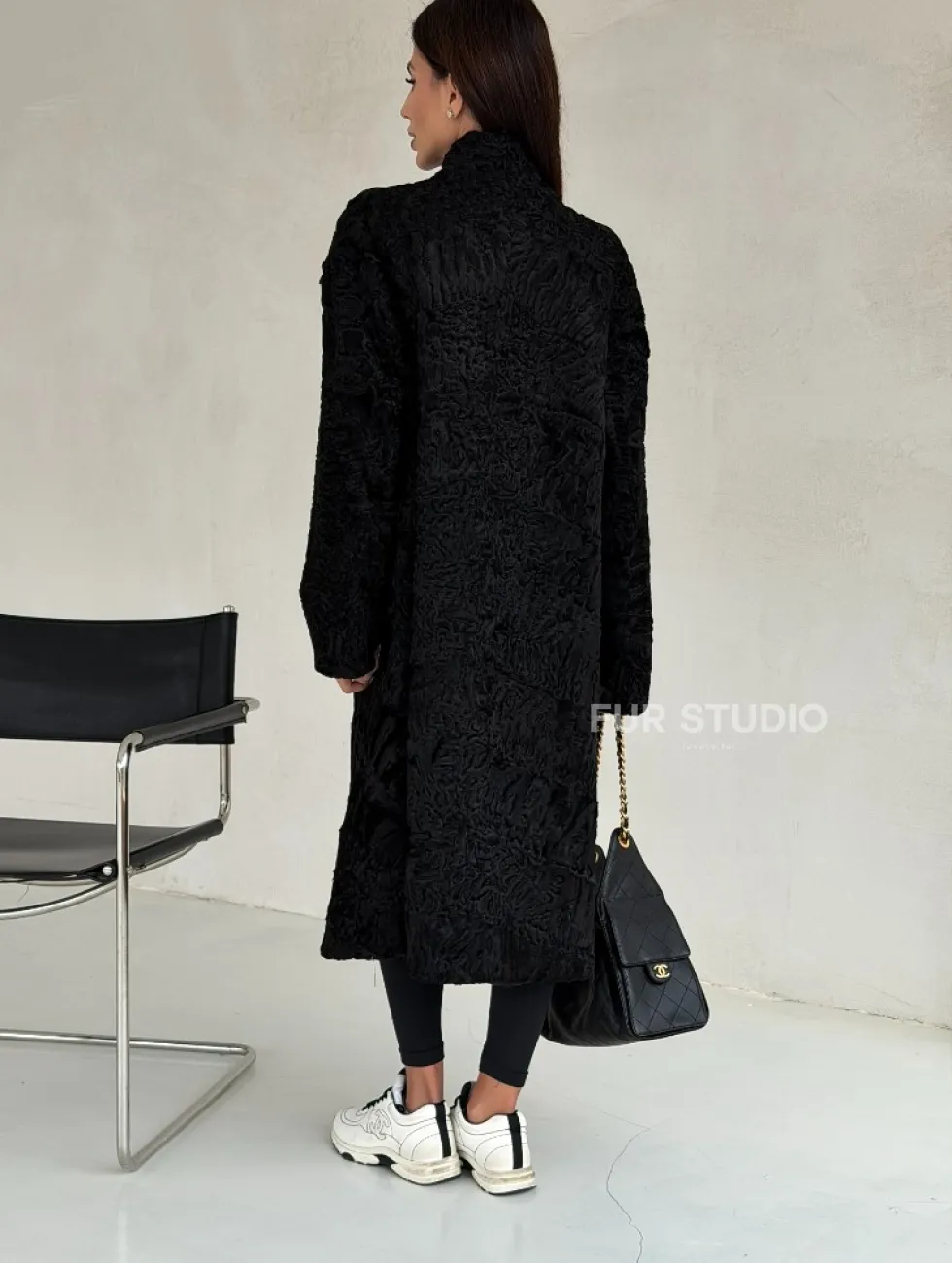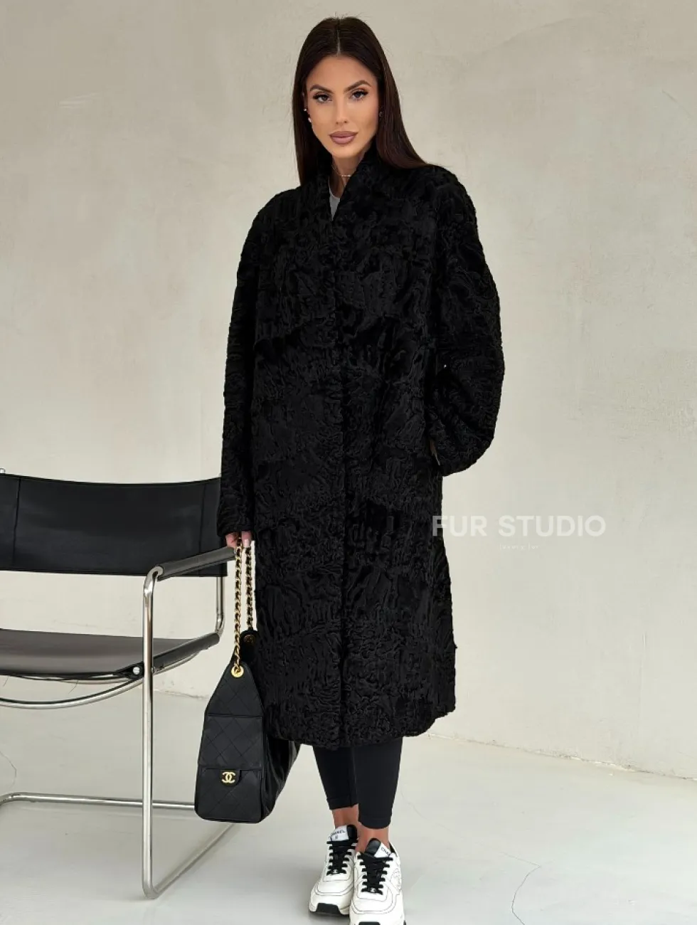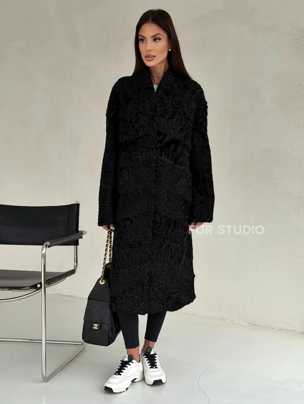 Мех данной шубы каракуль, цвет черный. Предлагается в размерах от 42 до 50. Длина модели 110-115 см, что выгодно подчеркивает фигуру девушек. Эта модель идеально подойдет для девушек и женщин, предпочитающих роскошные натуральные меха.