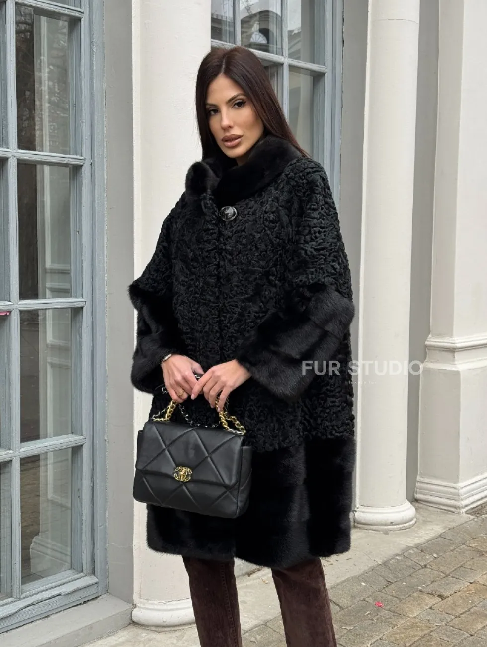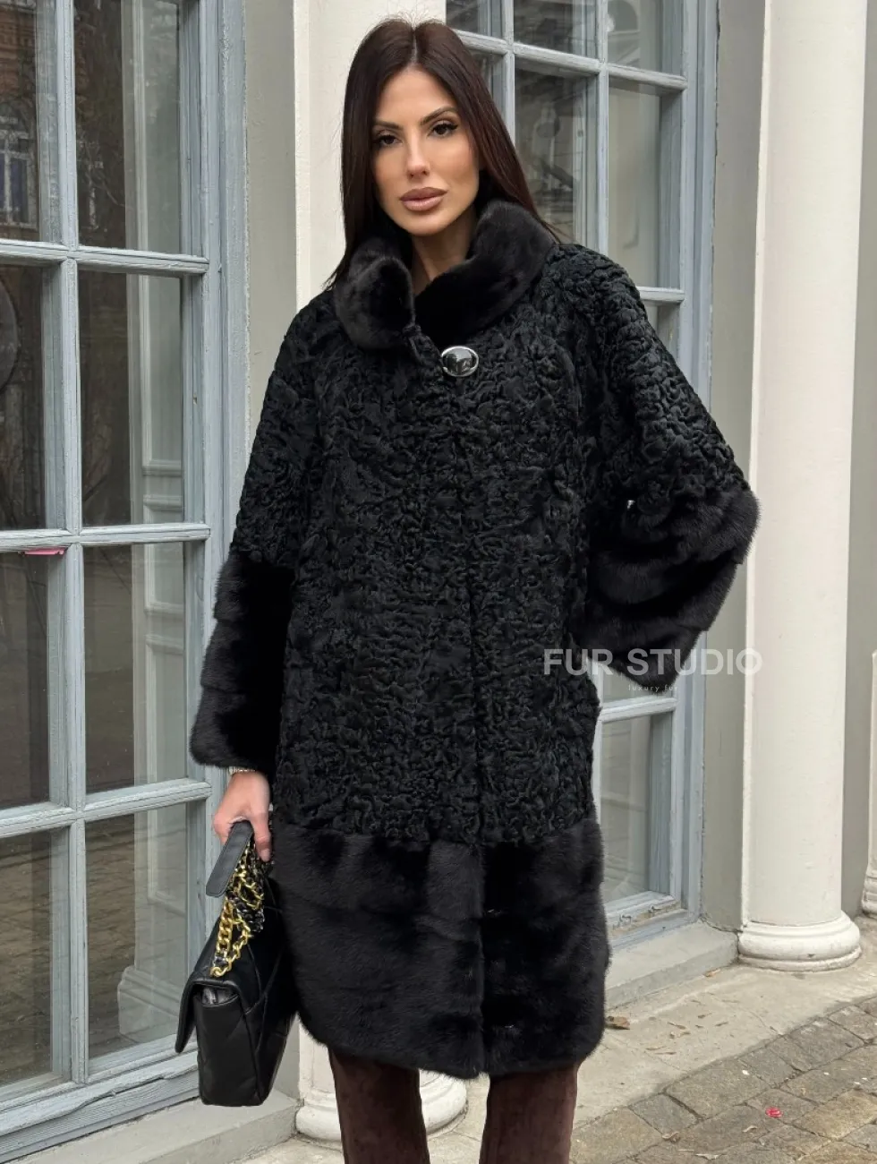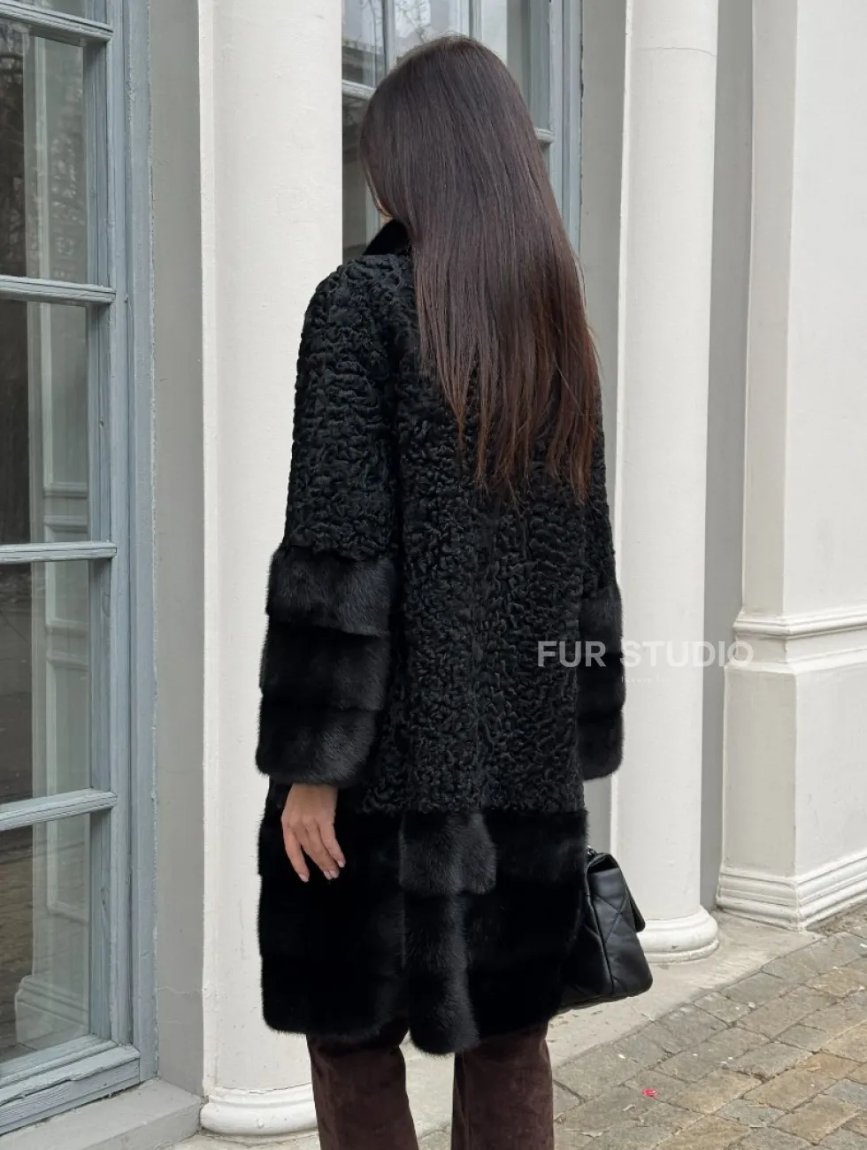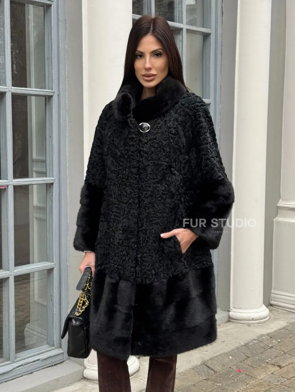 Черная шуба из меха каракульчи с отделкой из меха норки доступна для покупки в нашем шоуруме Furs Studio в Чите. У нас так же есть доставка во все города России. Добавьте немного роскоши в свой гардероб с этой шубой, которая будет служить вам многие годы.