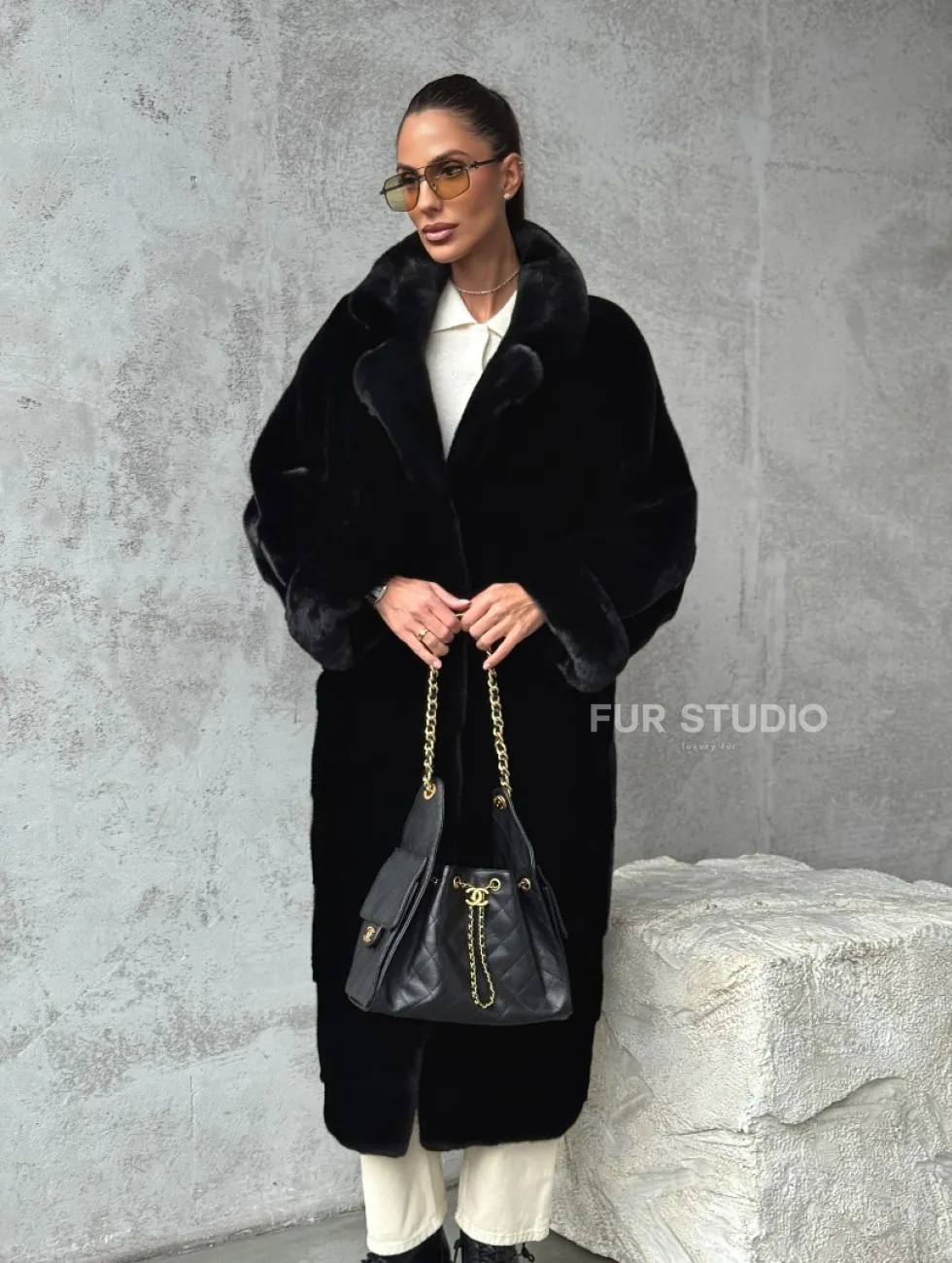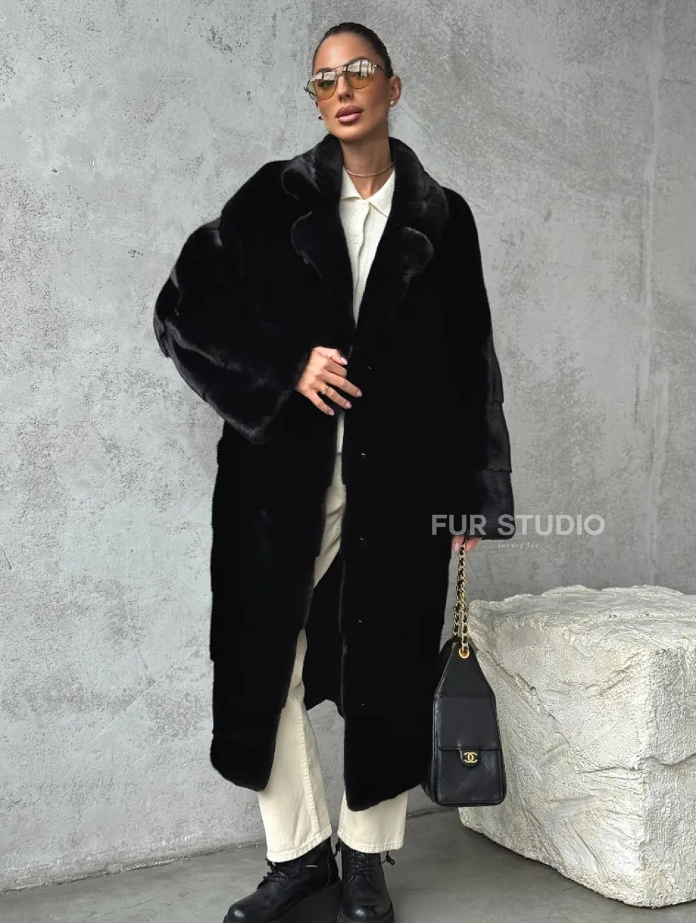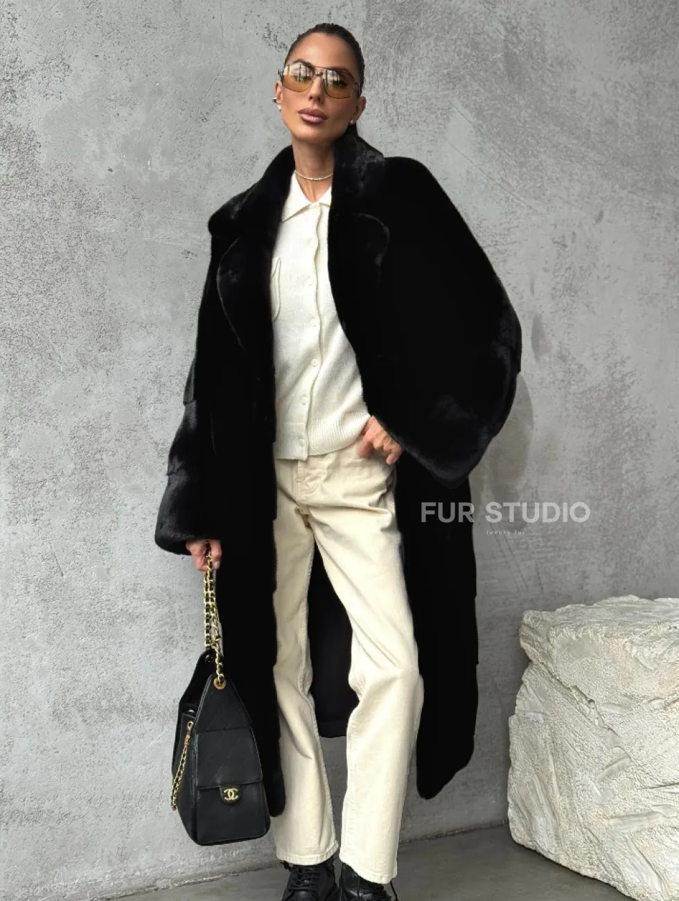 Мех данной шубы аукционная норка, цвет черный. Предлагается в размерах от 42 до 46. Длина модели 115-120 см, что выгодно подчеркивает фигуру девушек. Эта модель идеально подойдет для девушек и женщин, предпочитающих роскошные натуральные меха.
