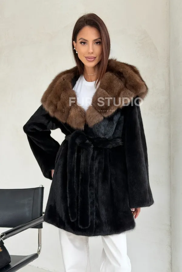 Мех данной шубы аукционная норка, цвет черный. Предлагается в размерах от 42 до 52. Длина модели 80-85 см, что выгодно подчеркивает фигуру девушек. Эта модель идеально подойдет для девушек и женщин, предпочитающих роскошные натуральные меха.