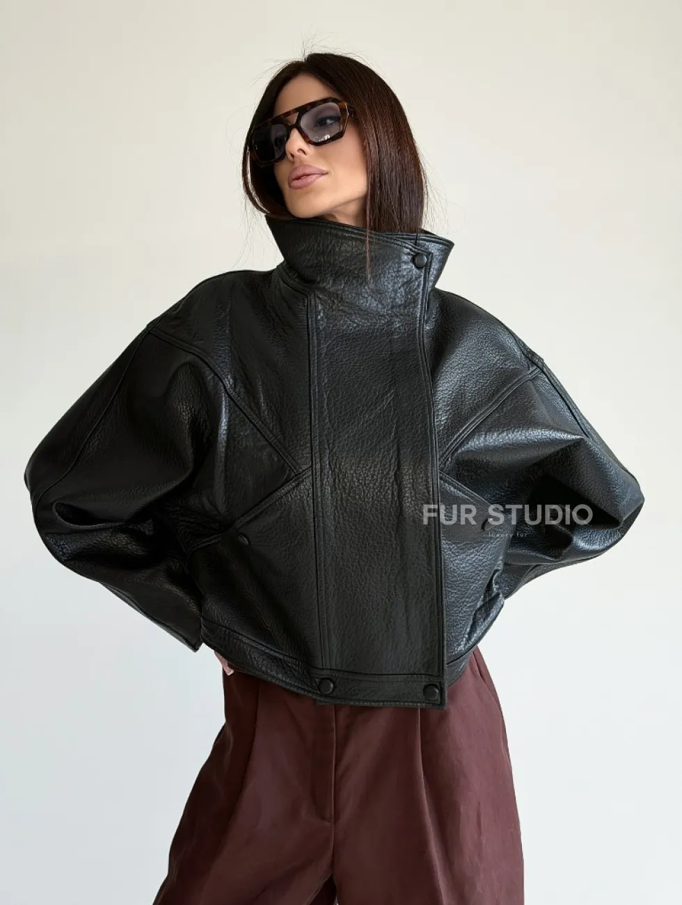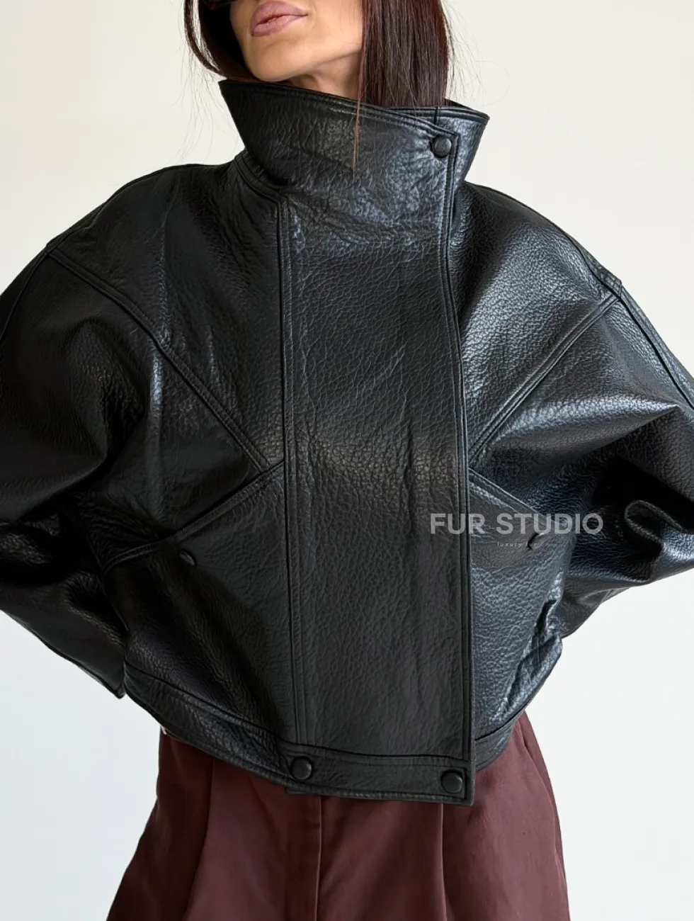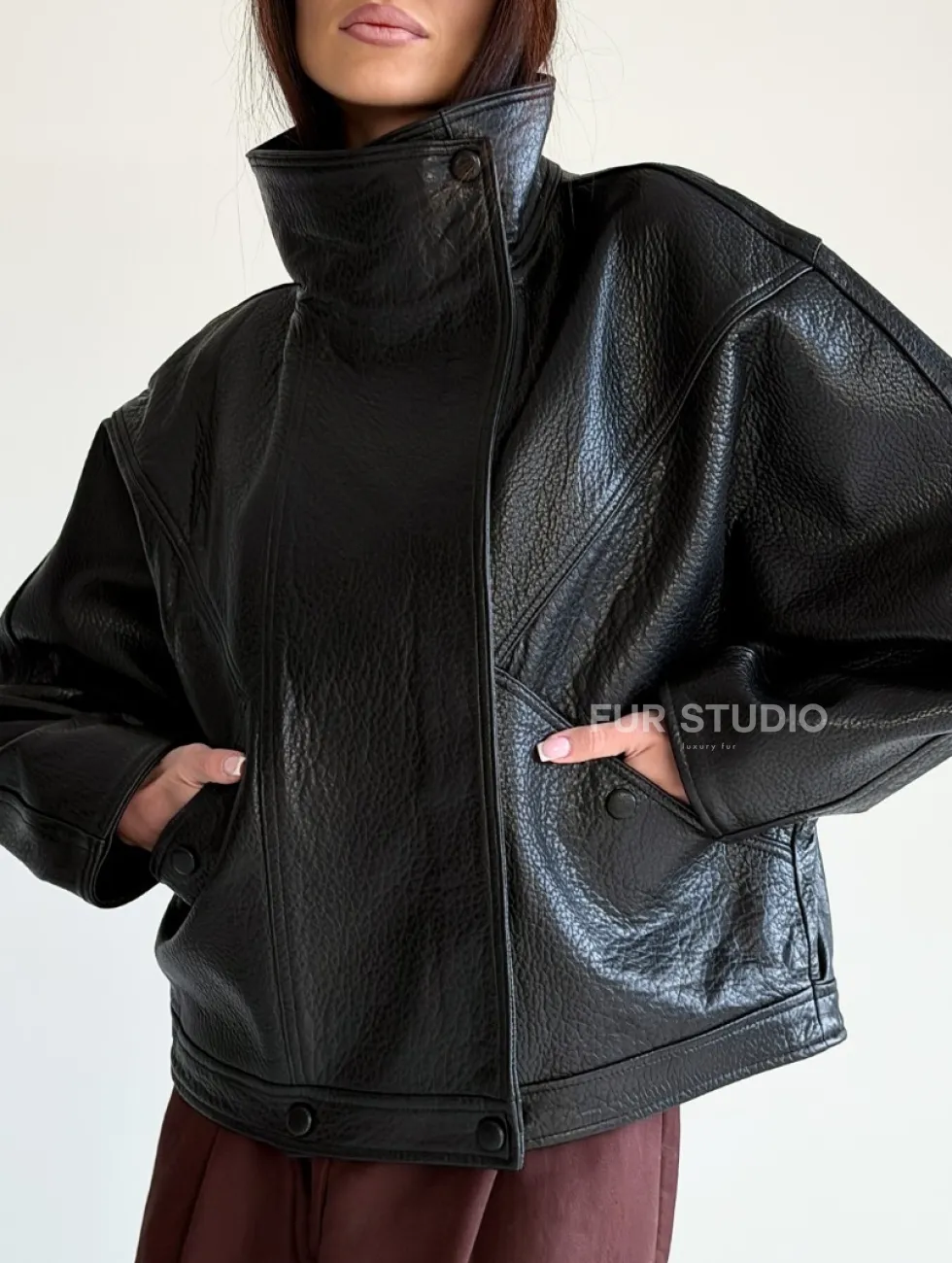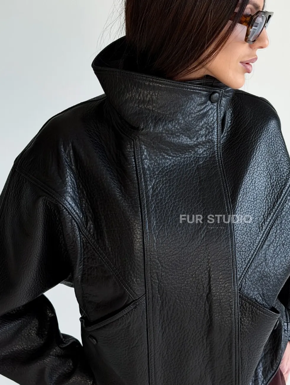 Черная женская кожаная куртка доступна для покупки в нашем шоуруме Furs Studio в Чите, где также предоставляется удобная доставка во все города России.