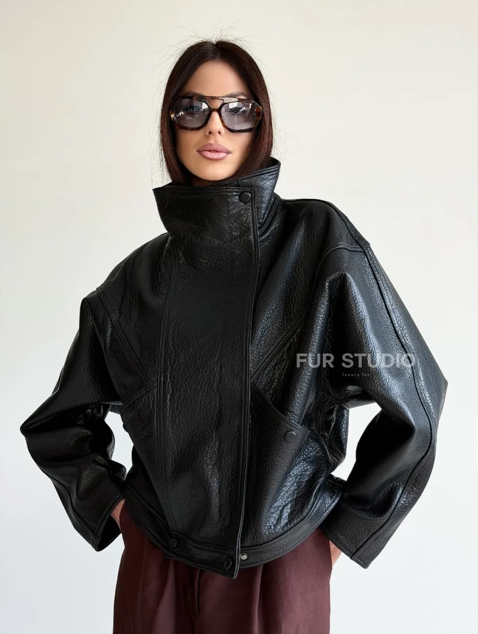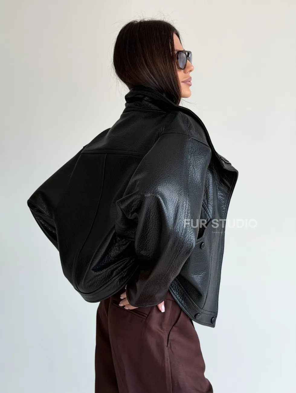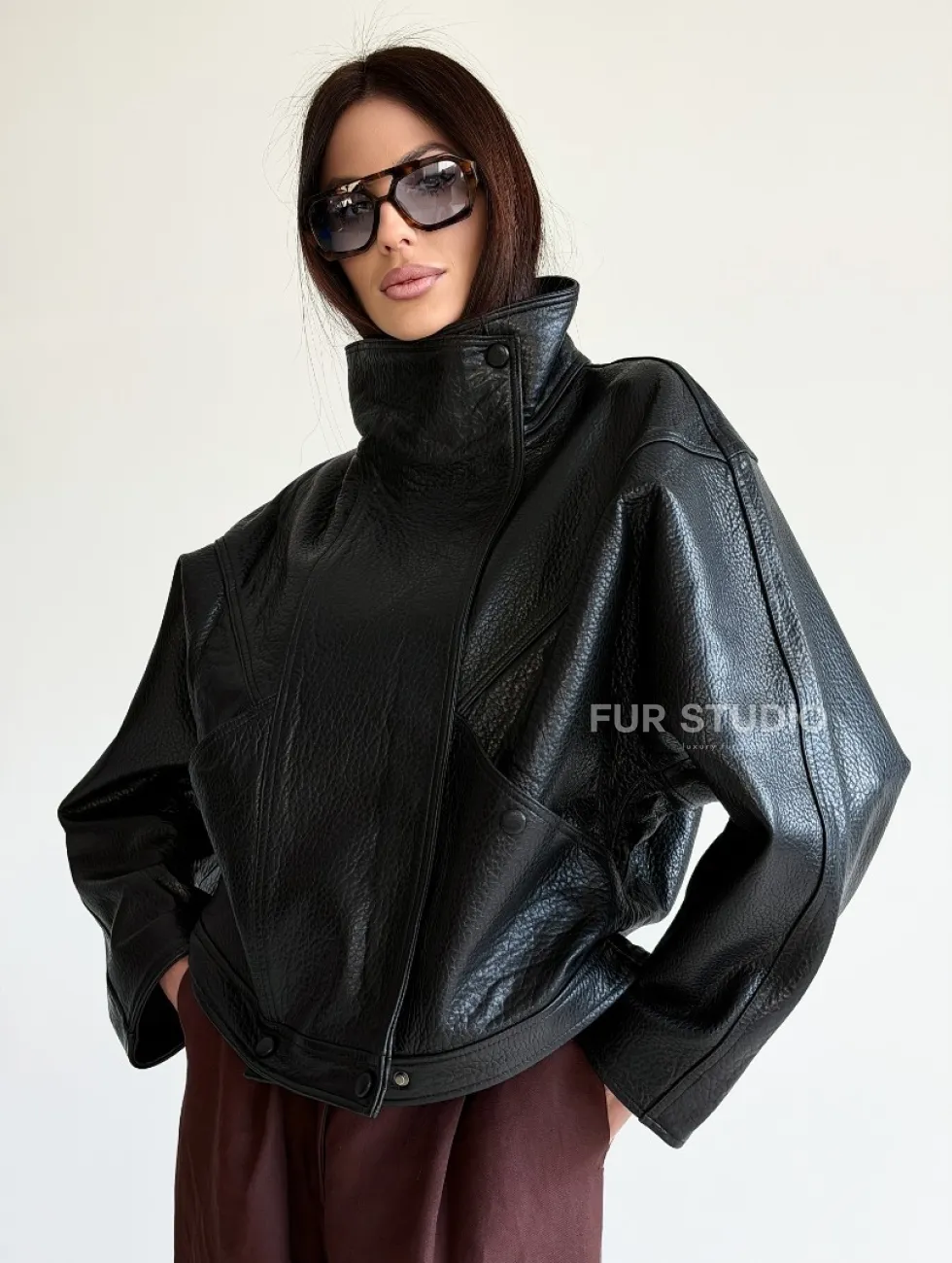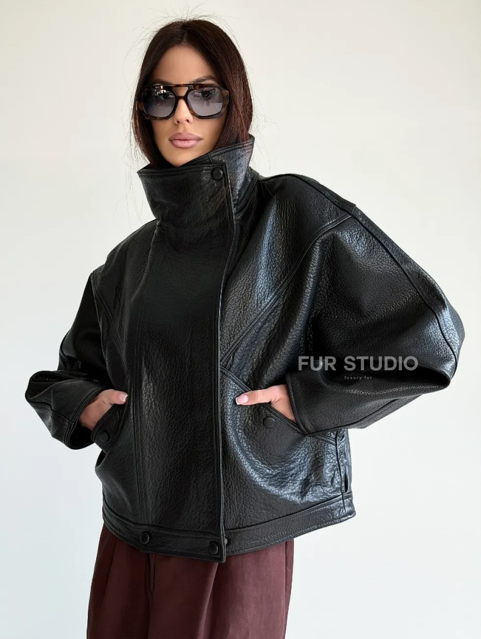 Черная женская кожаная куртка доступна для покупки в нашем шоуруме Furs Studio в Чите, где также предоставляется удобная доставка во все города России.
