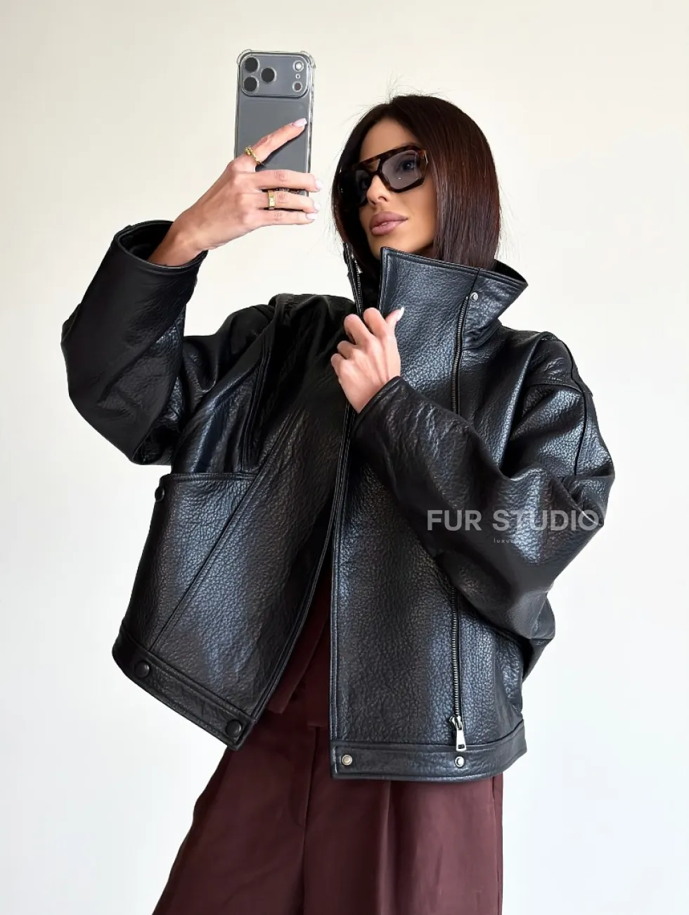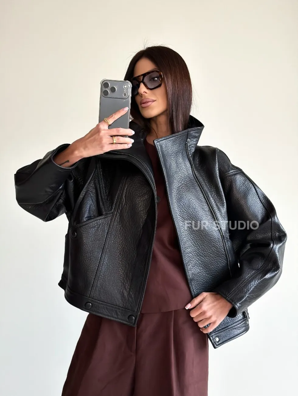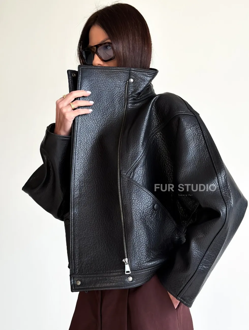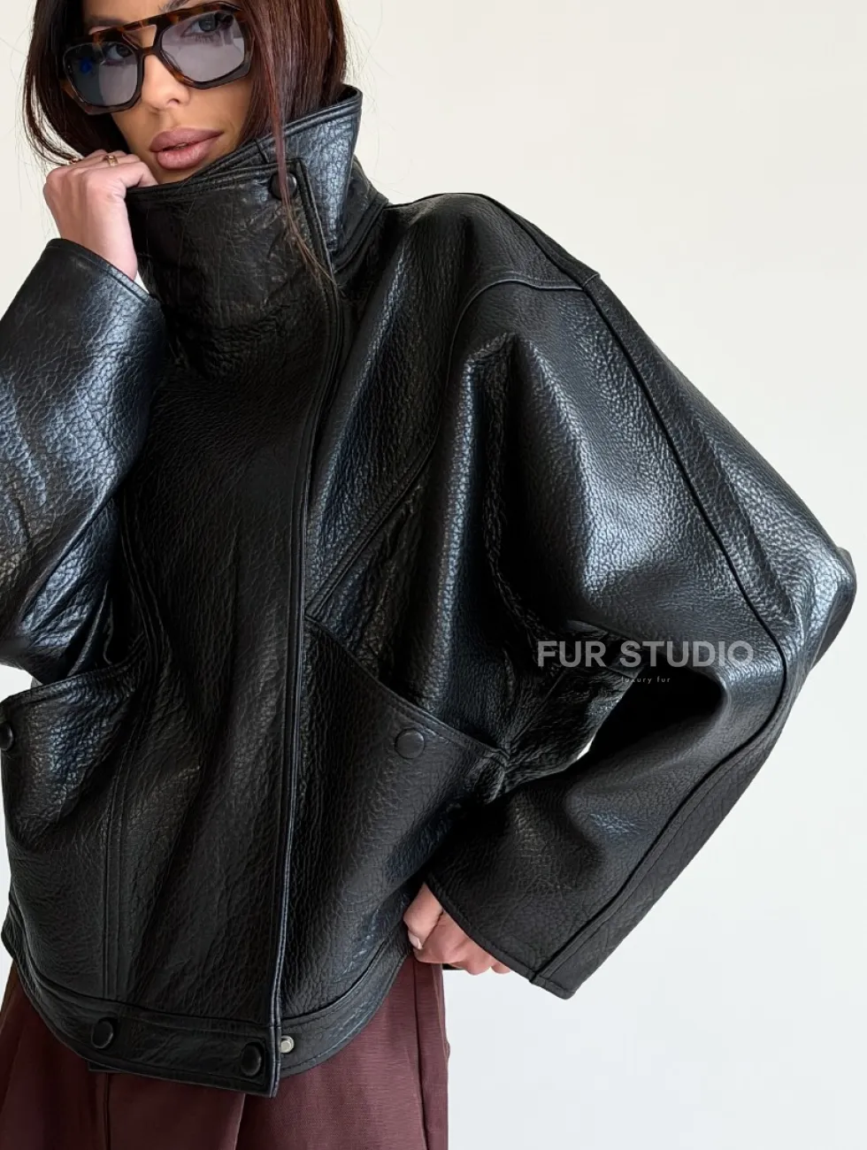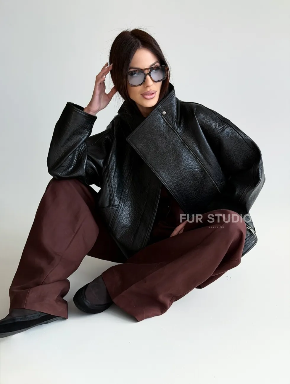 Черная женская кожаная куртка доступна для покупки в нашем шоуруме Furs Studio в Чите, где также предоставляется удобная доставка во все города России.