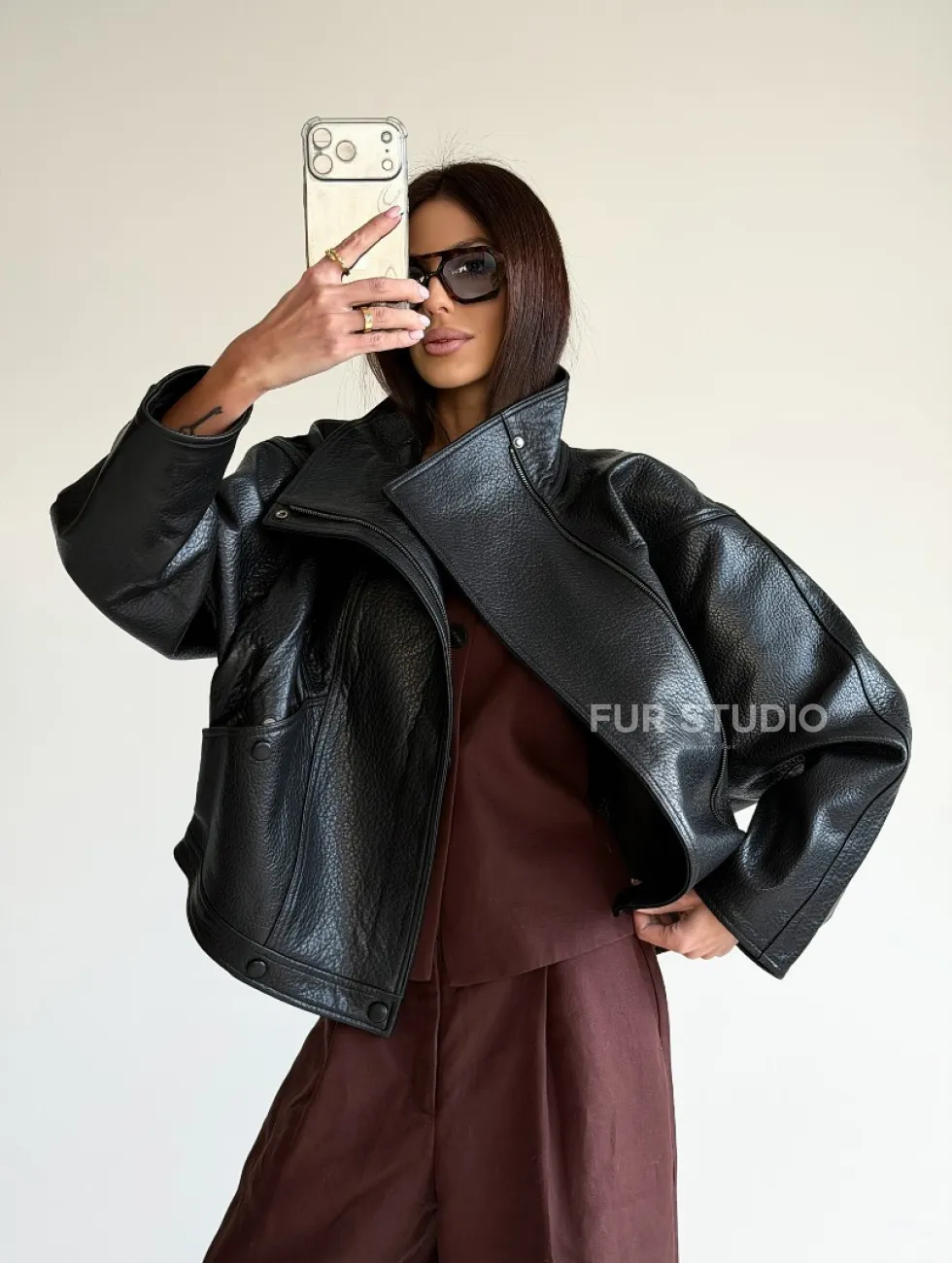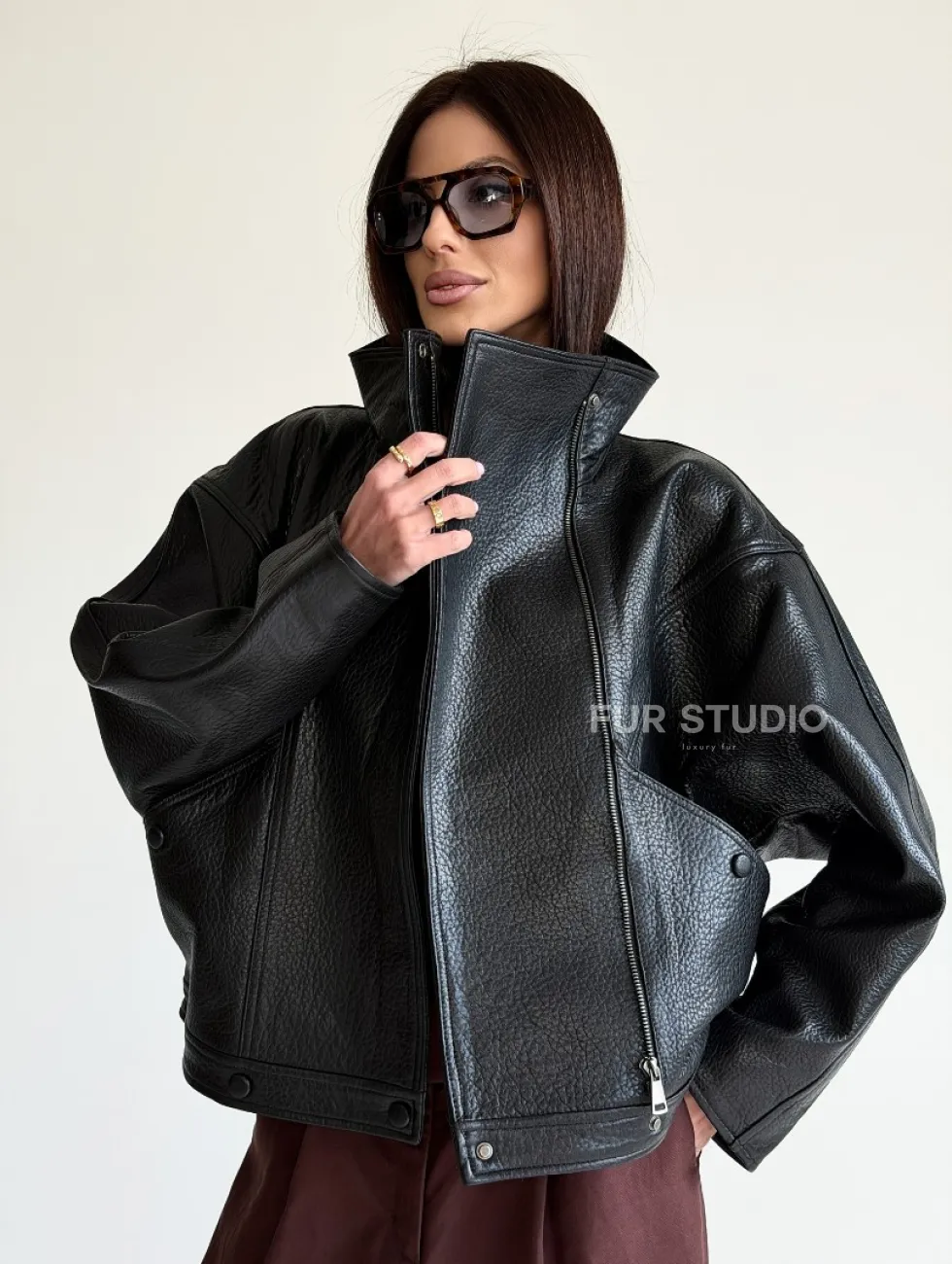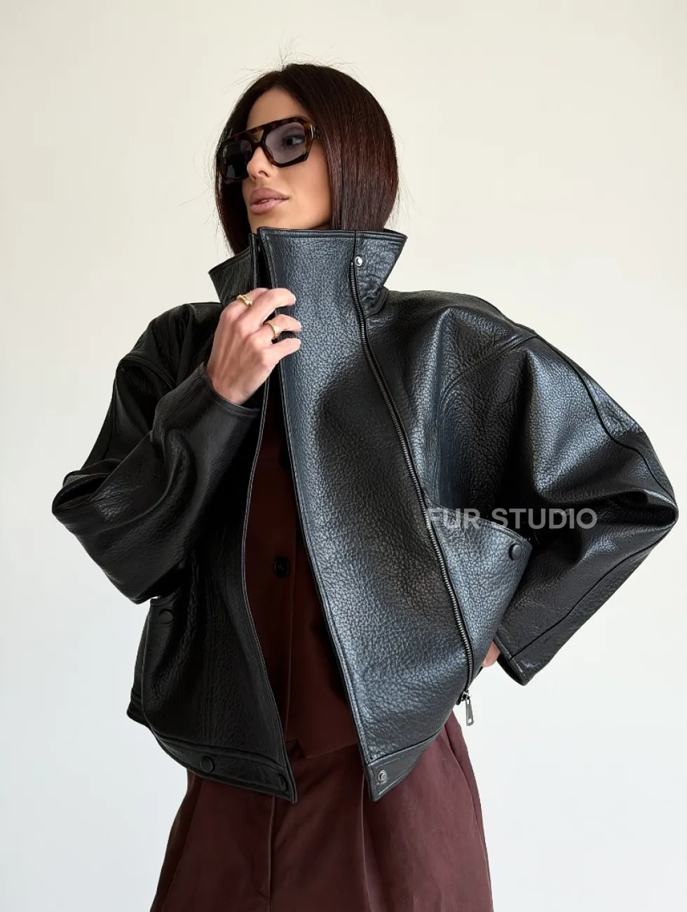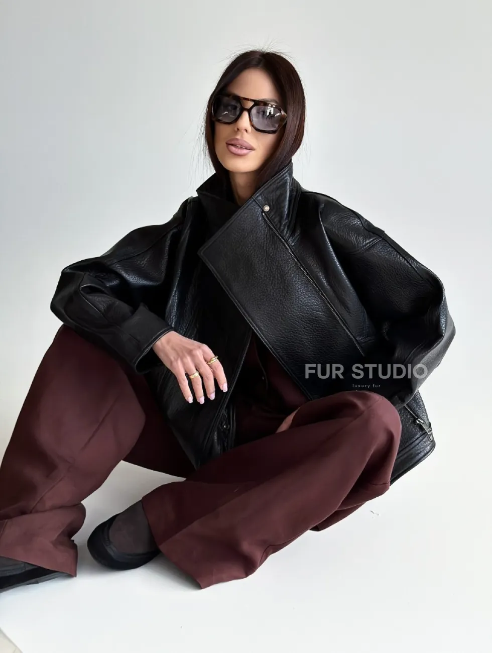 Черная женская кожаная куртка доступна для покупки в нашем шоуруме Furs Studio в Чите, где также предоставляется удобная доставка во все города России.