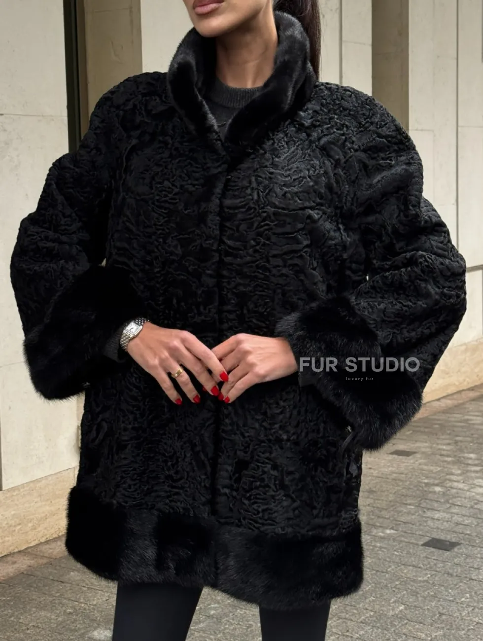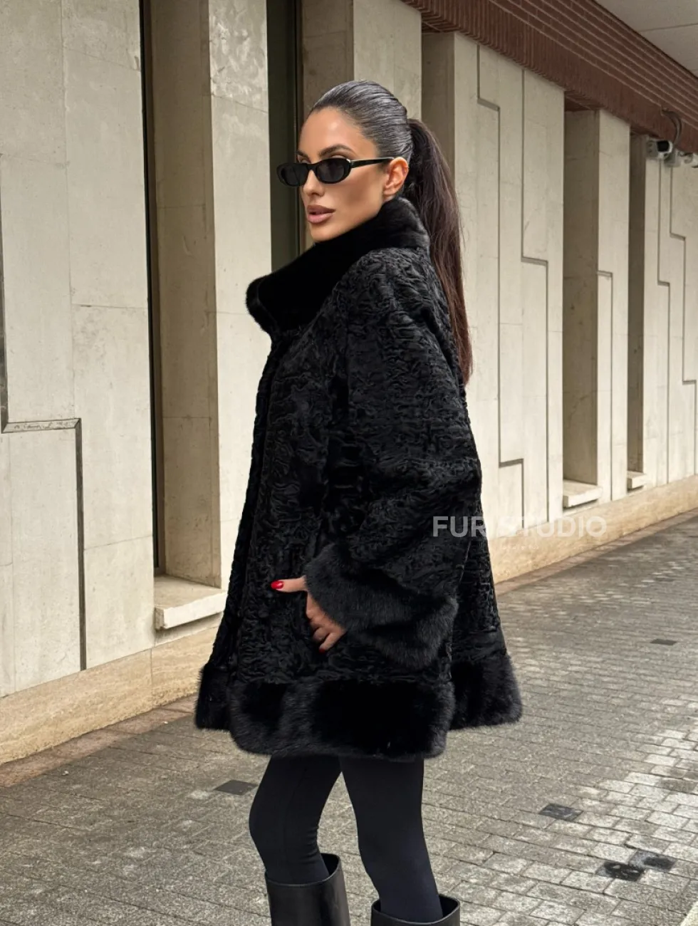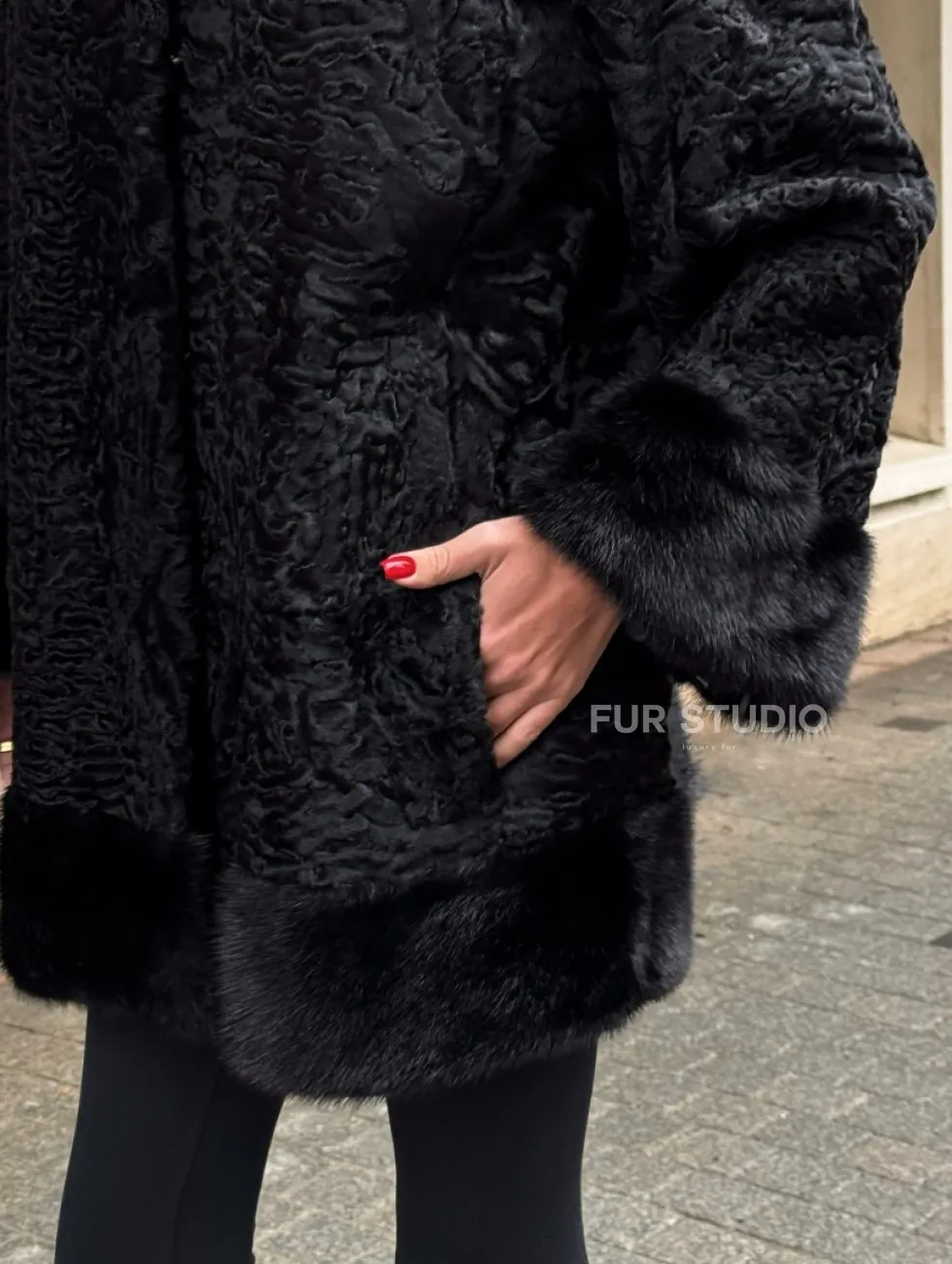 Черное полупальто из меха каракульчи, стойка воротник и манжет из норки доступна для покупки в нашем шоуруме Furs Studio в Чите. У нас так же есть доставка во все города России. Добавьте немного роскоши в свой гардероб с этой шубой, которая будет служить вам многие годы.