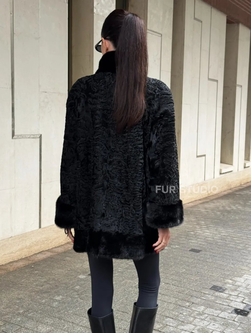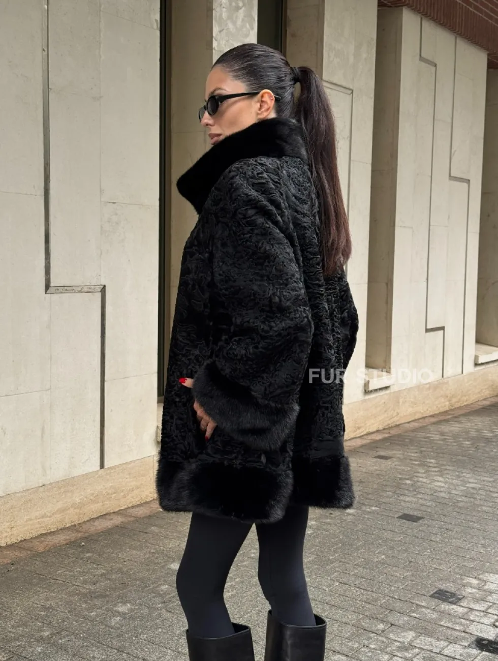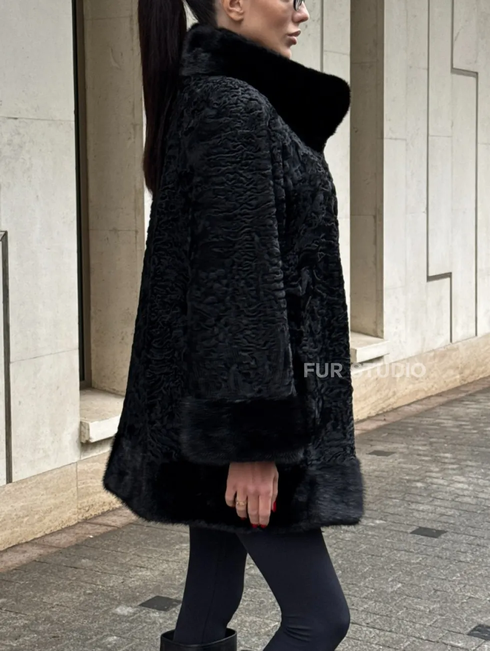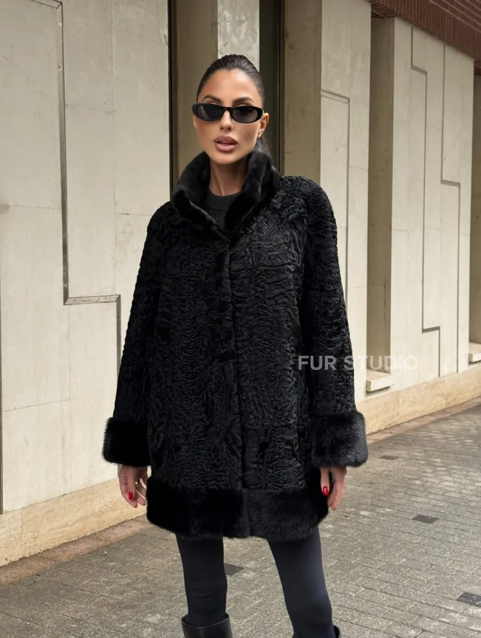 Черное полупальто из меха каракульчи, стойка воротник и манжет из норки доступна для покупки в нашем шоуруме Furs Studio в Чите. У нас так же есть доставка во все города России. Добавьте немного роскоши в свой гардероб с этой шубой, которая будет служить вам многие годы.