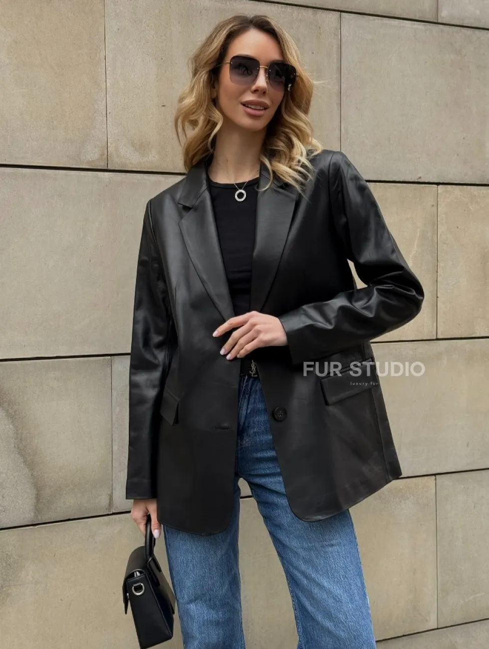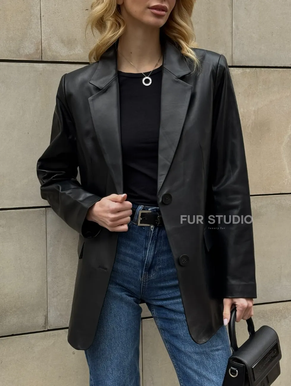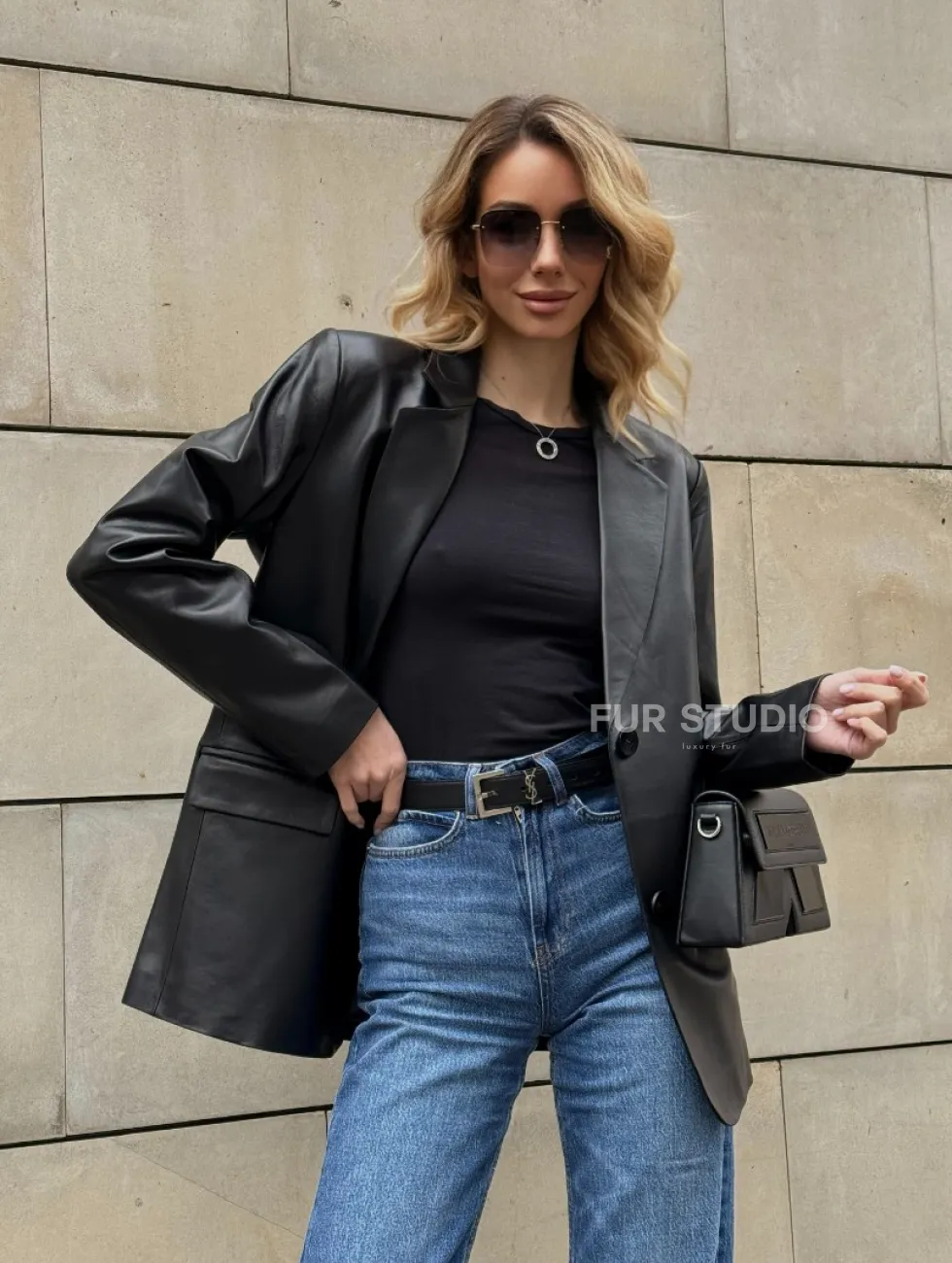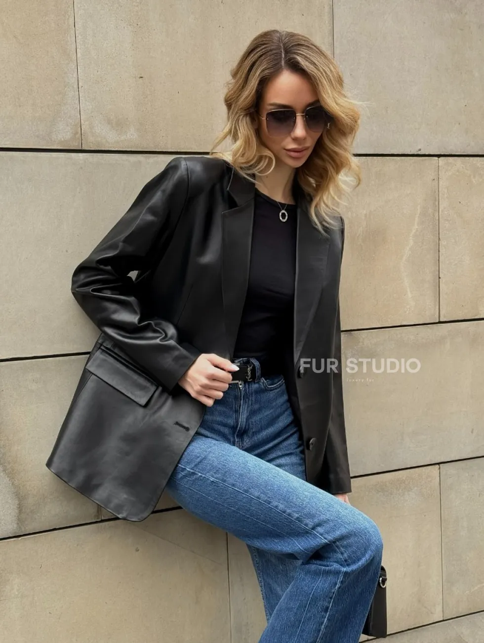 Черный кожаный пиджак классического кроя с клапанами на карманах доступна для покупки в нашем шоуруме Furs Studio в Чите, где также предоставляется удобная доставка во все города России.
