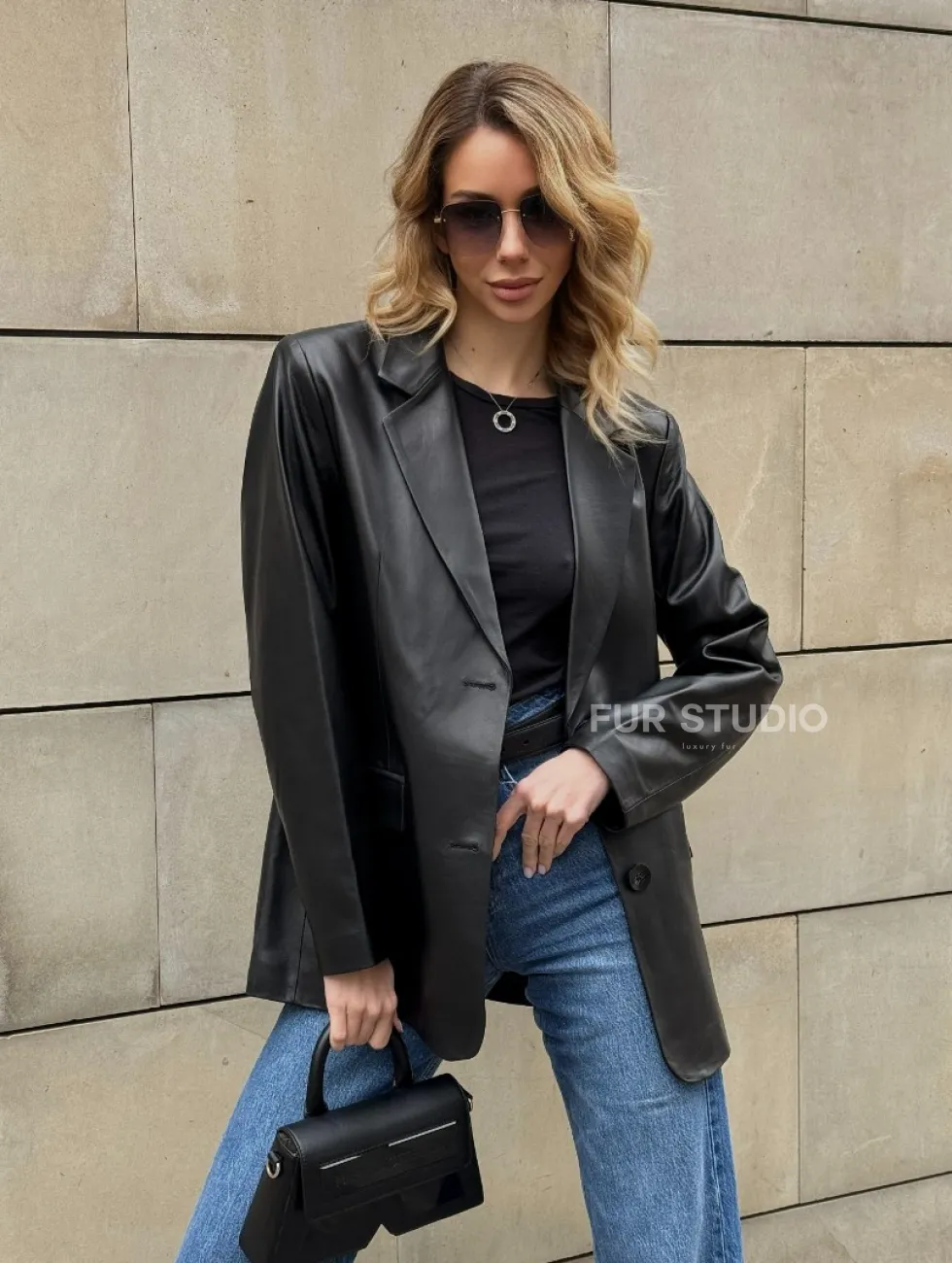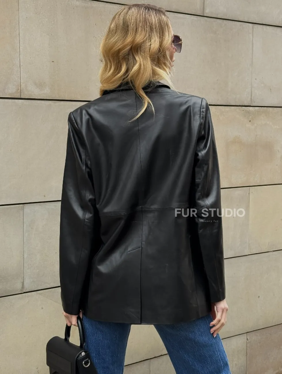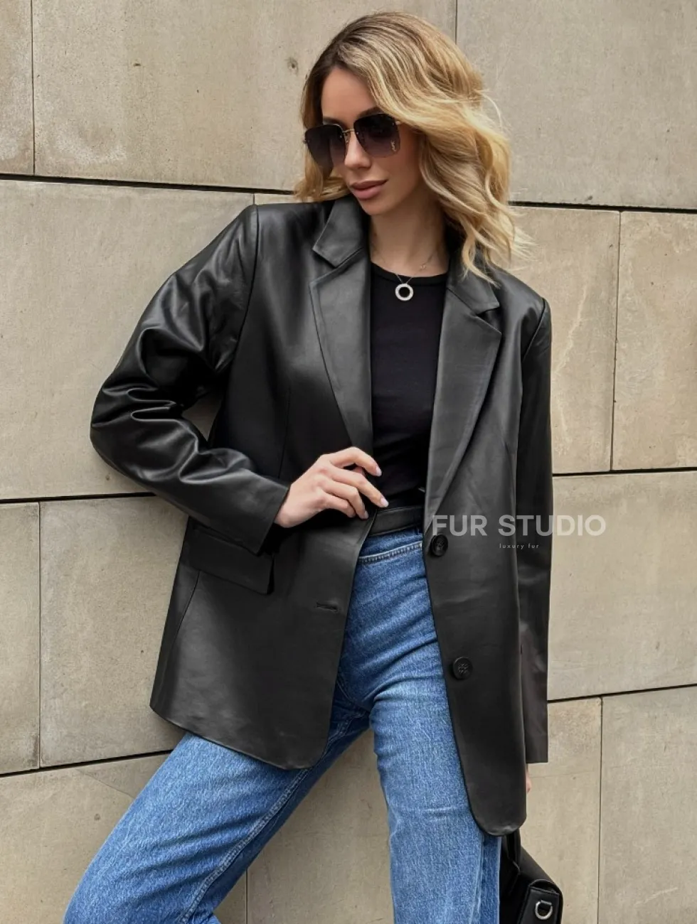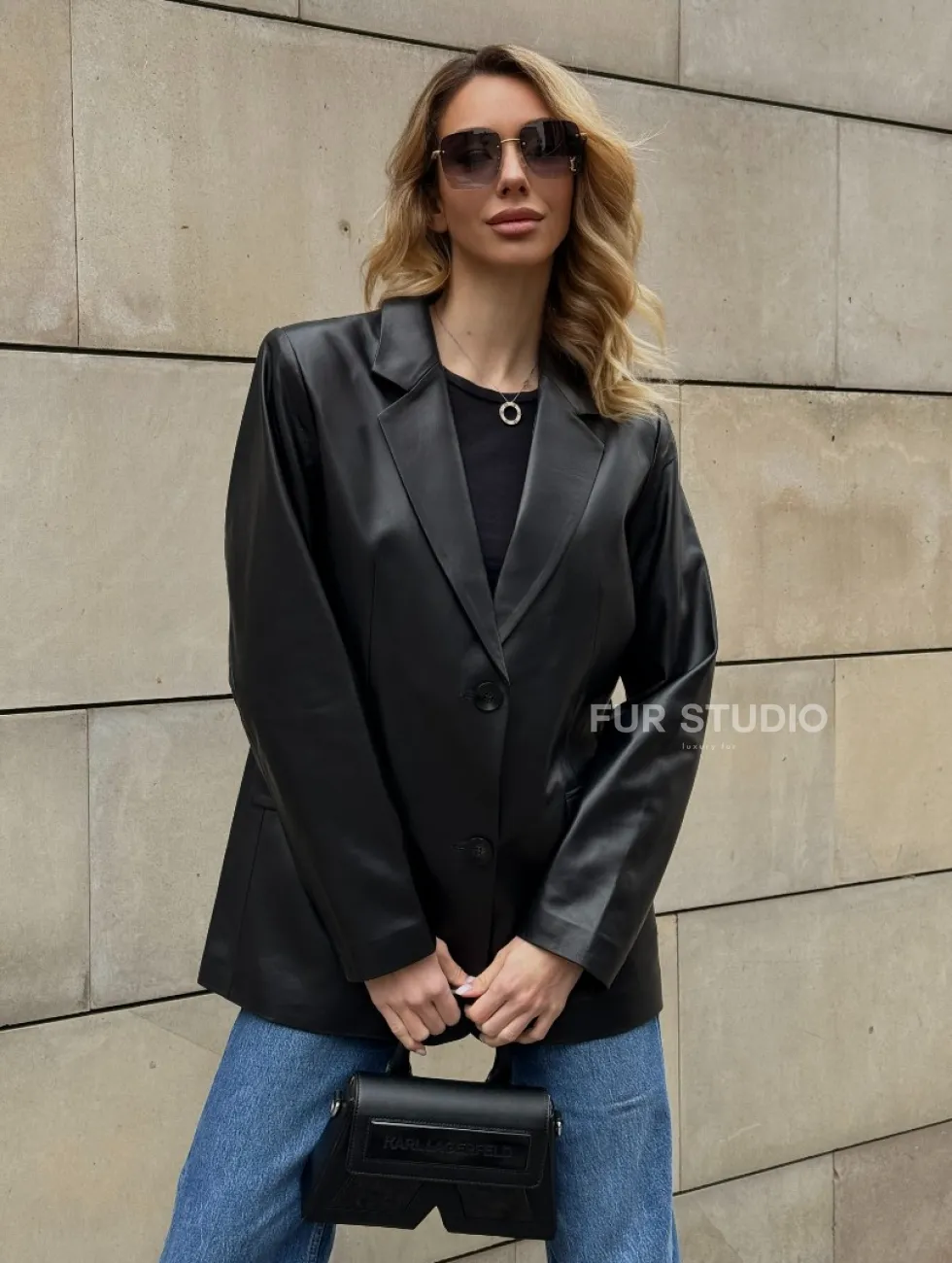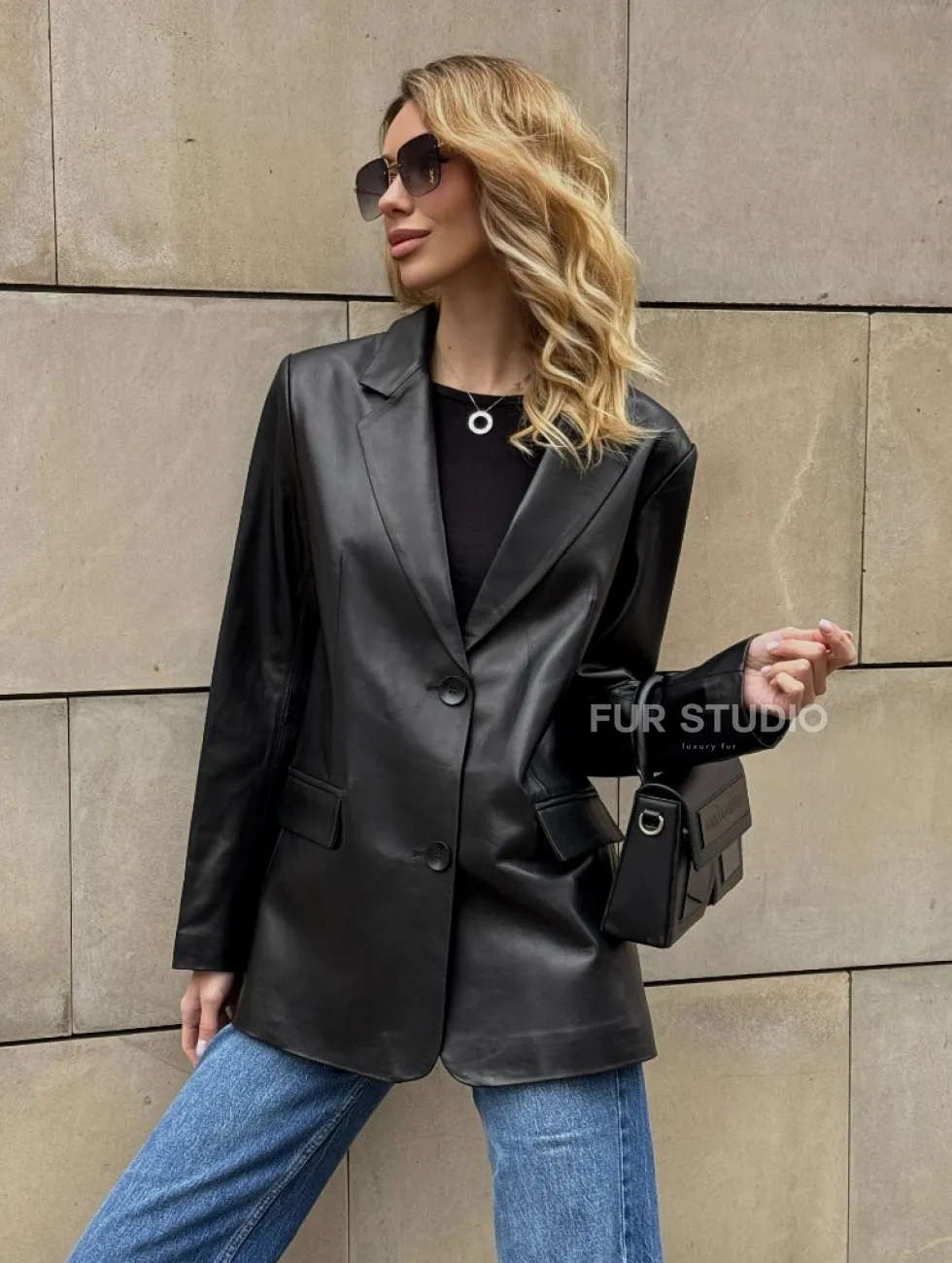 Черный кожаный пиджак классического кроя с клапанами на карманах доступна для покупки в нашем шоуруме Furs Studio в Чите, где также предоставляется удобная доставка во все города России.