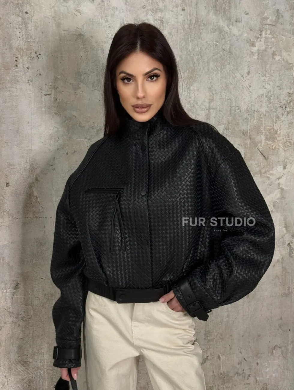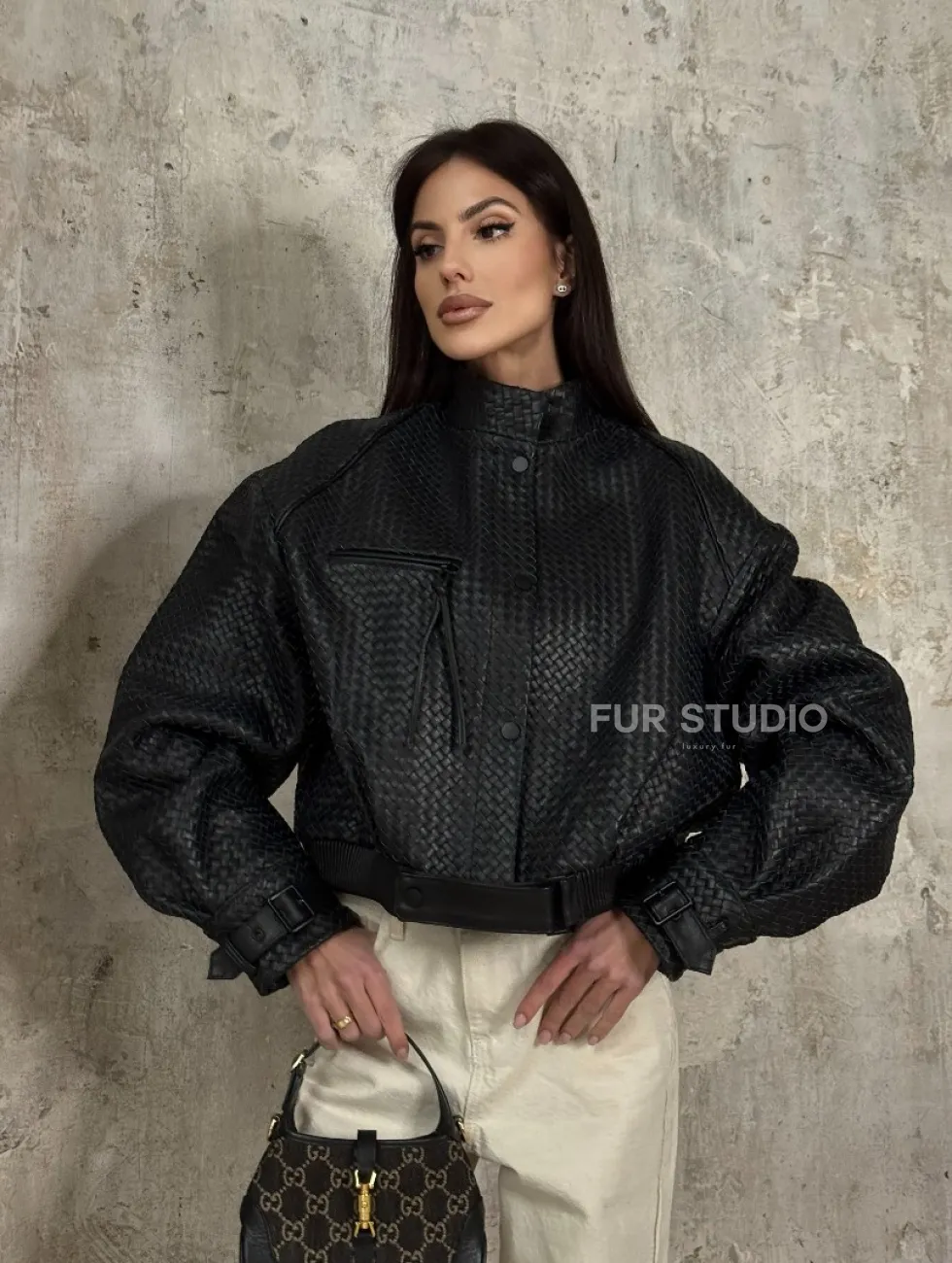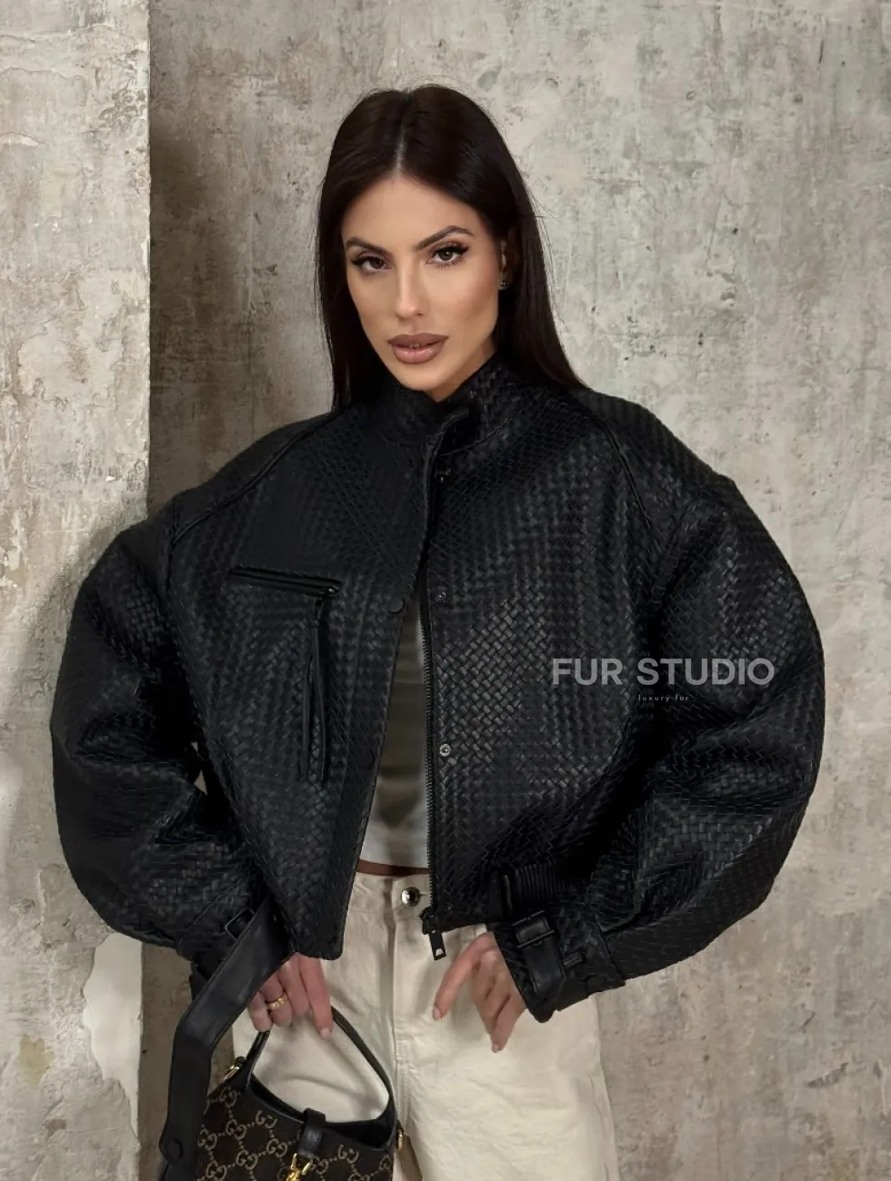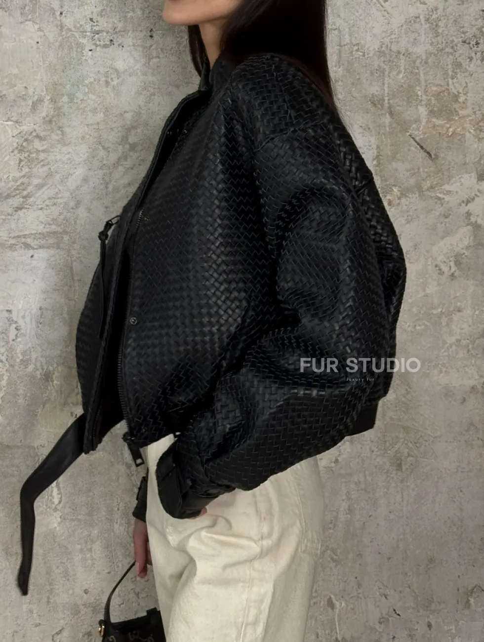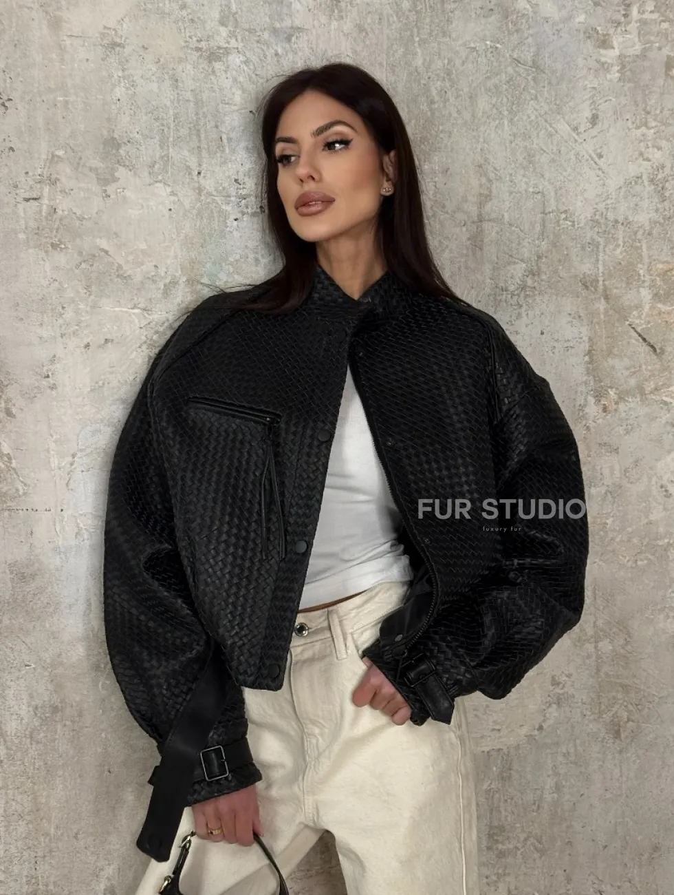 Черный женский бомбер из плетеной натуральной кожи доступна для покупки в нашем шоуруме Furs Studio в Чите, где также предоставляется удобная доставка во все города России.