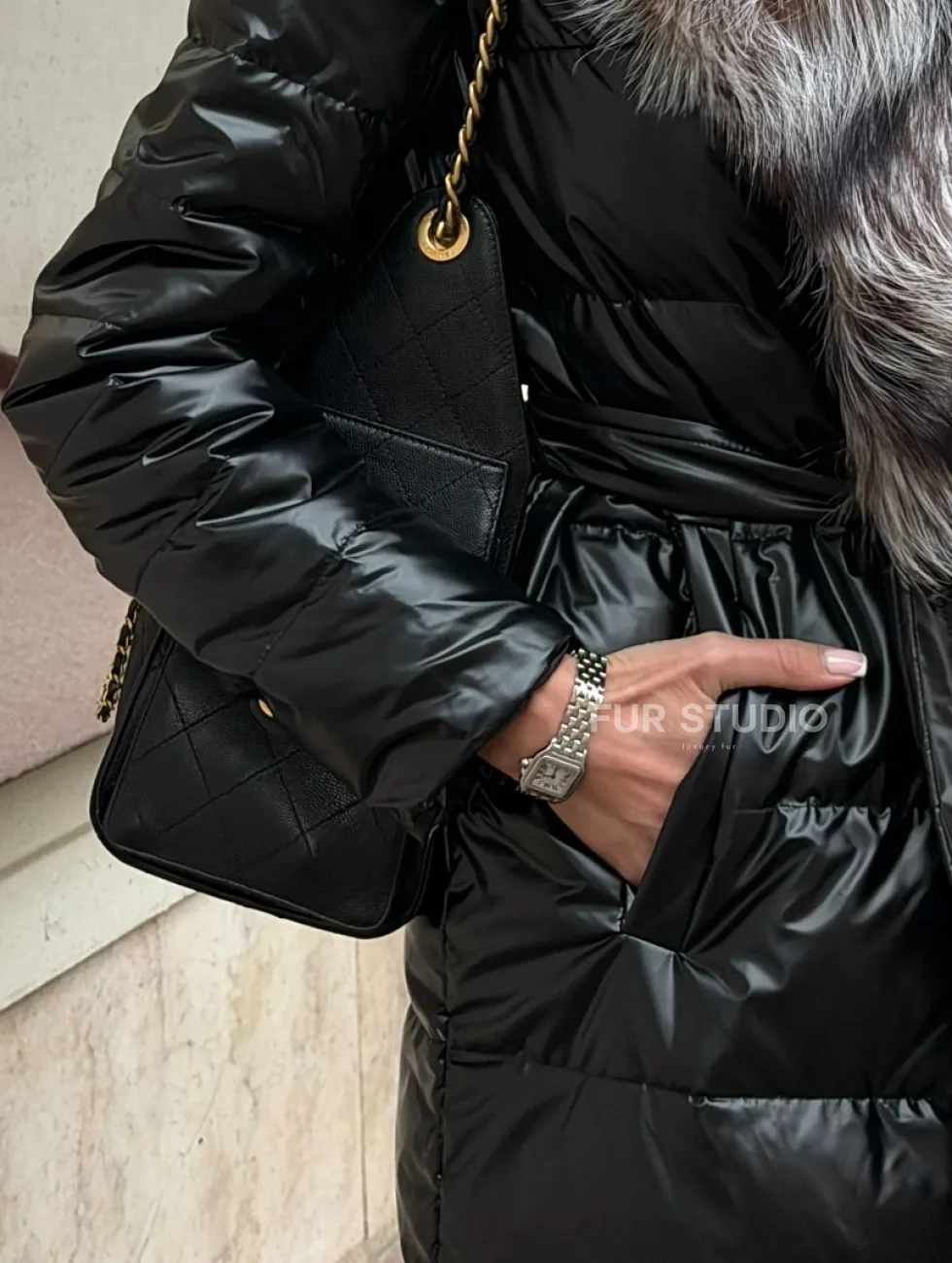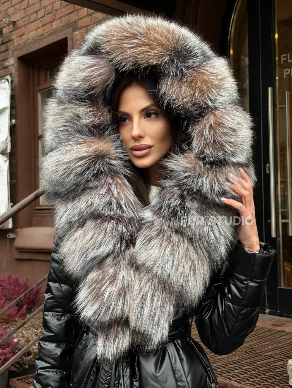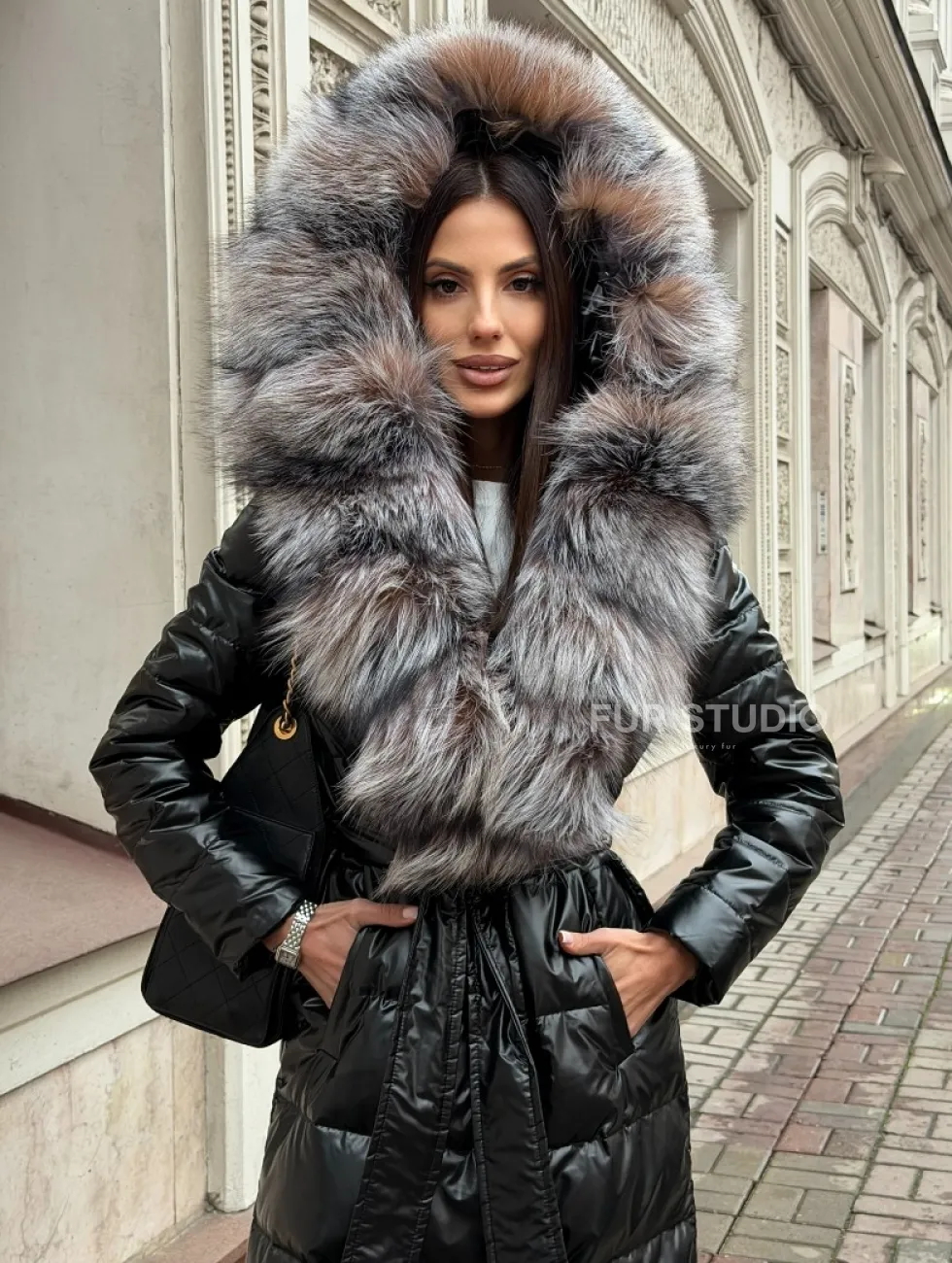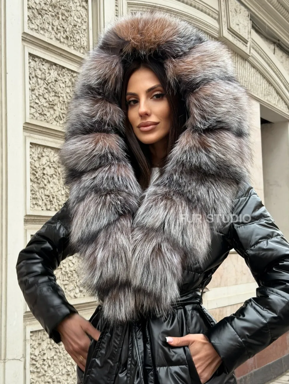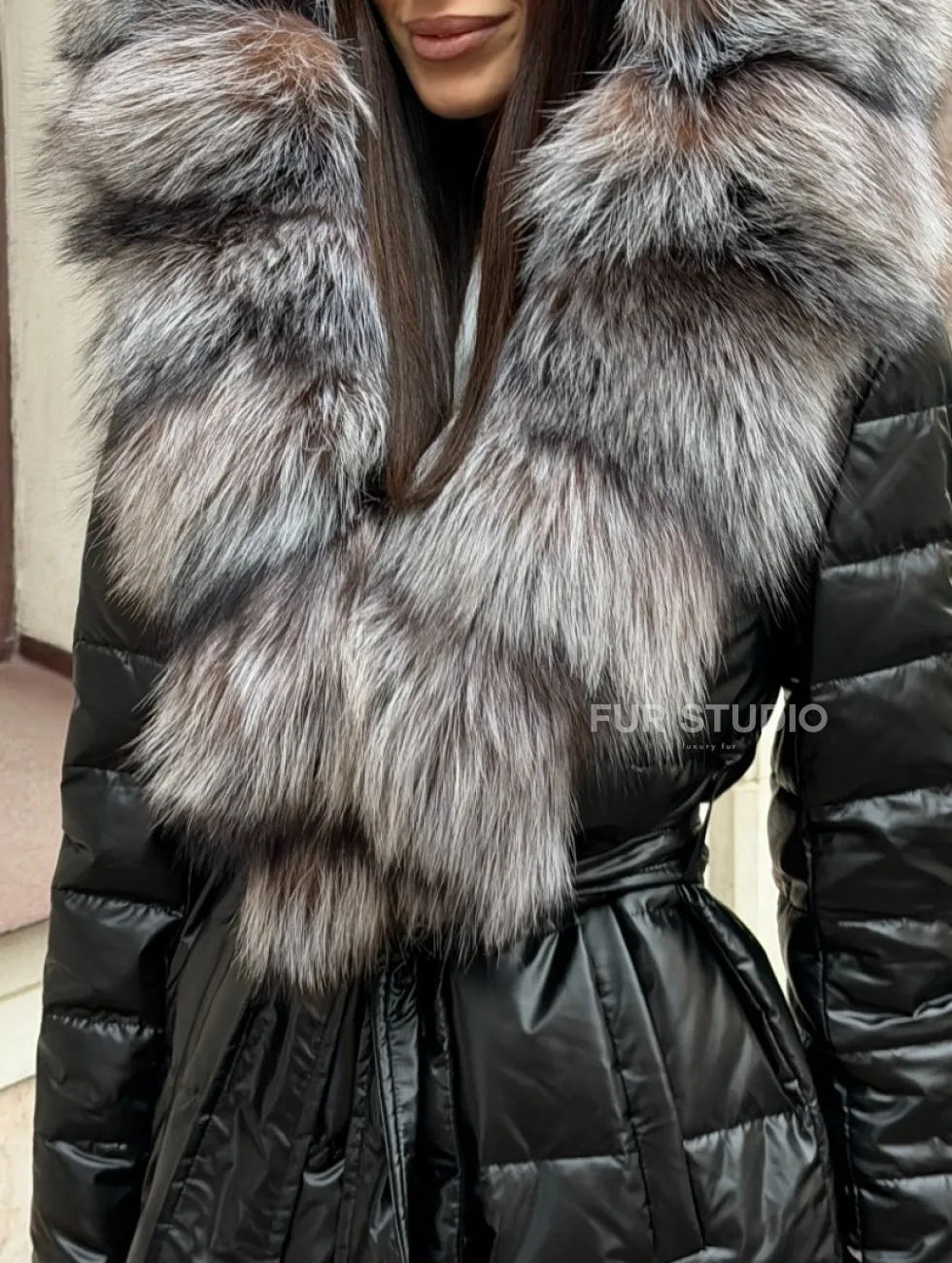 Чёрное пуховое пальто с меховым капюшоном из чернобурки 102744