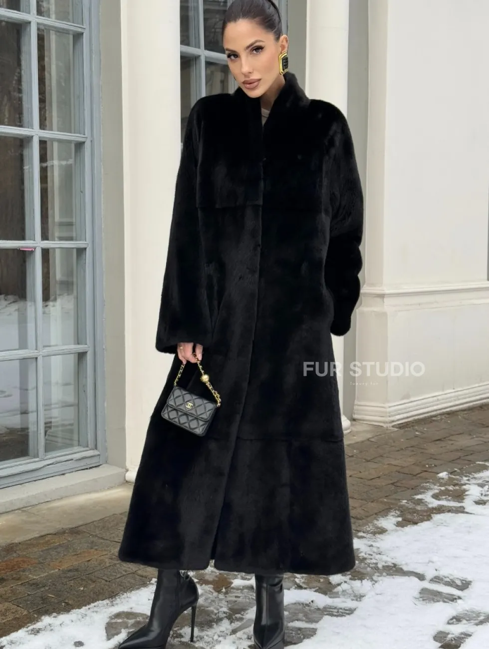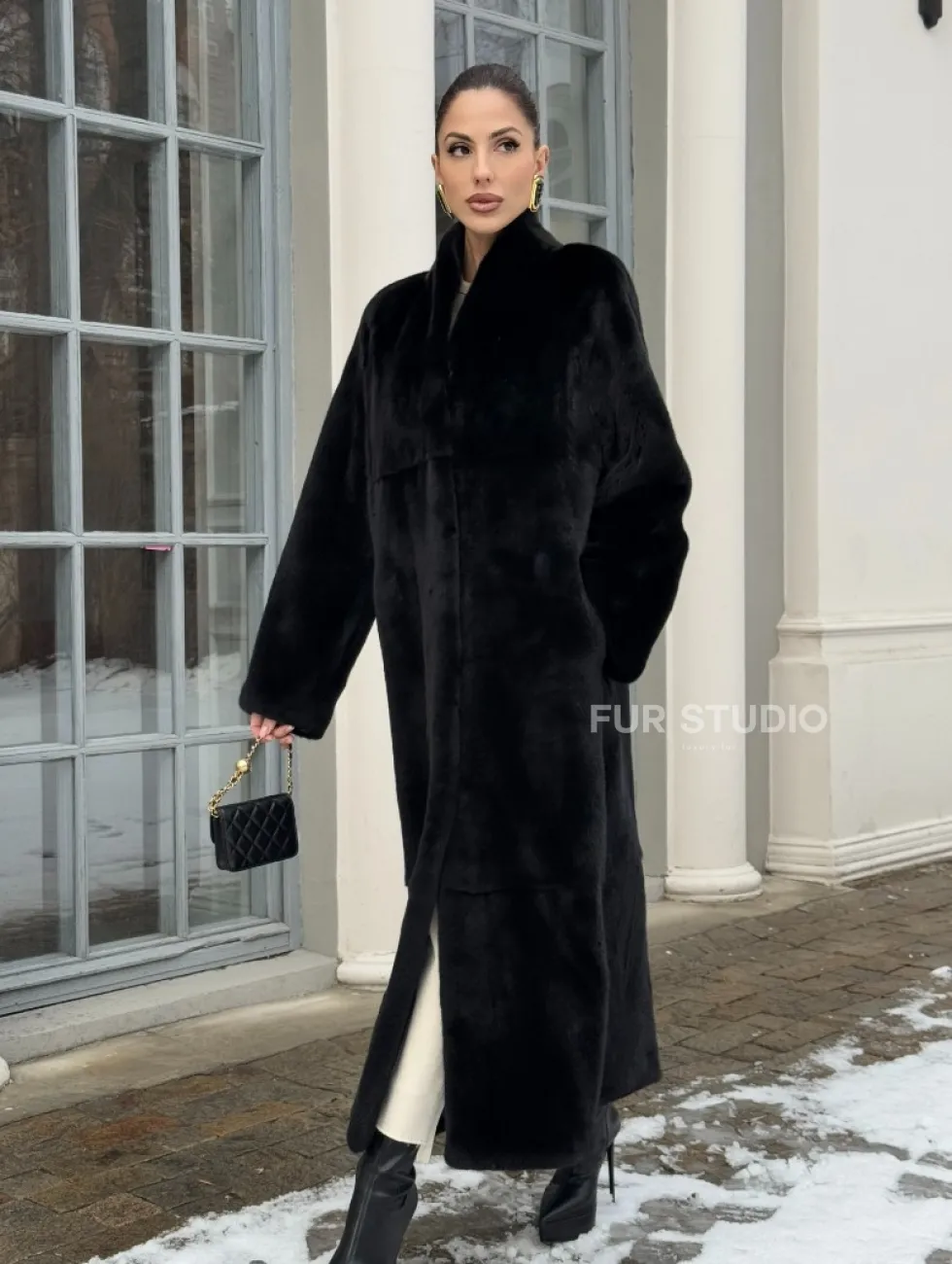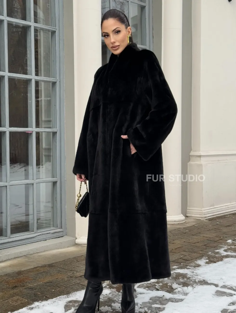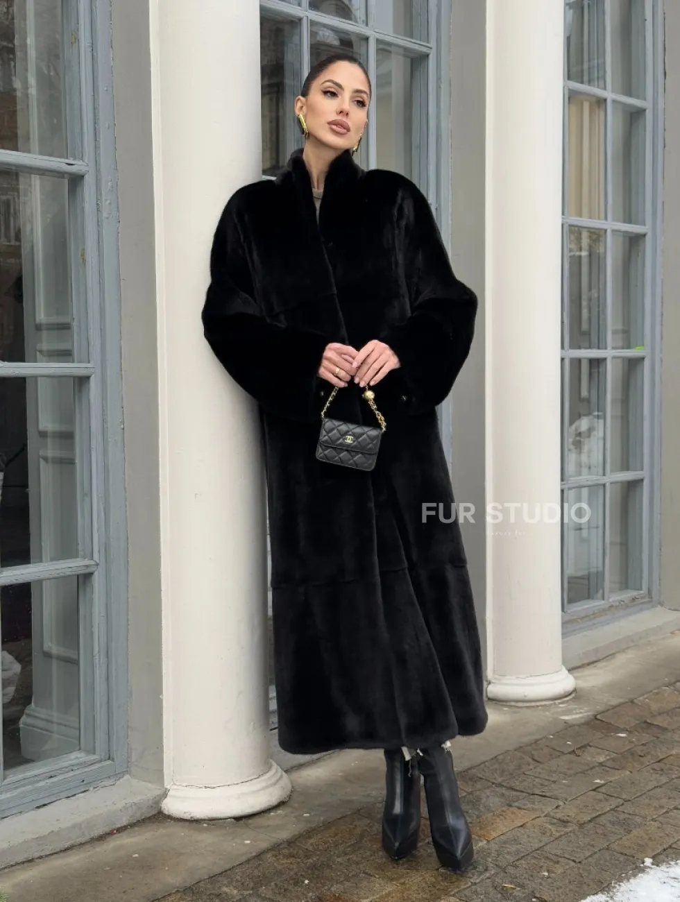 Мех данной шубы скандинавская норка, цвет черный. Предлагается в размерах от 44 до 48 с (50 по 54 индивидуальный пошив). Длина модели 125-130 см, что выгодно подчеркивает фигуру девушек. Эта модель идеально подойдет для девушек и женщин, предпочитающих роскошные натуральные меха.