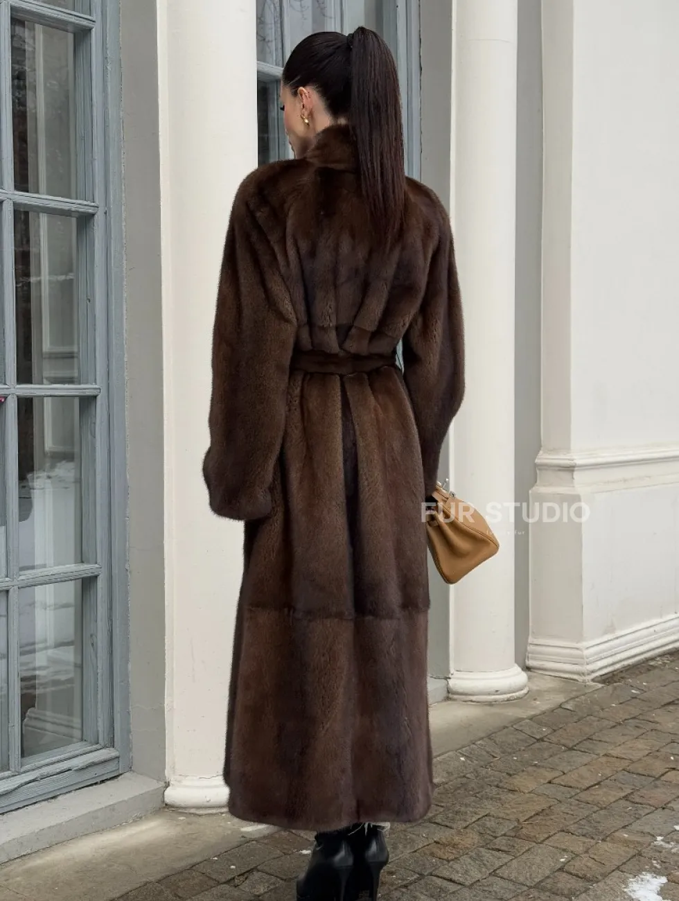 Мех данной шубы аукционная норка , цвет коричневый. Предлагается в размерах от 44 до 48. Длина модели 125-130 см, что выгодно подчеркивает фигуру девушек. Эта модель идеально подойдет для девушек и женщин, предпочитающих роскошные натуральные меха.