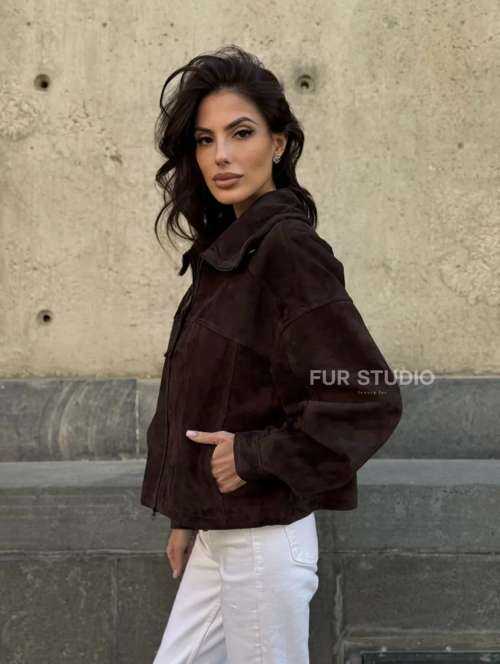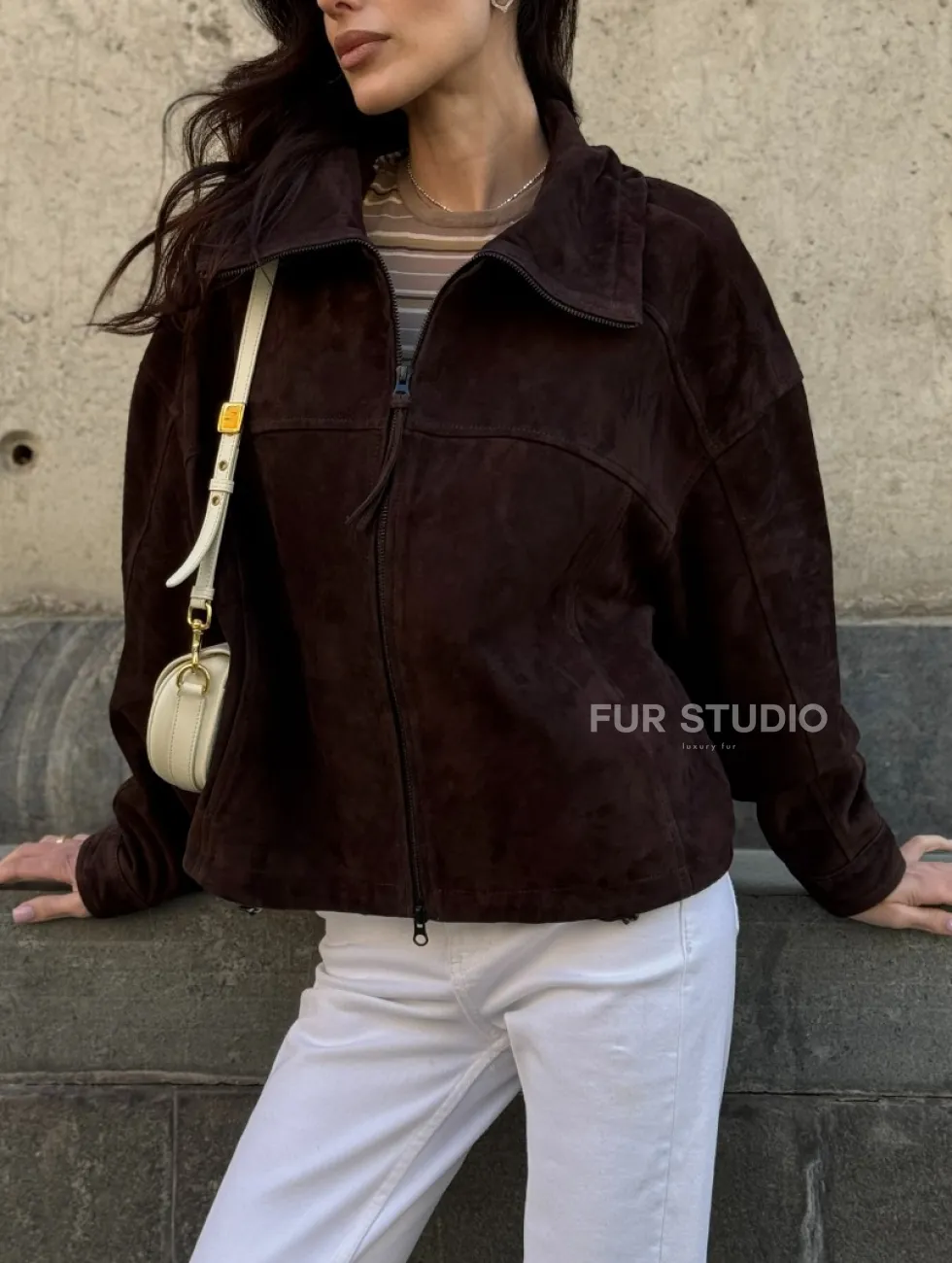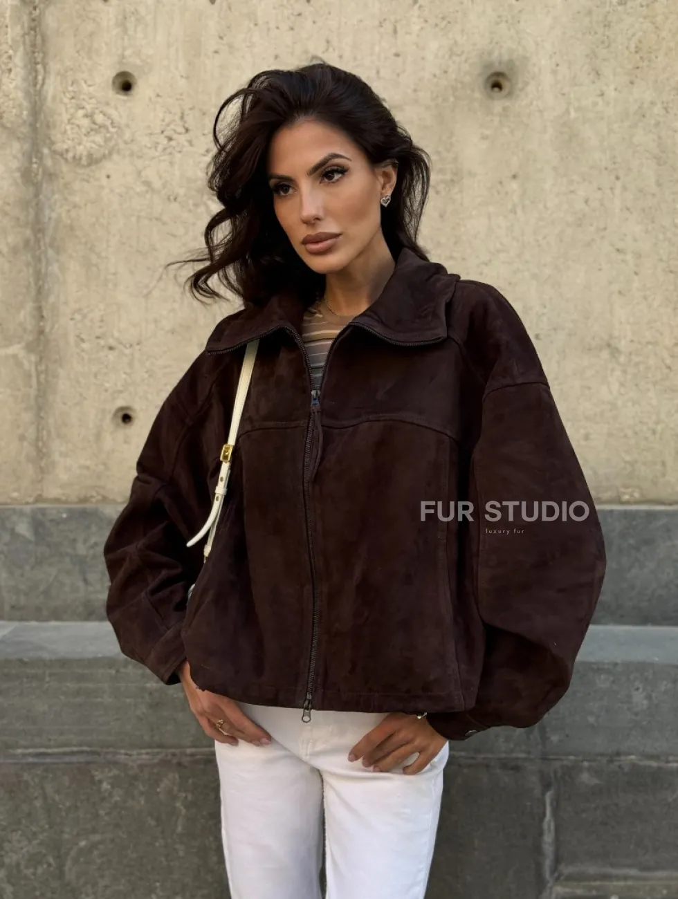 Демисезонная короткая замшевая куртка "Весна-лето 2025" доступна для покупки в нашем шоуруме Furs Studio в Чите, где также предоставляется удобная доставка во все города России.
