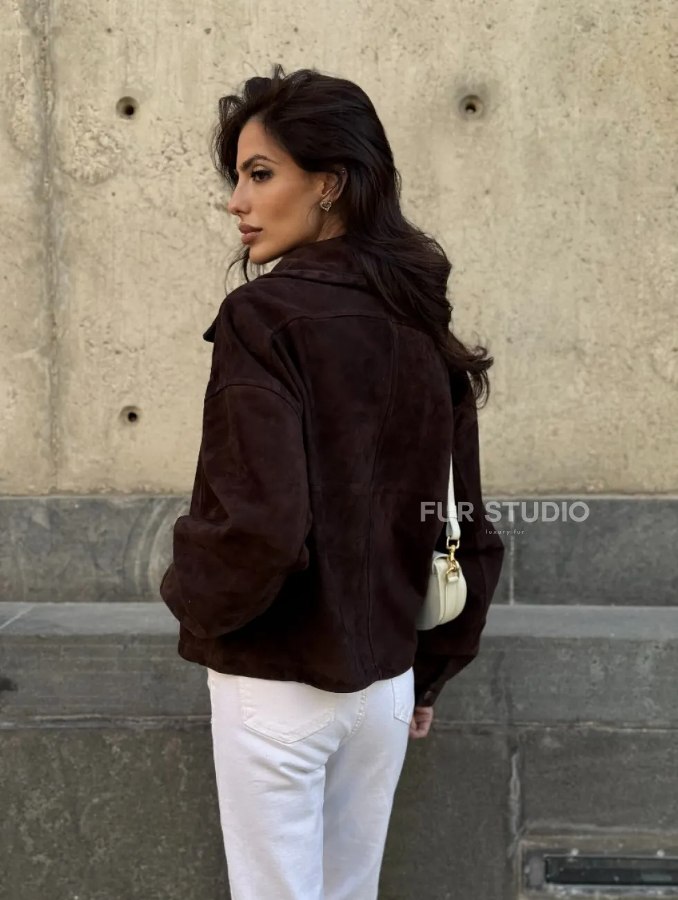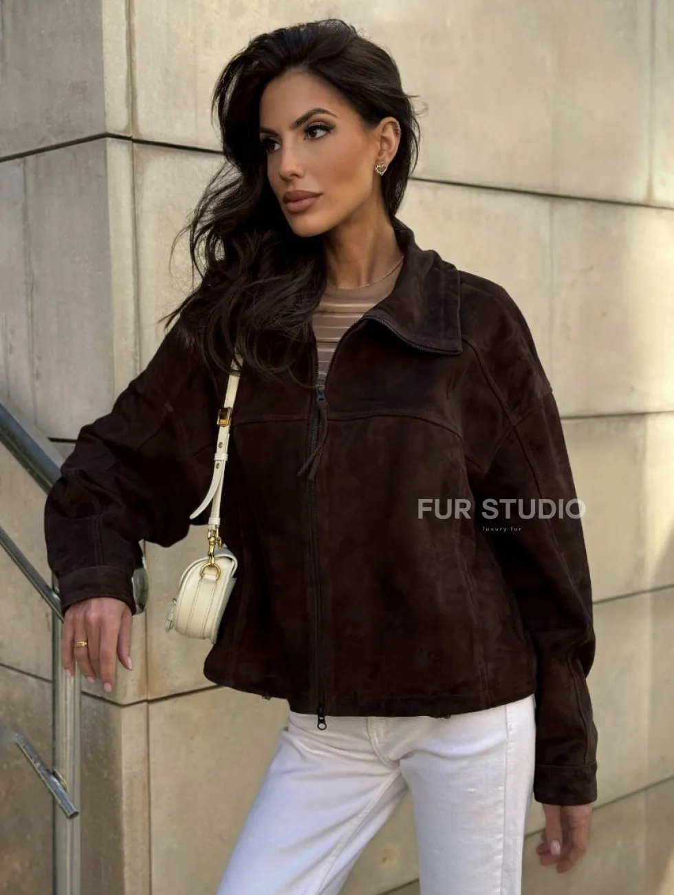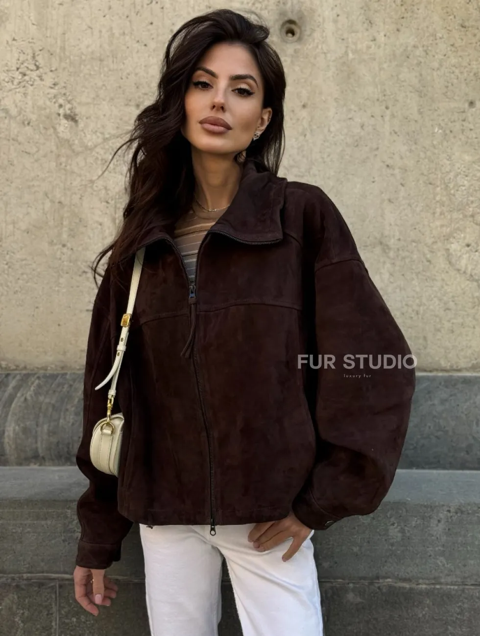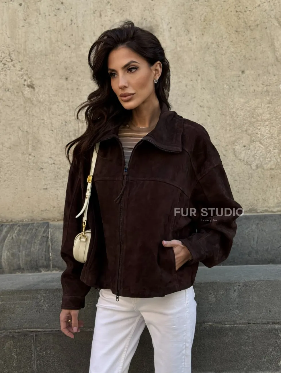 Демисезонная короткая замшевая куртка "Весна-лето 2025" доступна для покупки в нашем шоуруме Furs Studio в Чите, где также предоставляется удобная доставка во все города России.