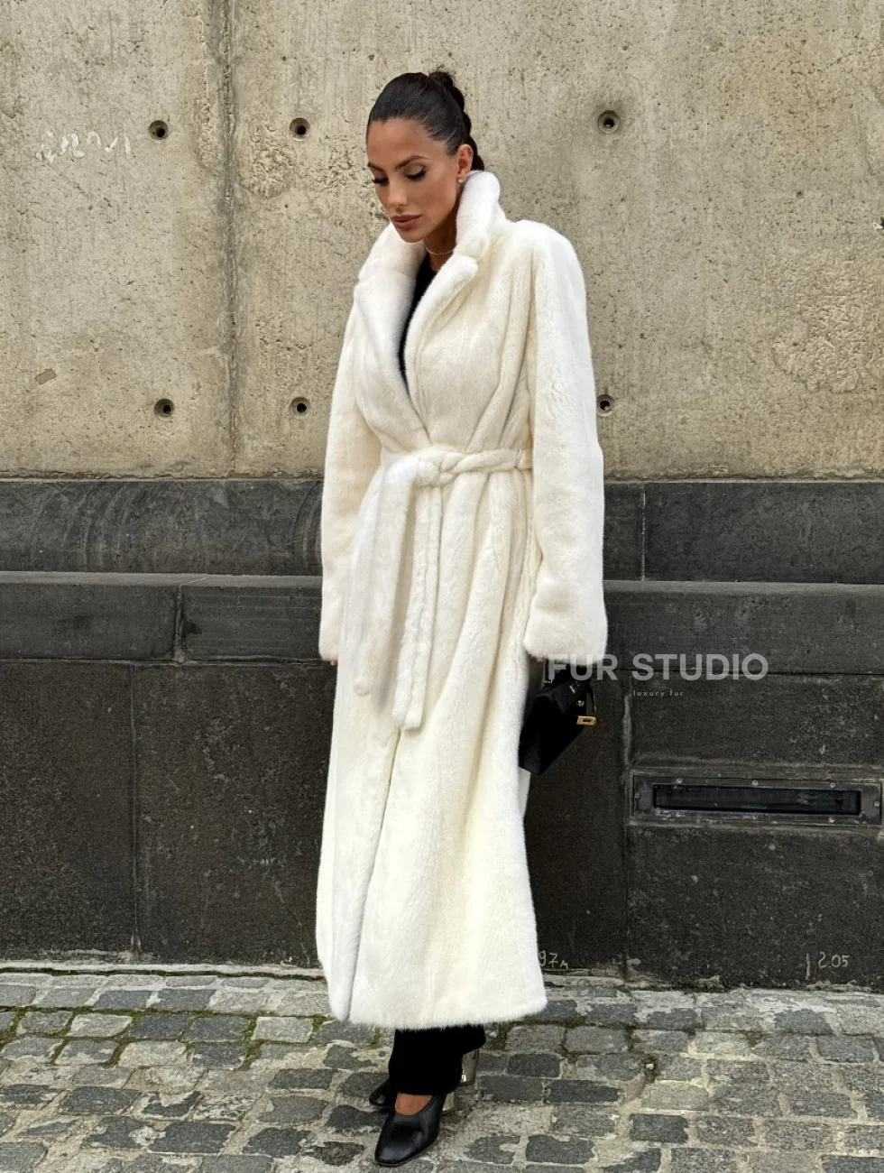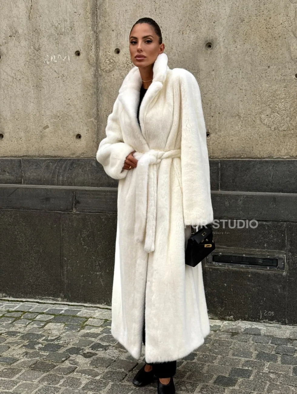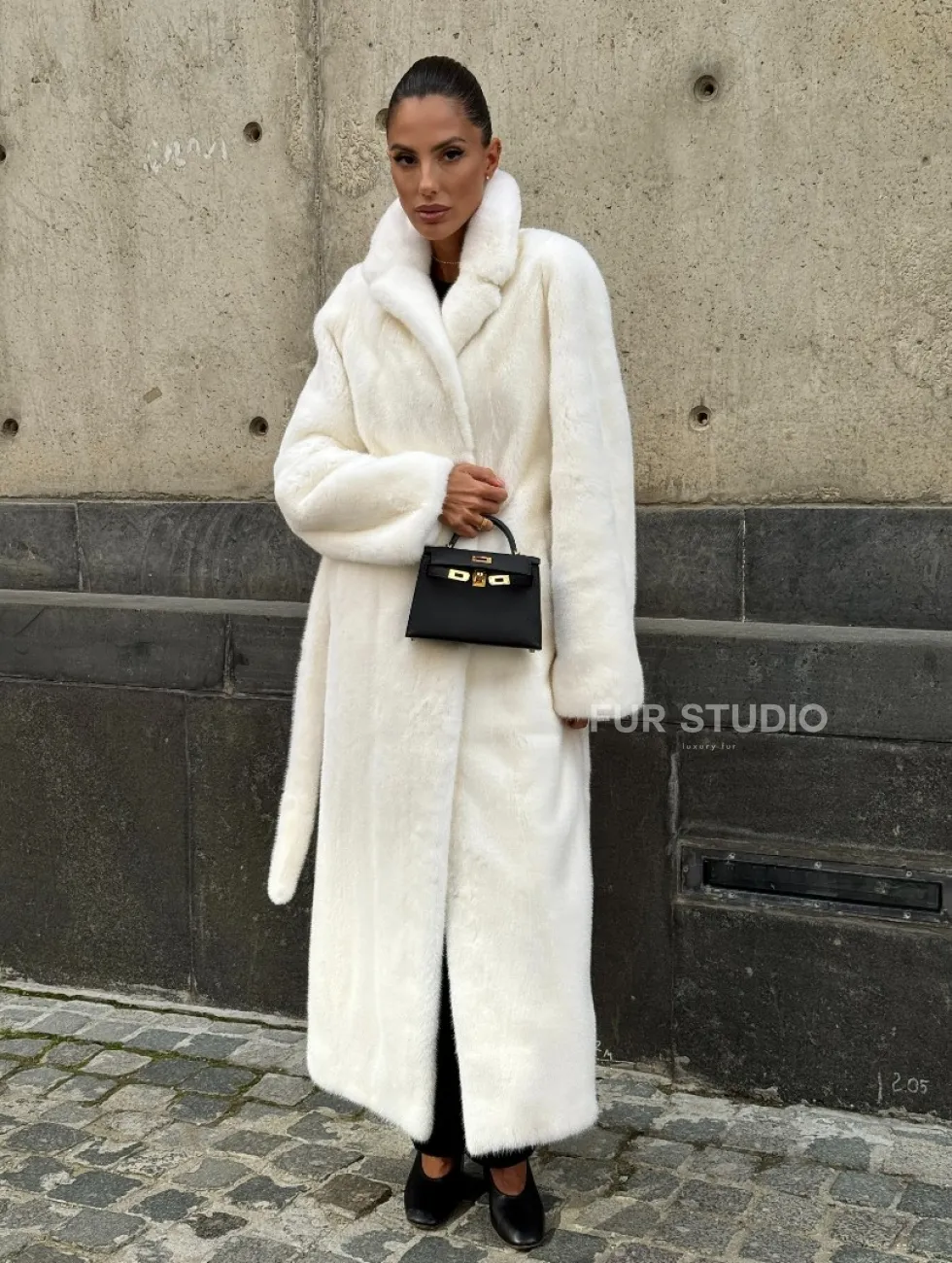 Роскошные рукава добавляют изысканности модели. Шикарные карманы позаботятся о комфорте ручек. Миниатюрная сумочка и грубая обувь сделают ваш образ гармоничным. Качество изделия будет радовать многие годы. Купить белую шубу из плюшевой норки с английским воротником могут дамы, которые обладают безукоризненным вкусом стиля.