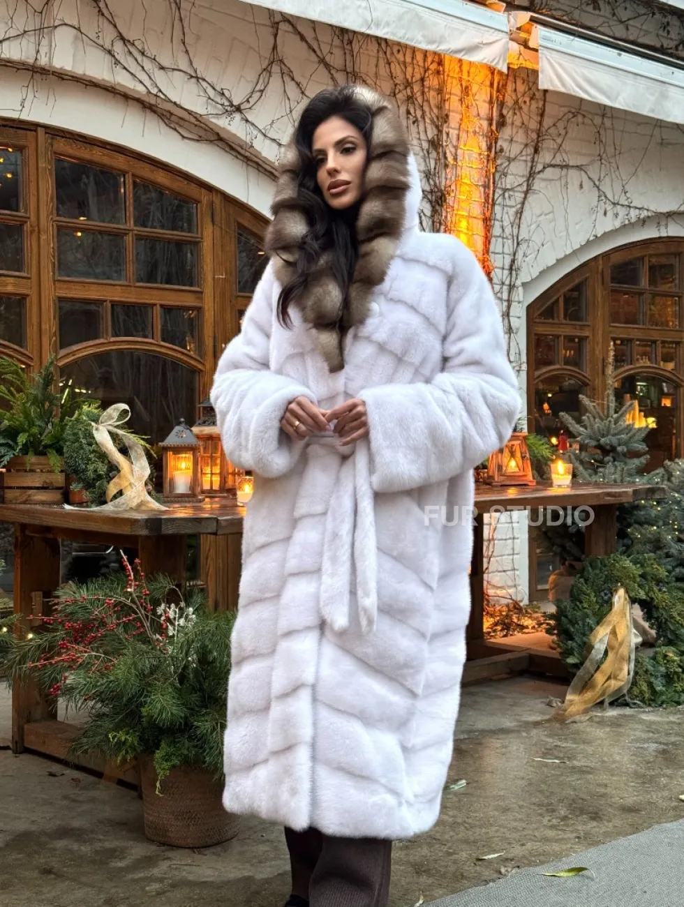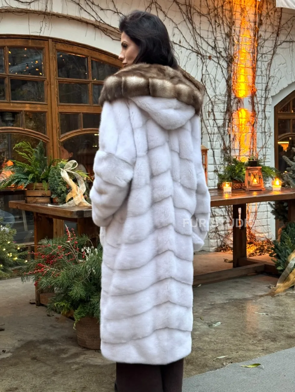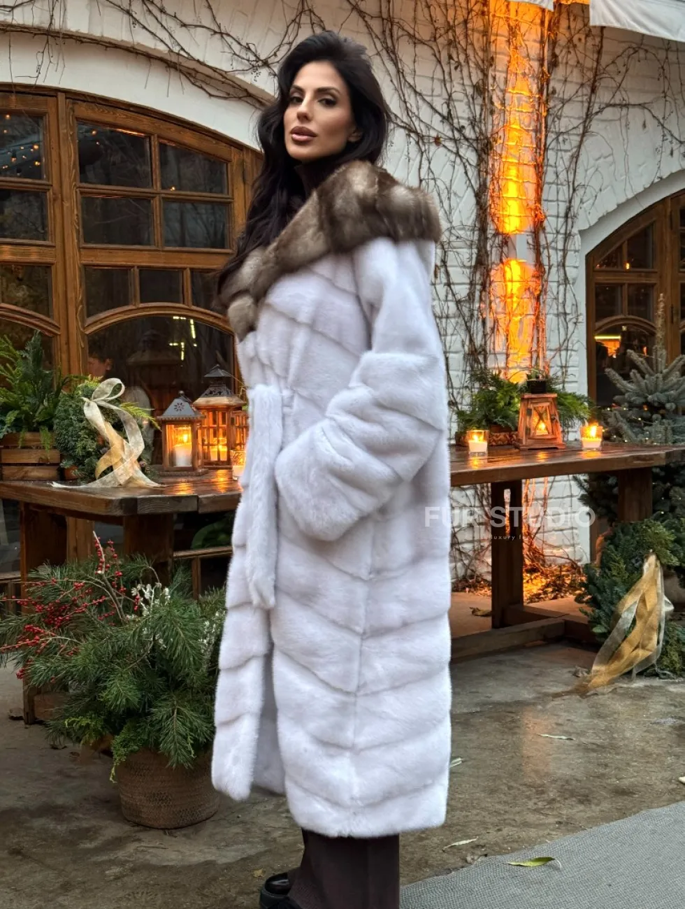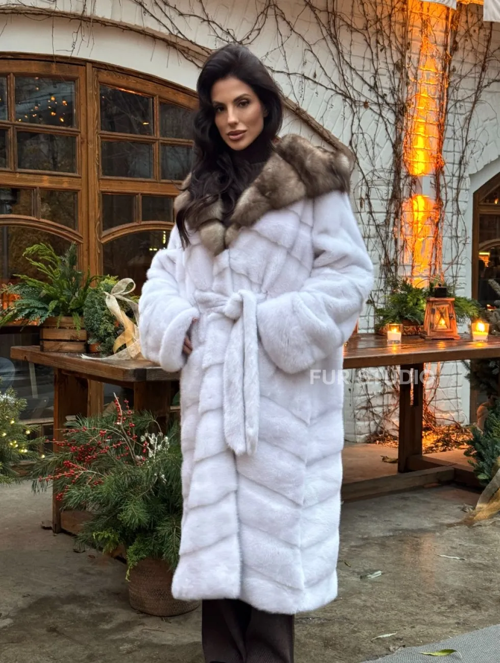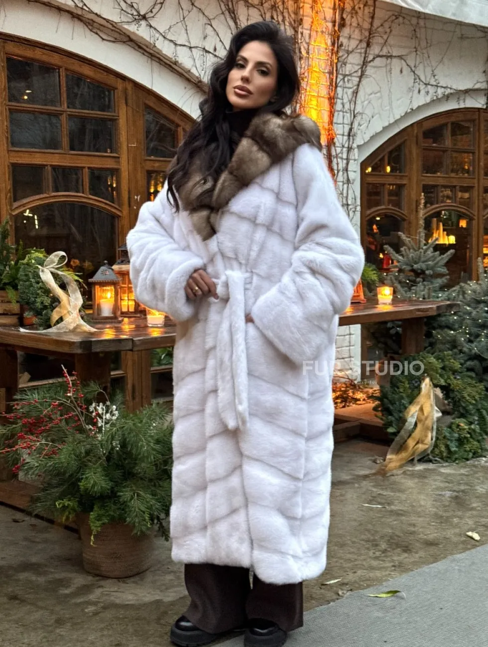 Длинная белая норковая шуба с капюшоном из натурального меха куницы "Каменка" доступна для покупки в нашем шоуруме Furs Studio в Чите. У нас так же есть доставка во все города России. Добавьте немного роскоши в свой гардероб с этой шубой, которая будет служить вам многие годы.