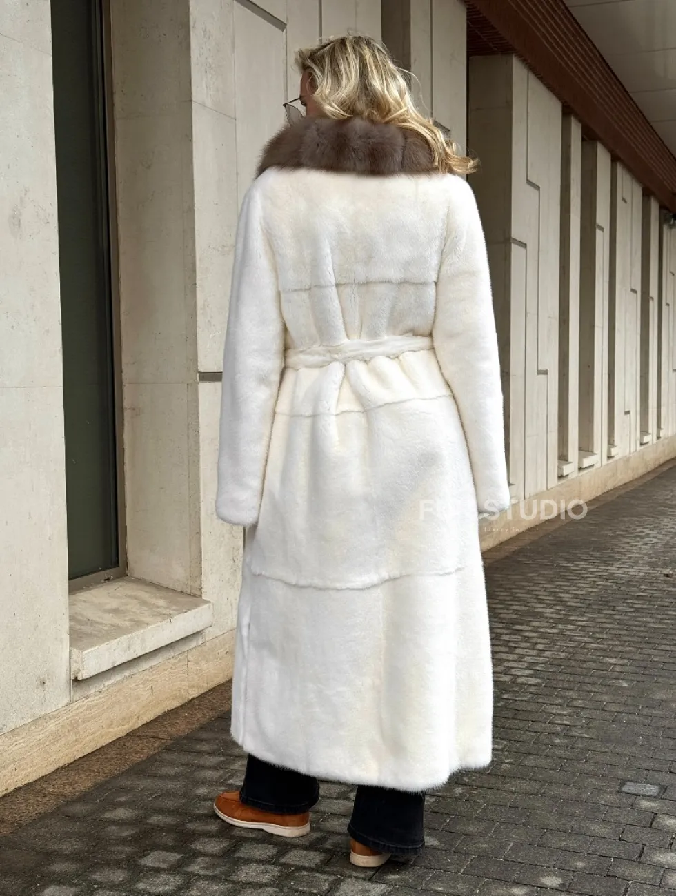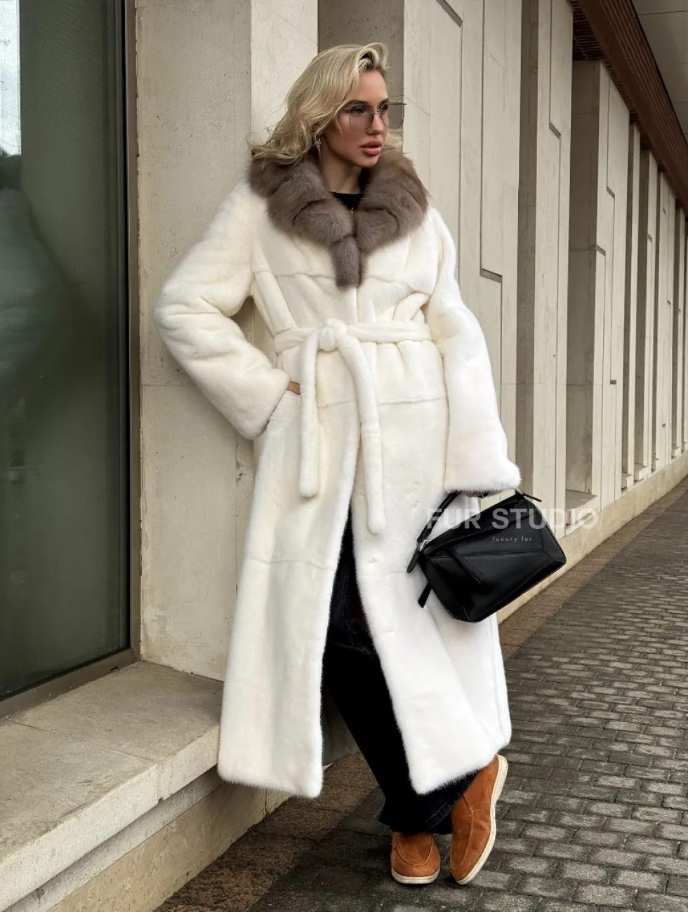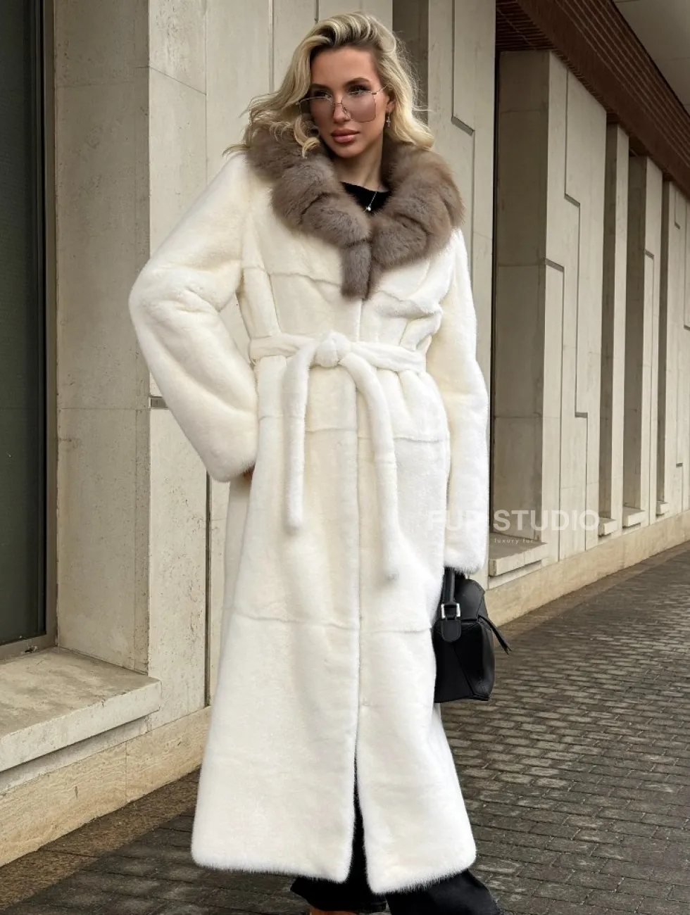 Длинная белая норковая шуба с воротником из меха куницы доступна для покупки в нашем шоуруме Furs Studio в Чите. У нас так же есть доставка во все города России. Добавьте немного роскоши в свой гардероб с этой шубой, которая будет служить вам многие годы.