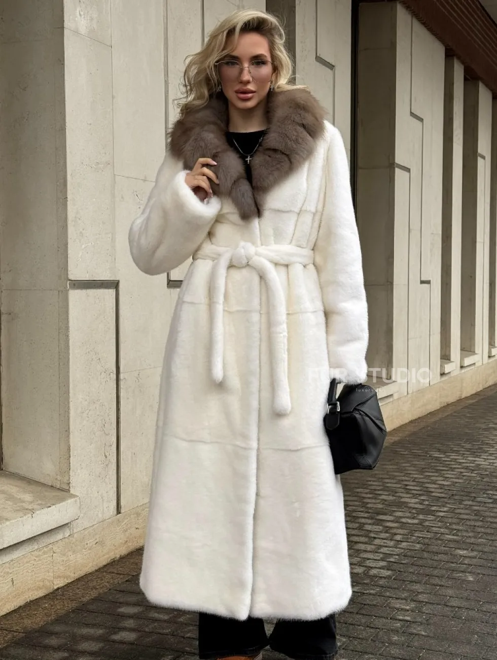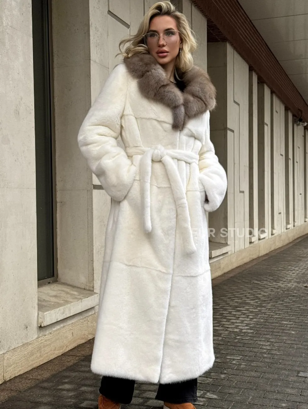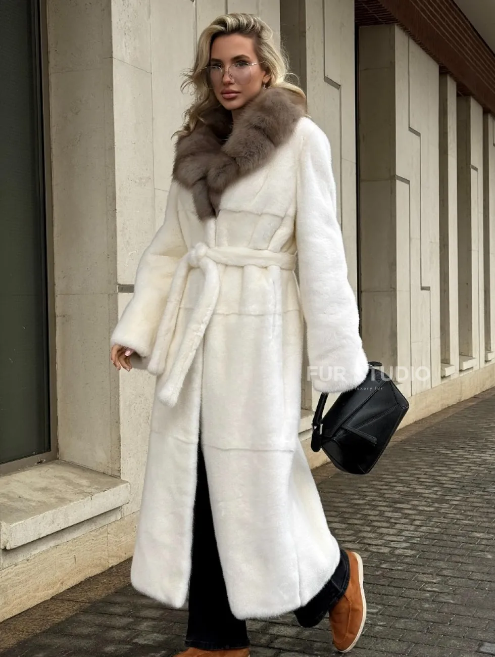 Длинная белая норковая шуба с воротником из меха куницы доступна для покупки в нашем шоуруме Furs Studio в Чите. У нас так же есть доставка во все города России. Добавьте немного роскоши в свой гардероб с этой шубой, которая будет служить вам многие годы.