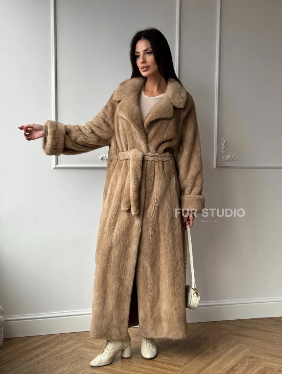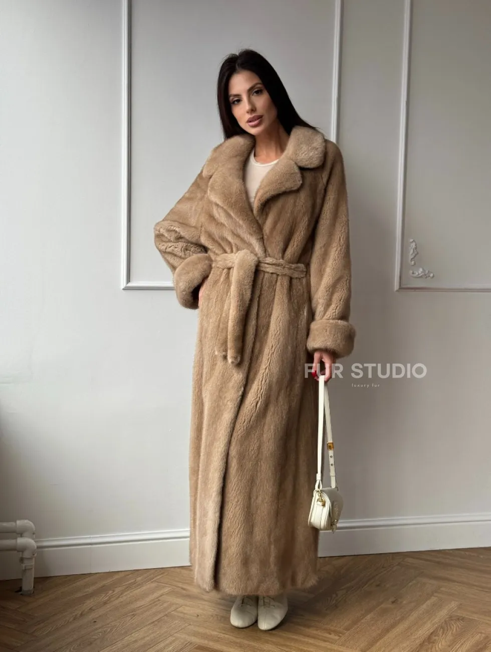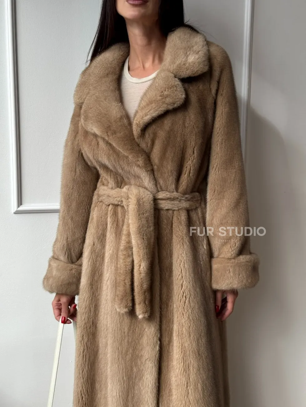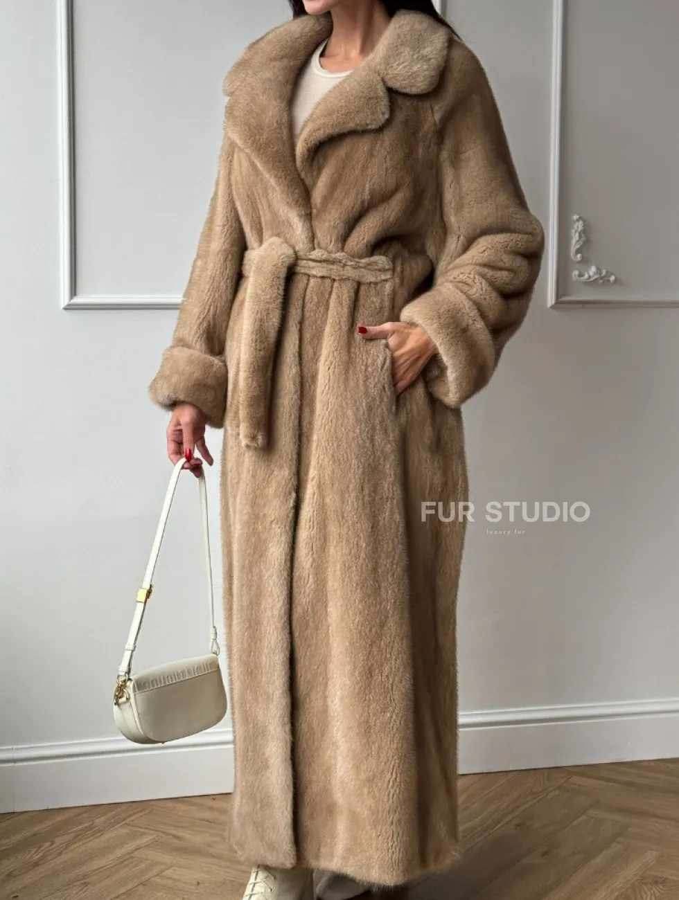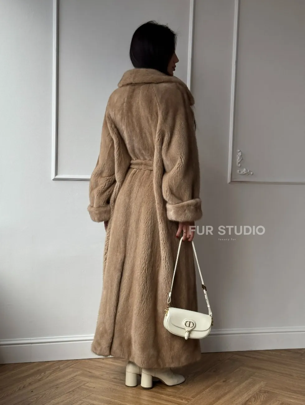 Мех данной шубы скандинавская норка, цвет бежевый. Предлагается в размерах от 42 до 52. Длина модели 125-130 см, что выгодно подчеркивает фигуру девушек. Эта модель идеально подойдет для девушек и женщин, предпочитающих роскошные натуральные меха.