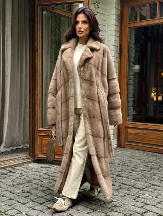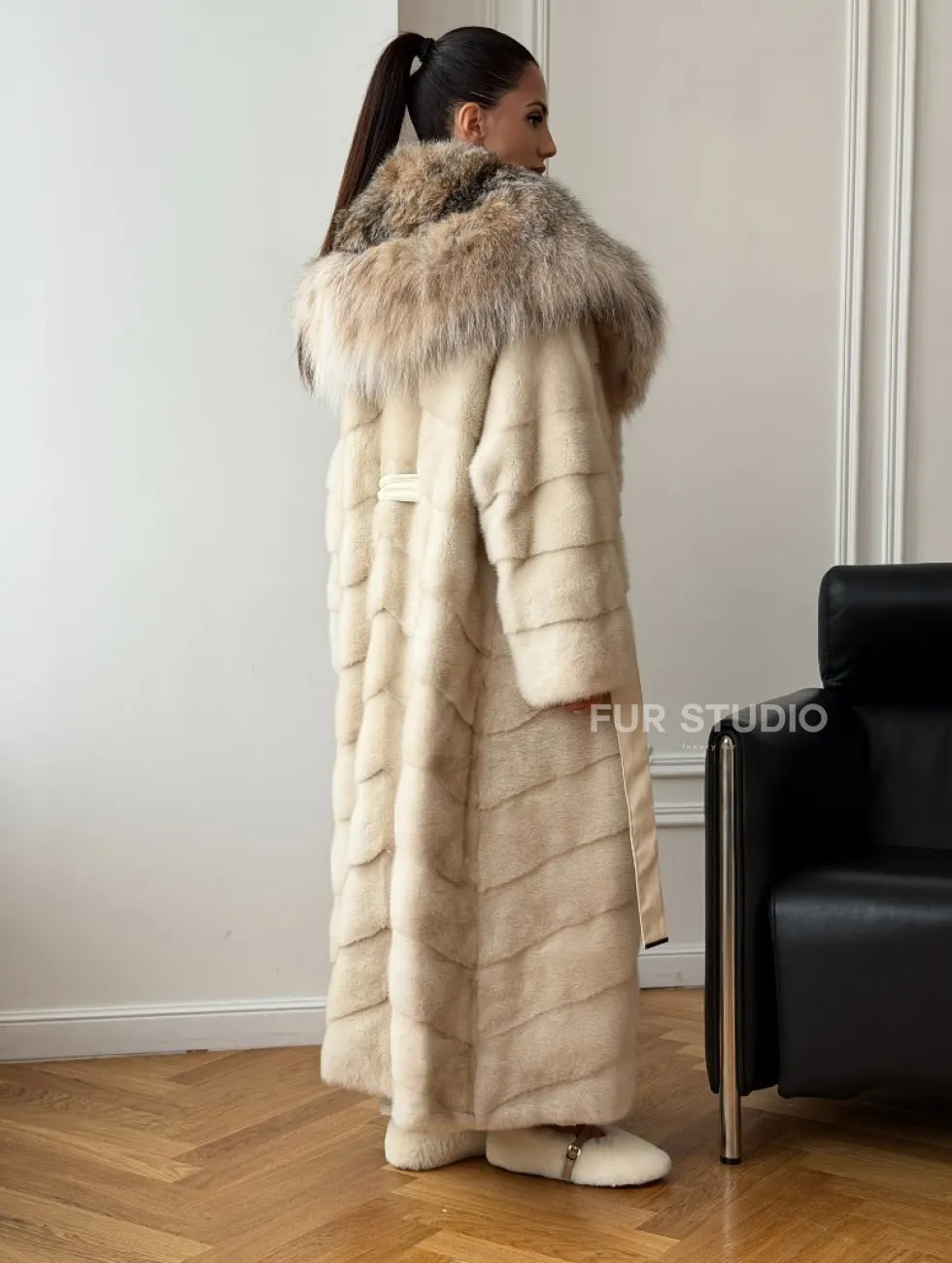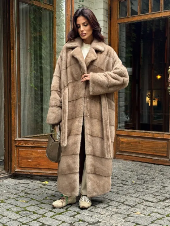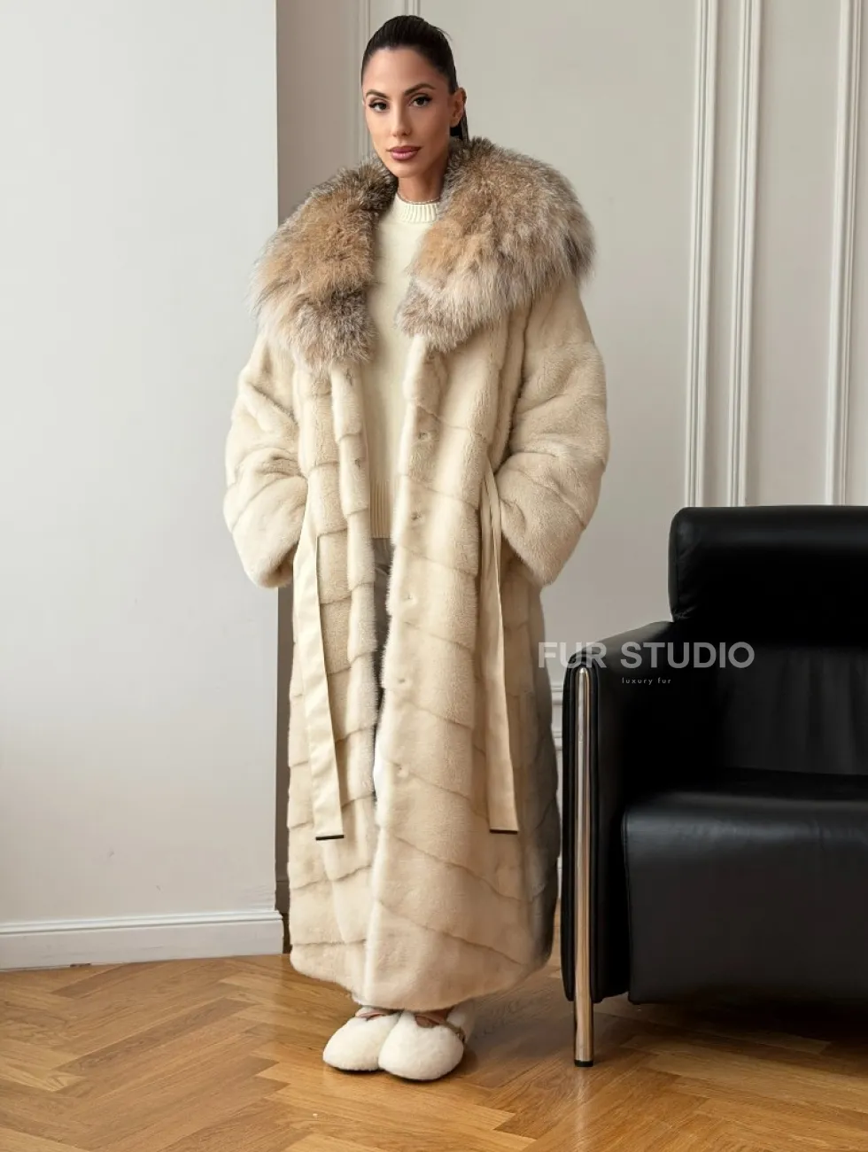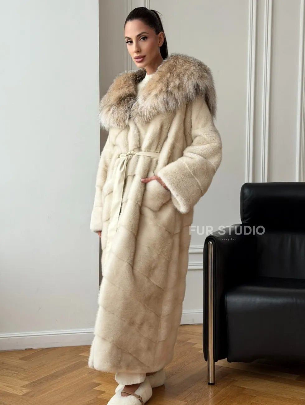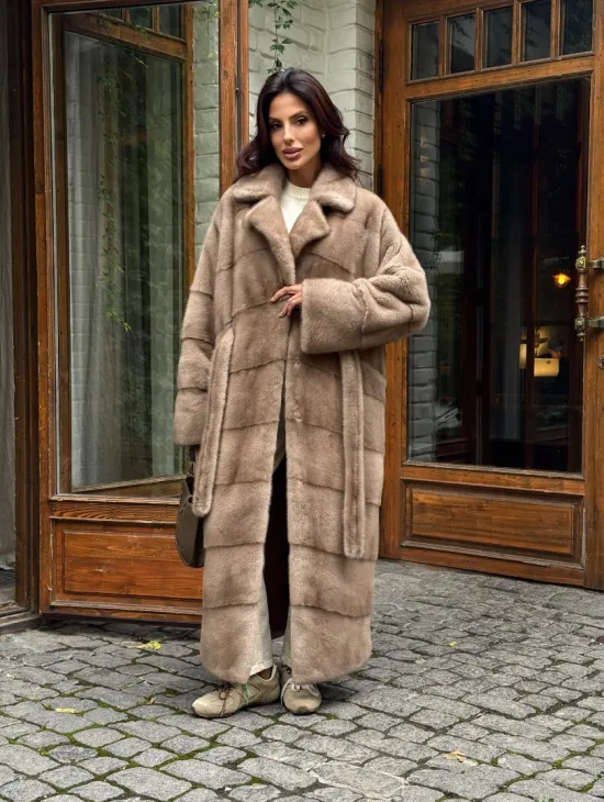 Мех данной шубы аукционная норка, цвет бежевый. Предлагается в размерах от 42 до 52. Длина модели 125-130 см, что выгодно подчеркивает фигуру девушек. Эта модель идеально подойдет для девушек и женщин, предпочитающих роскошные натуральные меха.