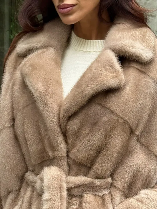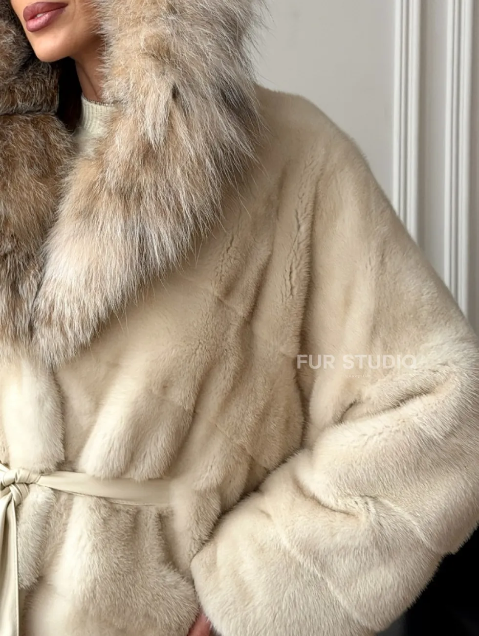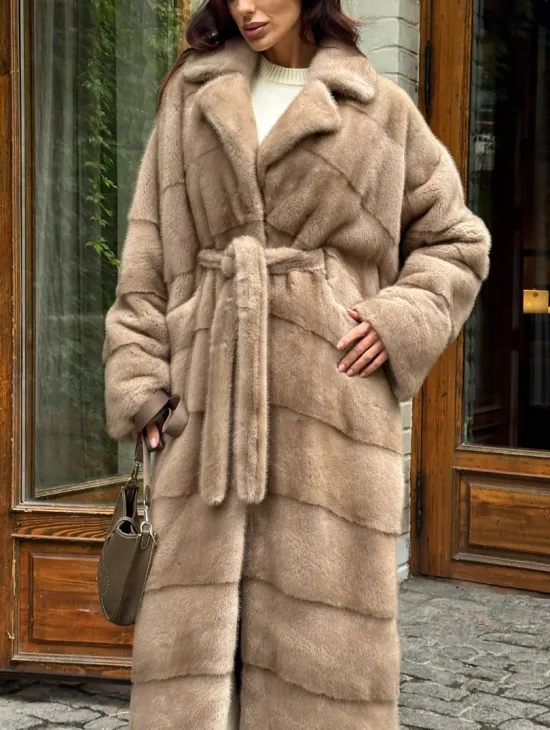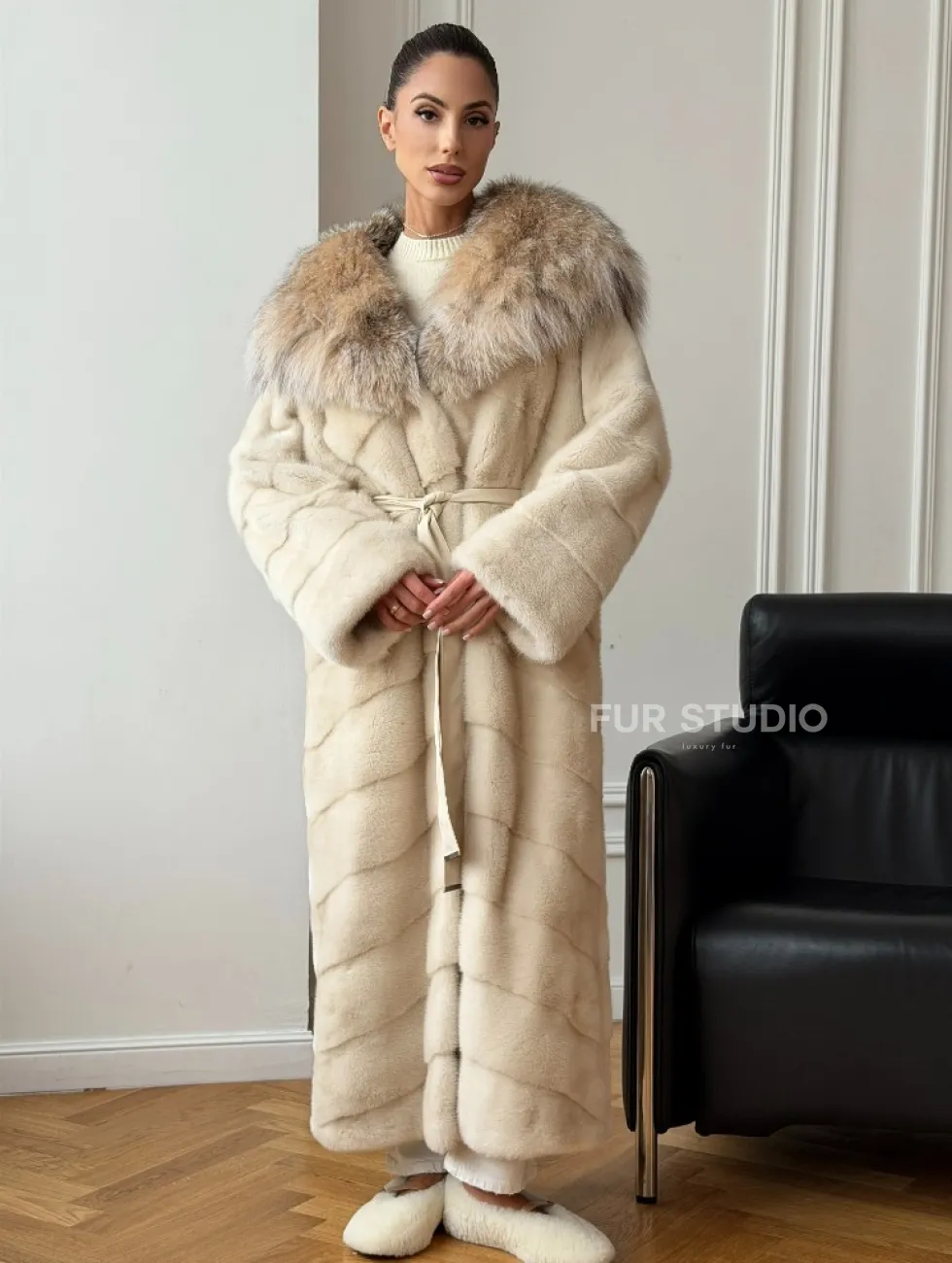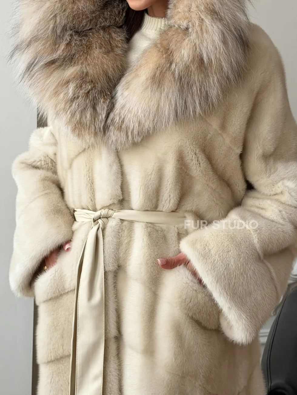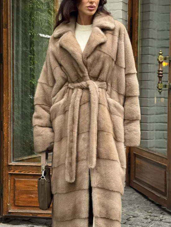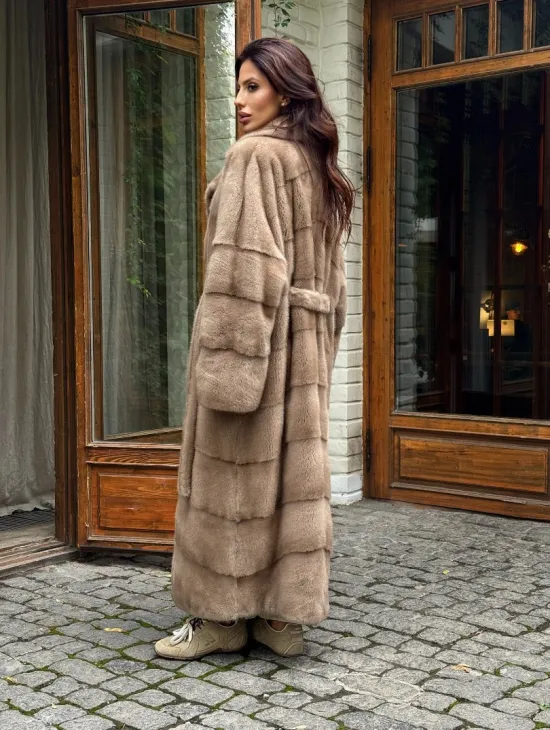 Мех данной шубы аукционная норка, цвет бежевый. Предлагается в размерах от 42 до 52. Длина модели 125-130 см, что выгодно подчеркивает фигуру девушек. Эта модель идеально подойдет для девушек и женщин, предпочитающих роскошные натуральные меха.