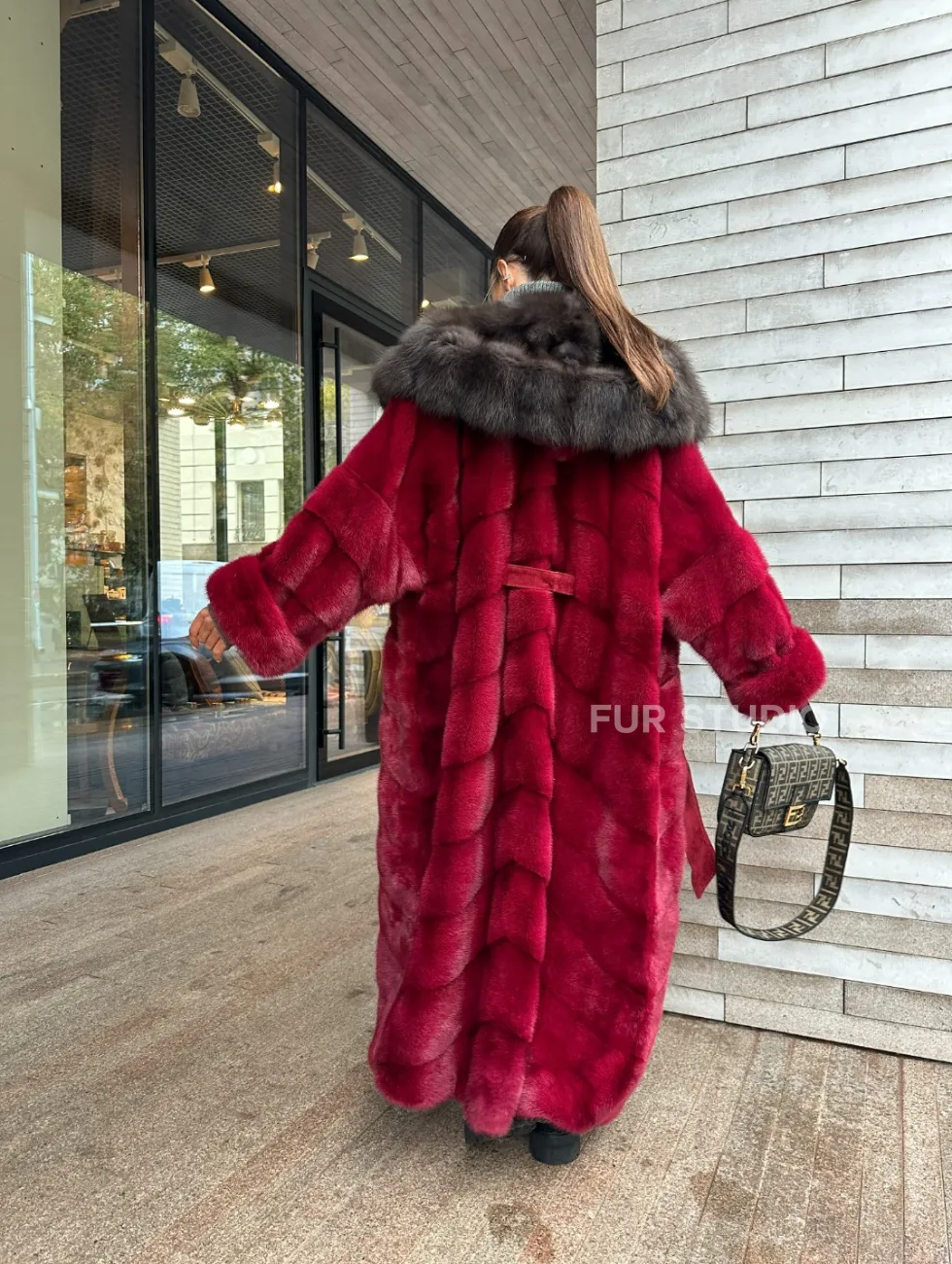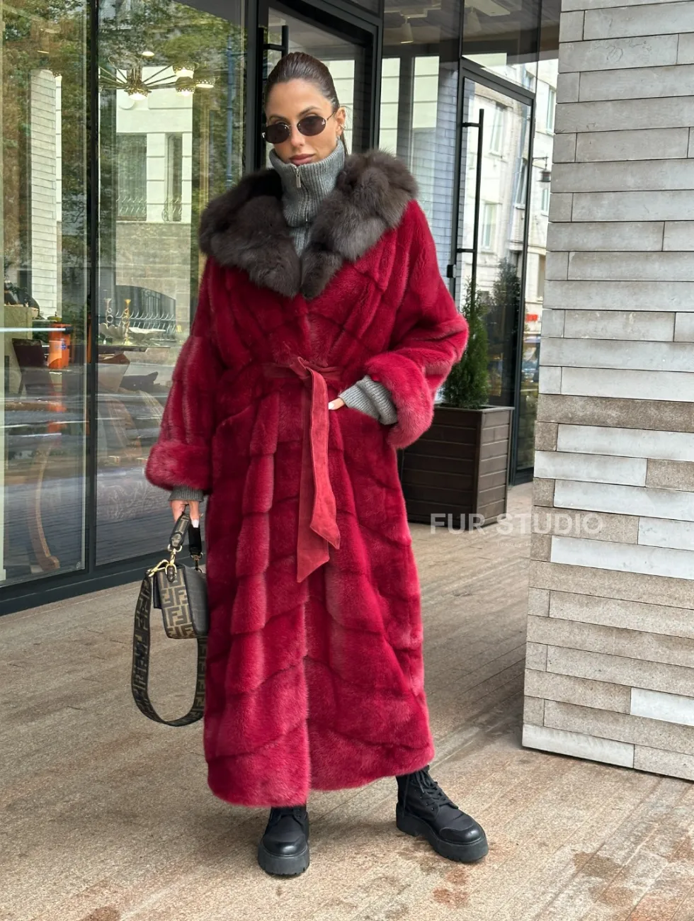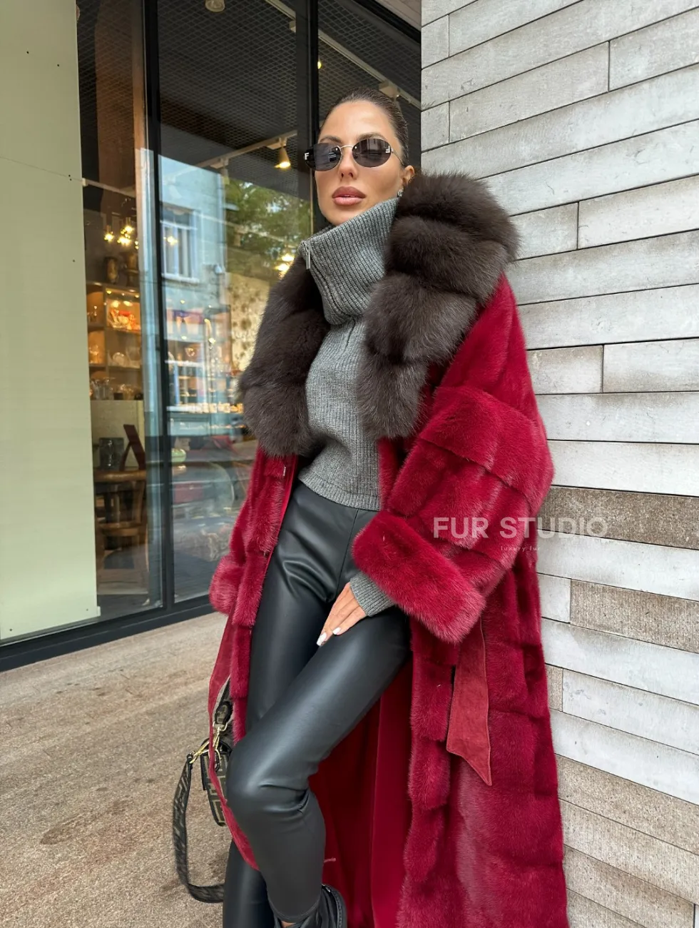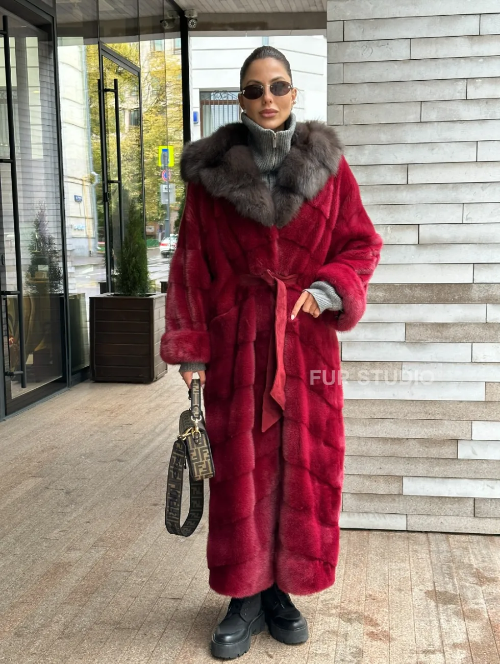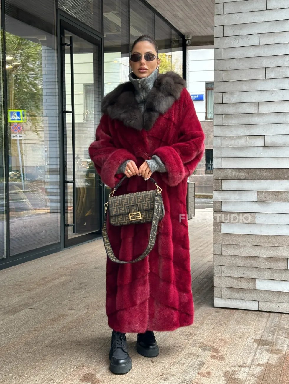Мех данной шубы аукционная норка, цвет бордовый. Предлагается в размерах от 40 до 50. Длина модели 125-130 см, что выгодно подчеркивает фигуру девушек. Эта модель идеально подойдет для девушек и женщин, предпочитающих роскошные натуральные меха.